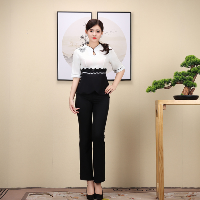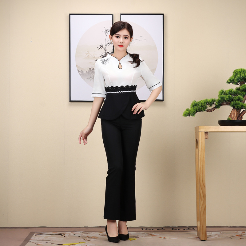 新款古风茶艺女足浴美容技师工作服养生会所短袖足疗按摩套装批发