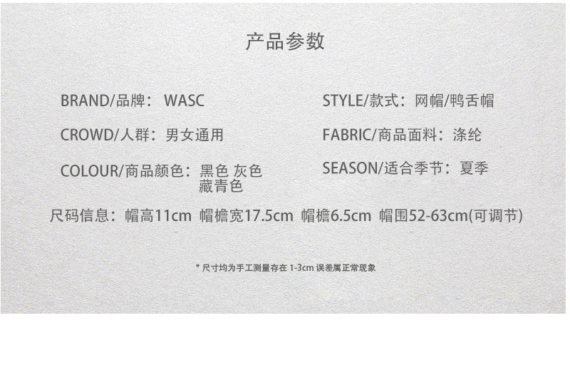 wasc夏季新款户外鸭舌帽防晒网面速干棒球帽休闲字母刺绣运动帽女