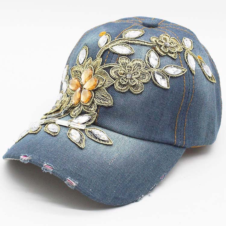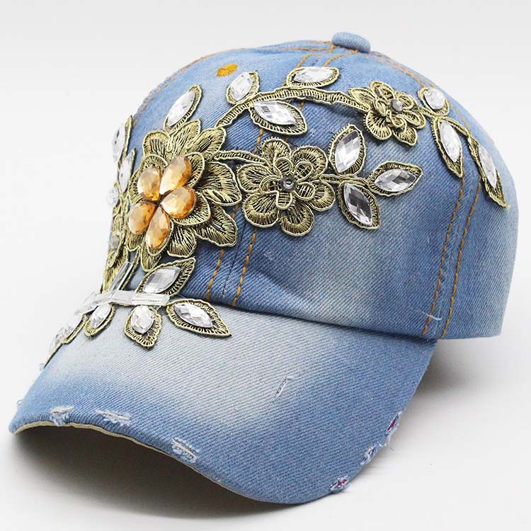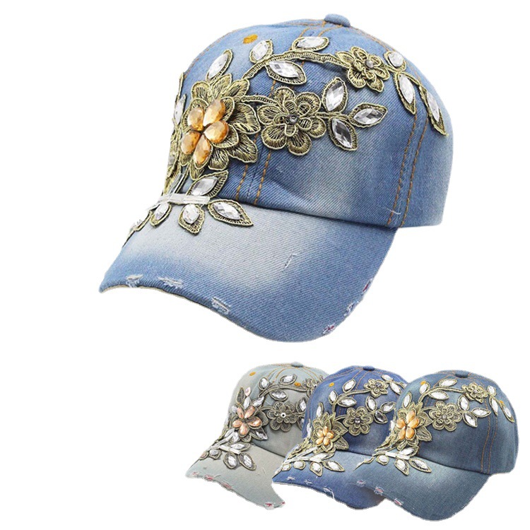 韩版潮帽新款秋冬季花朵棒球帽女士贴钻鸭舌帽 牛仔磨边帽子批发