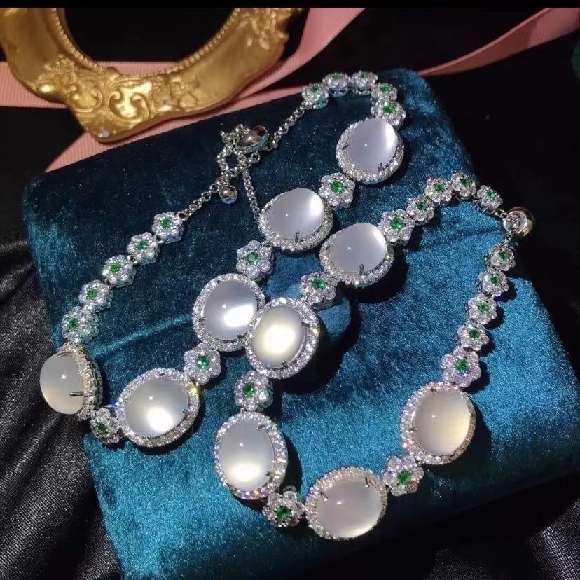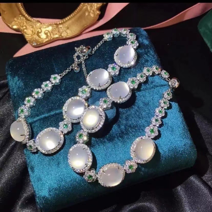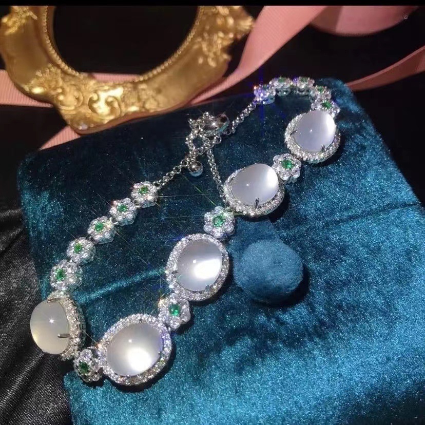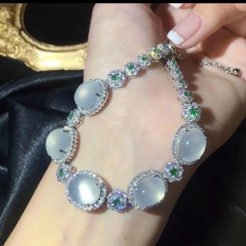 天然宝石镀银镶嵌高冰玉手链髓满钻粉玛瑙白玉髓玉石女款手链