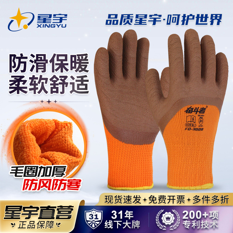 正品星宇手套劳保防寒毛圈拉绒保暖半浸耐磨防滑加厚工作防护手套