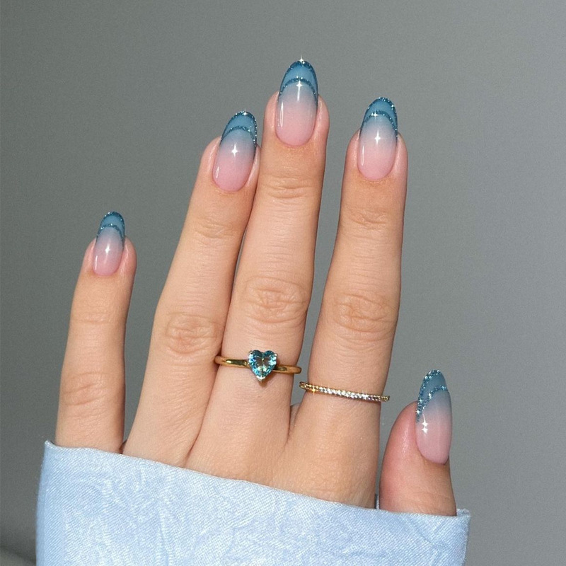 外贸穿戴甲定制中长款蓝绿色条纹轻奢美甲甲片成品小清新指甲贴片
