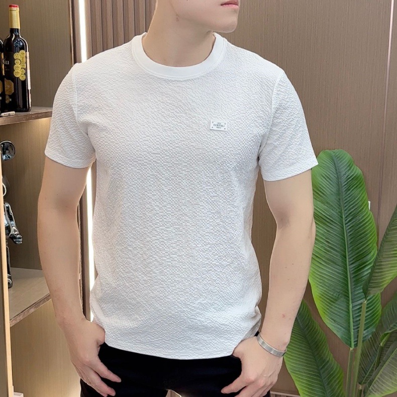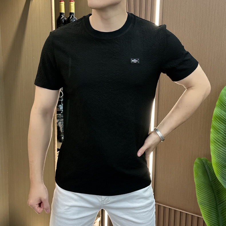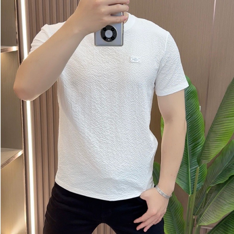 设计师款夏季泡泡纱肌理感绣标圆领男士短袖时尚半袖百搭轻奢舒适