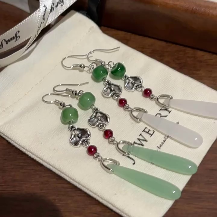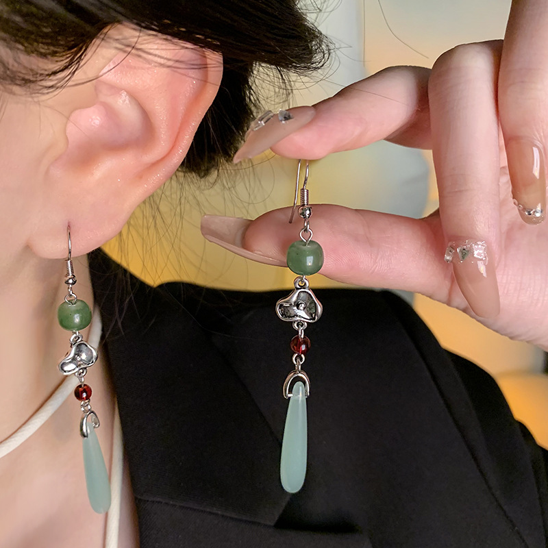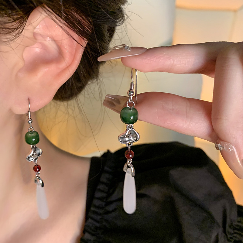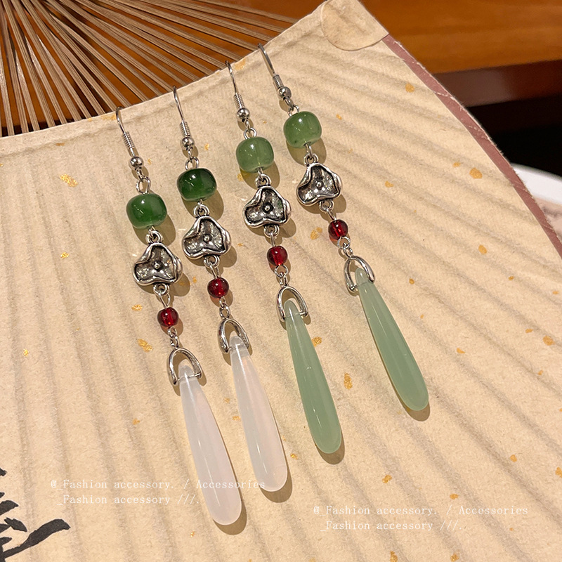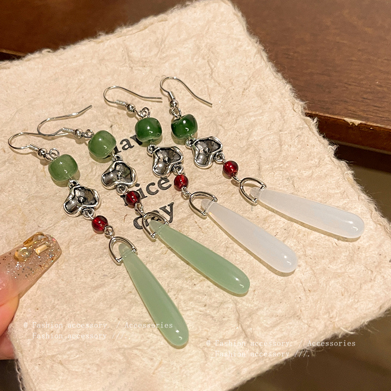 饰品小众高级感长款流苏旗袍耳环网红耳饰复古仿玉髓耳钉女批发