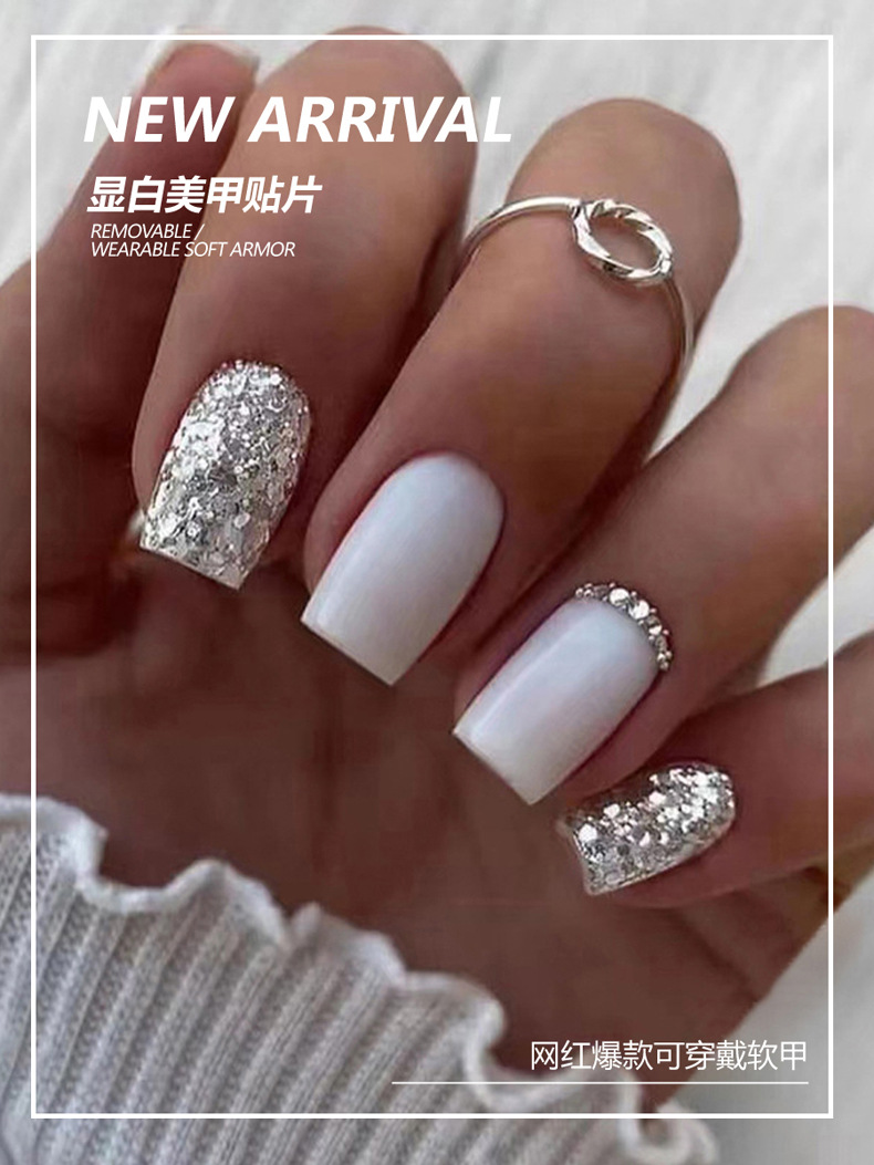 欧美新款穿戴甲短款奶白色闪粉简约美甲成品指甲贴片网红甲片定制