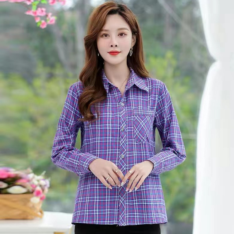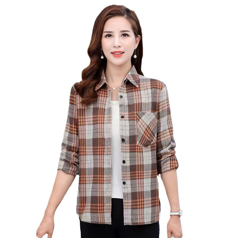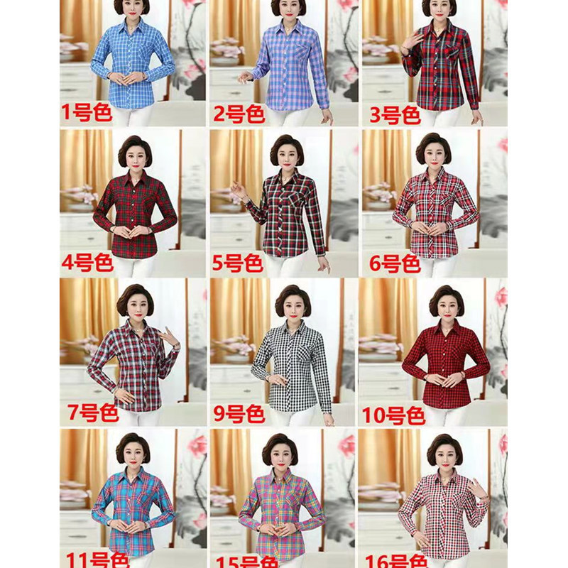 春夏女装格子衬衫女式长袖新款中年妈妈大码格子百搭时尚修身衬衣