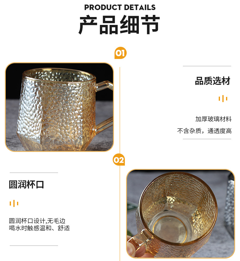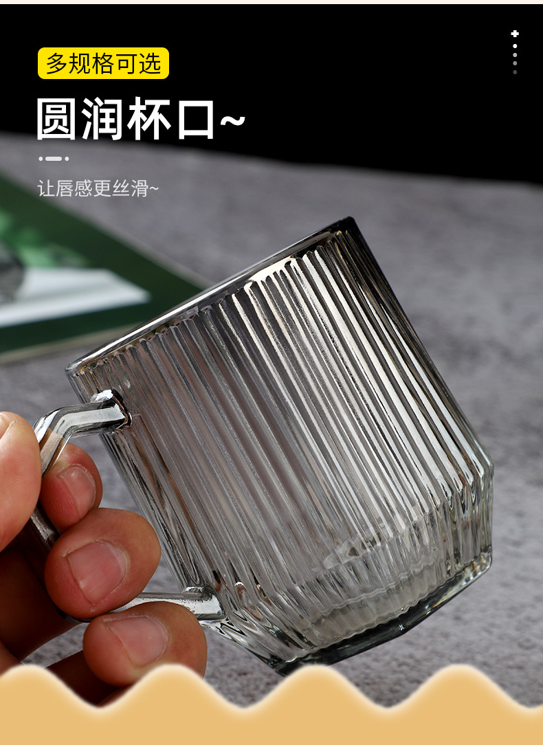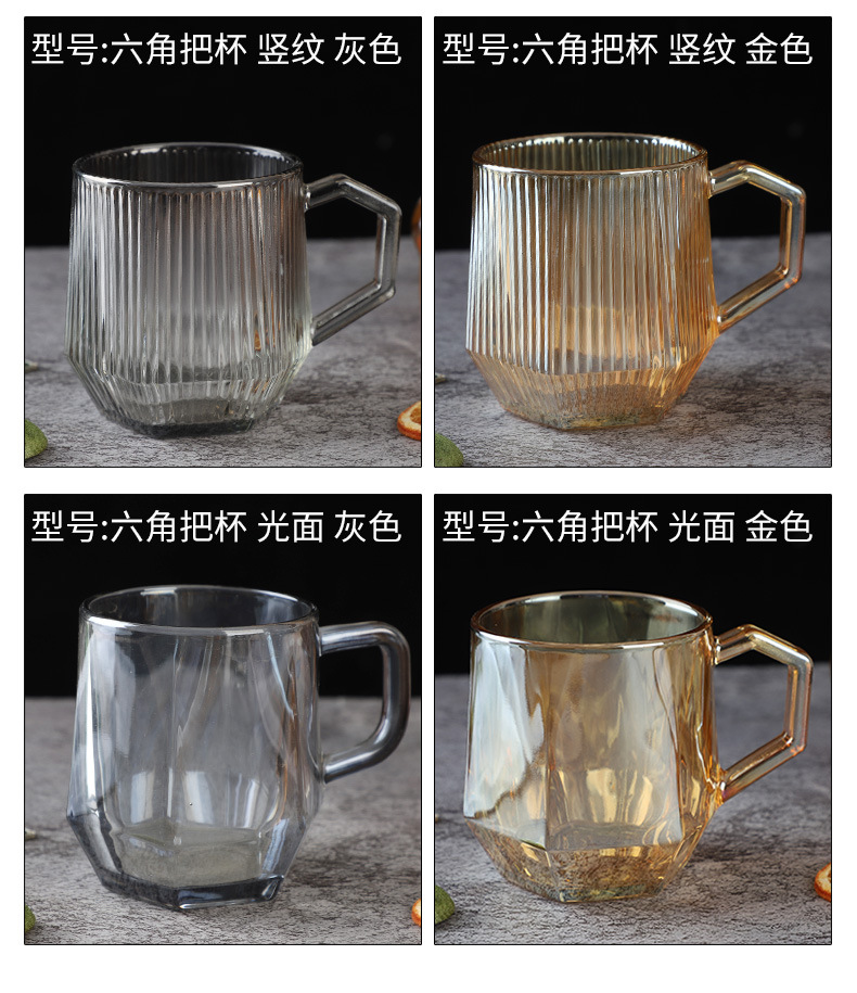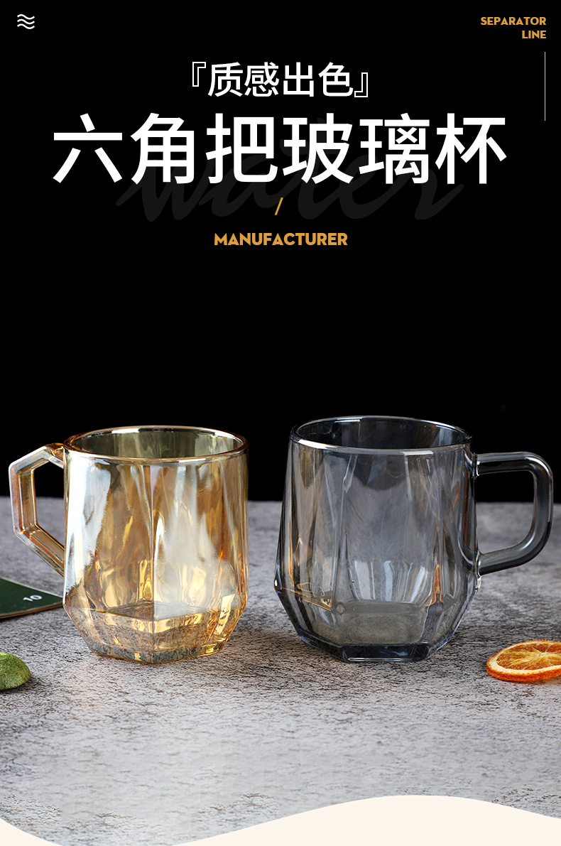 六角把玻璃杯外贸批发轻奢六角杯纹理玻璃杯 居家套装六角把杯