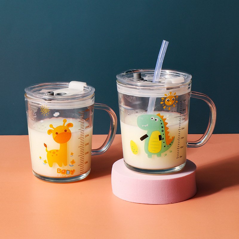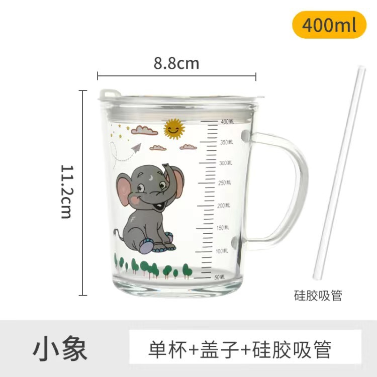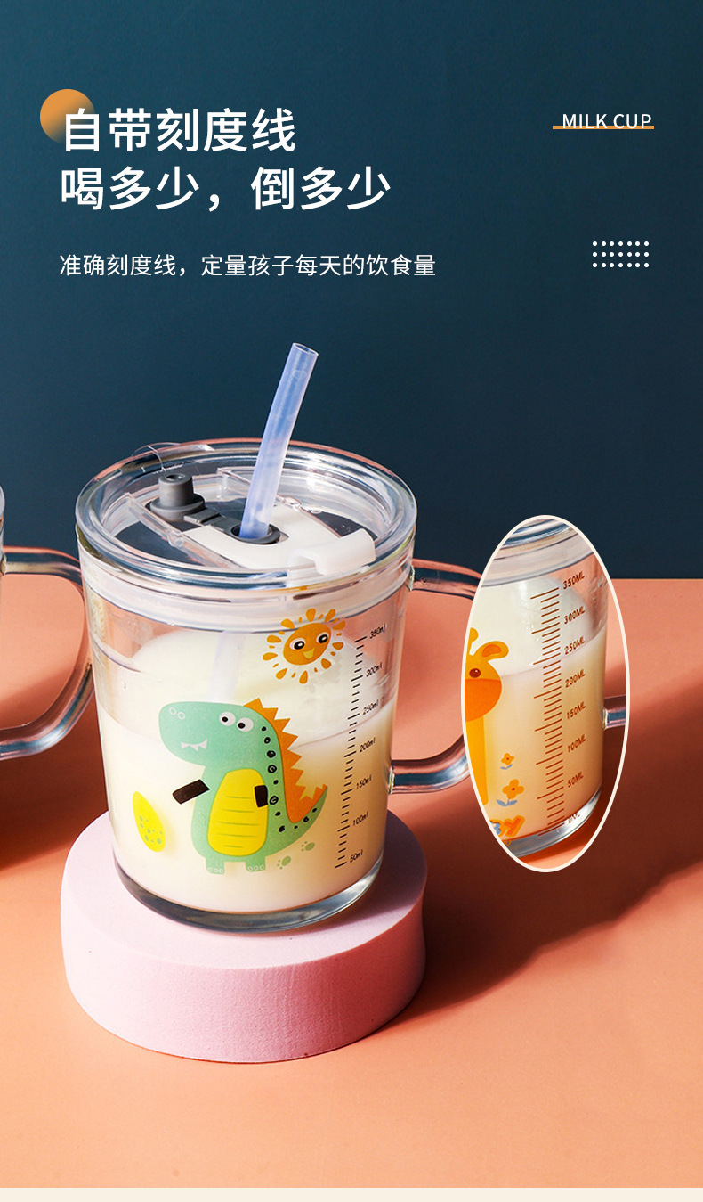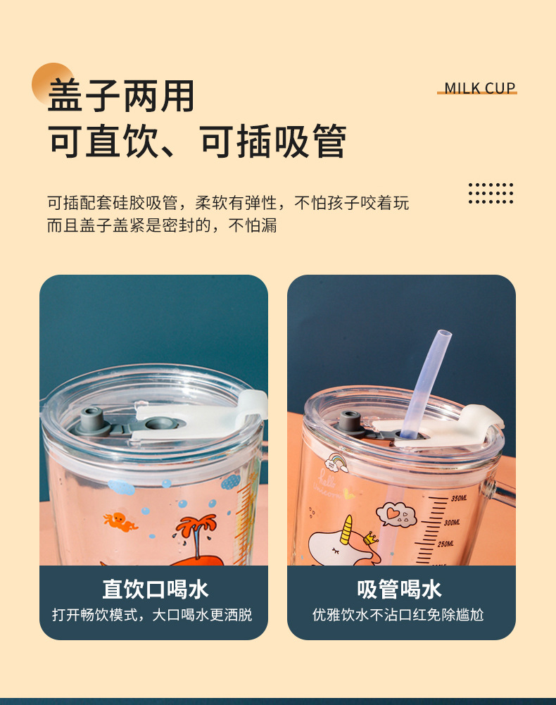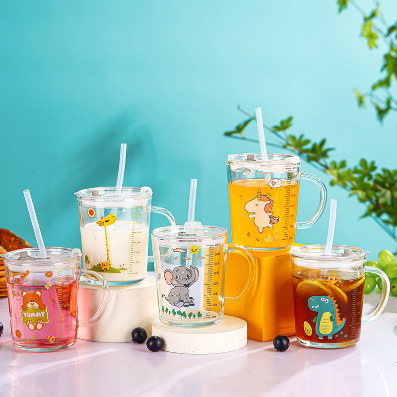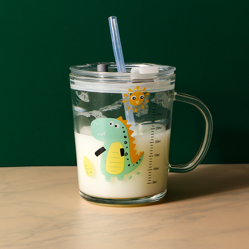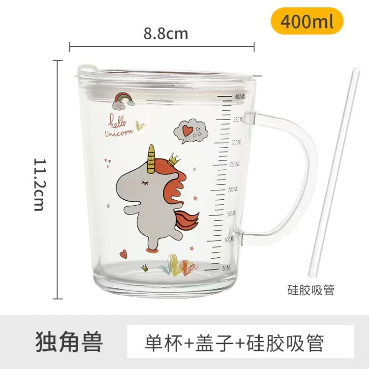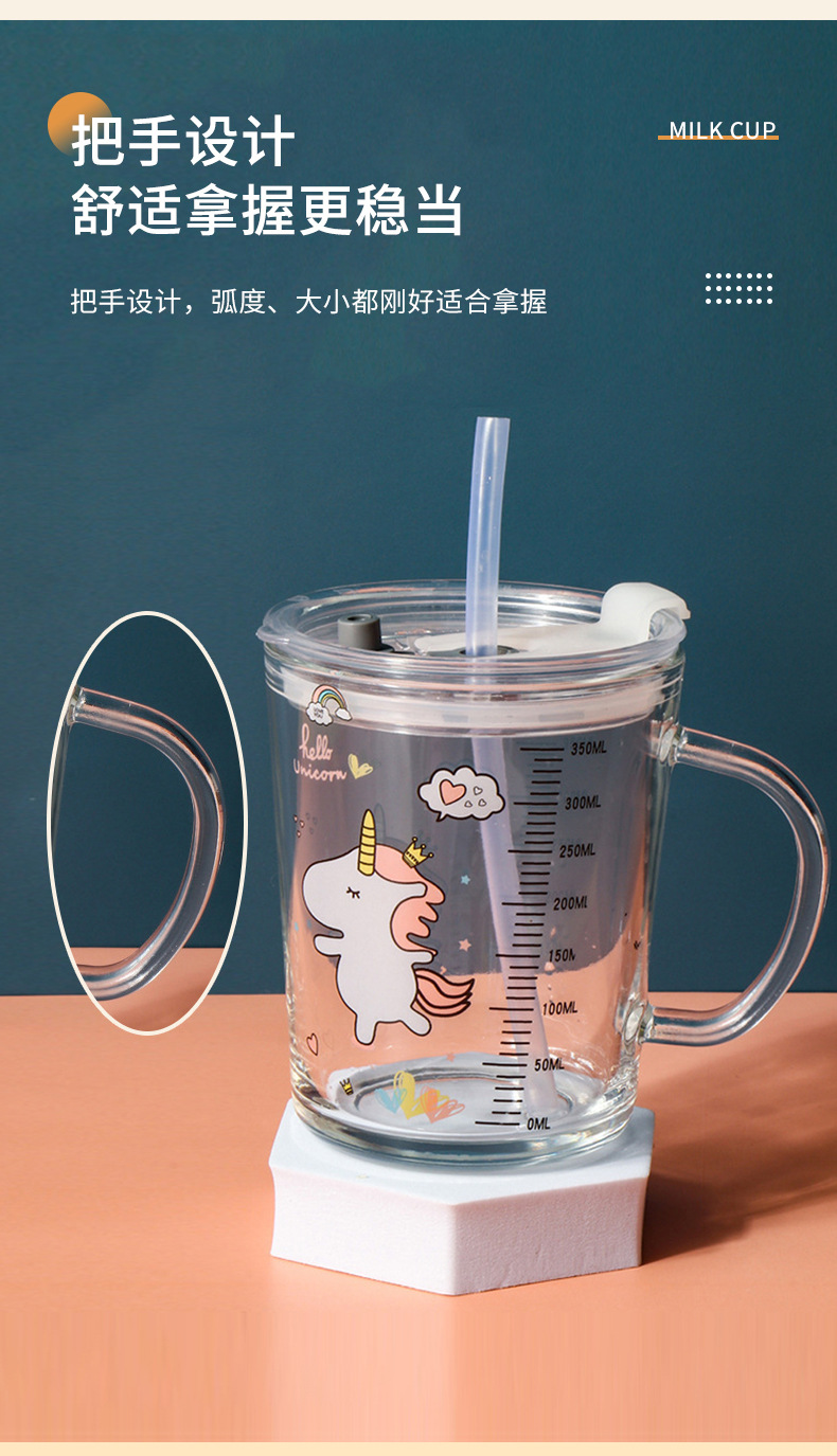 卡通创意带刻度饮水杯家用 防摔带盖三件套早餐吸管杯玻璃牛奶杯