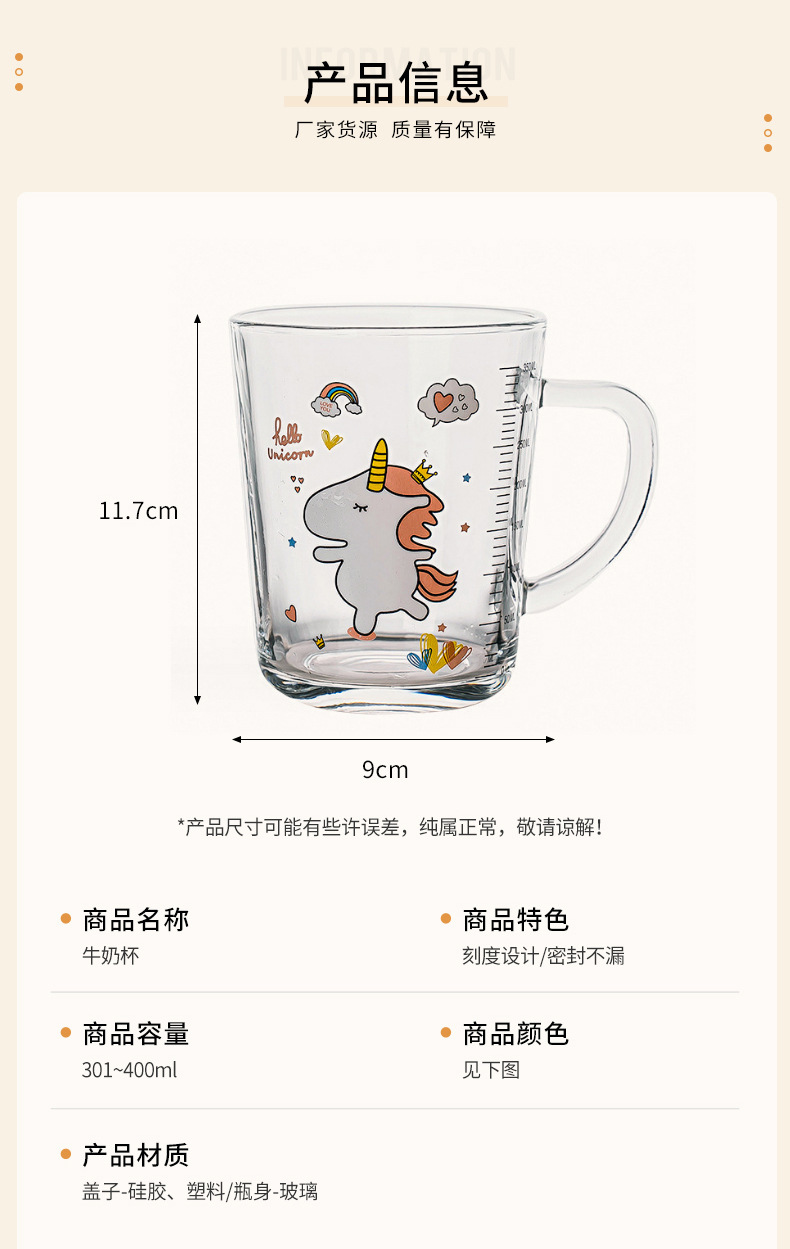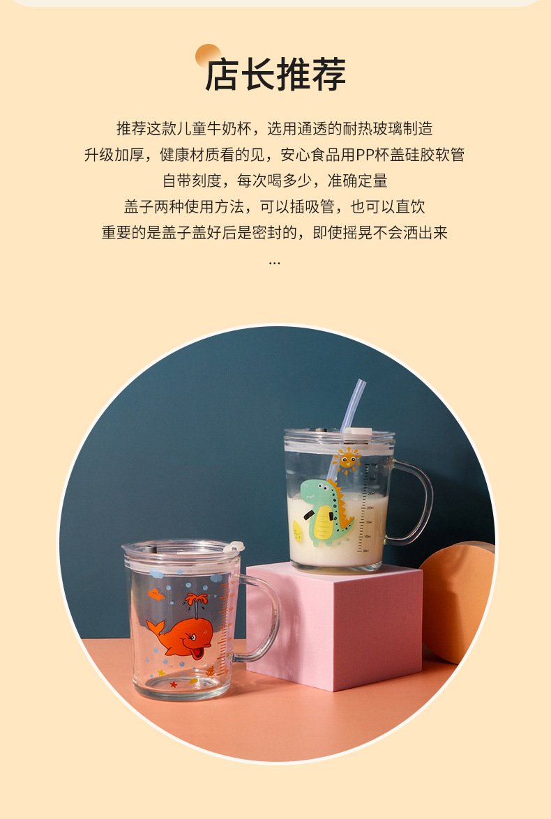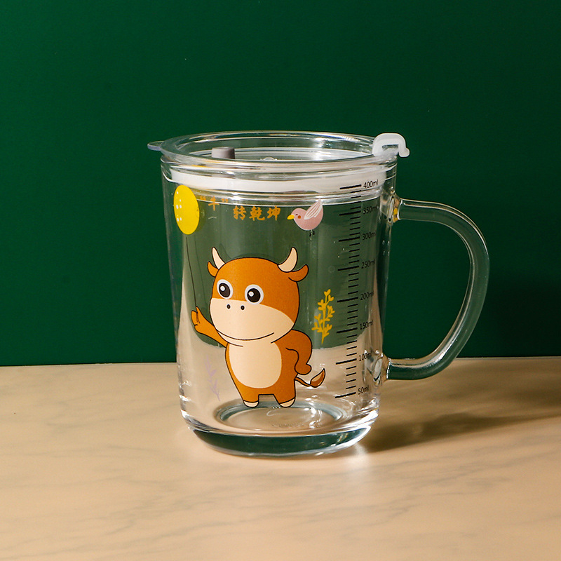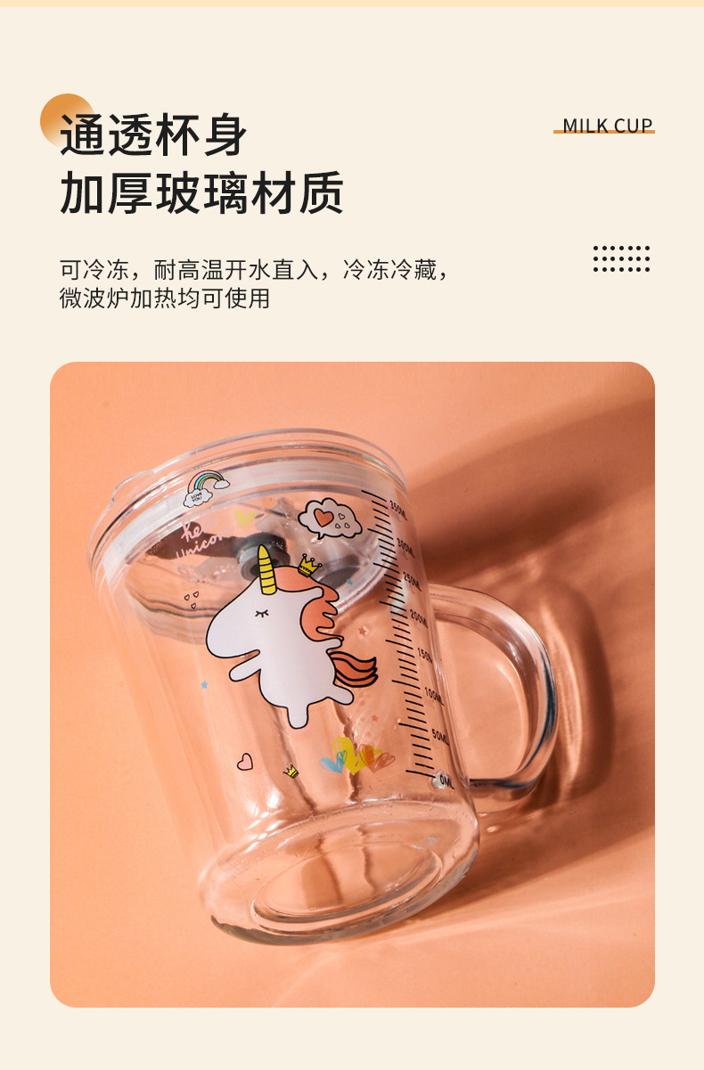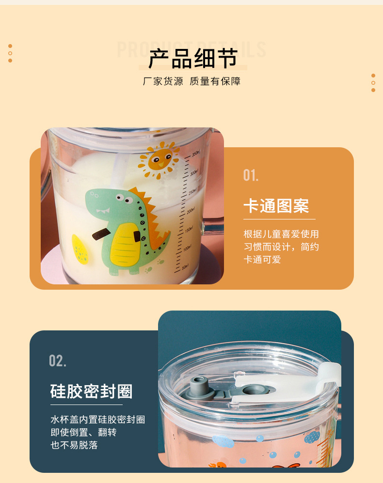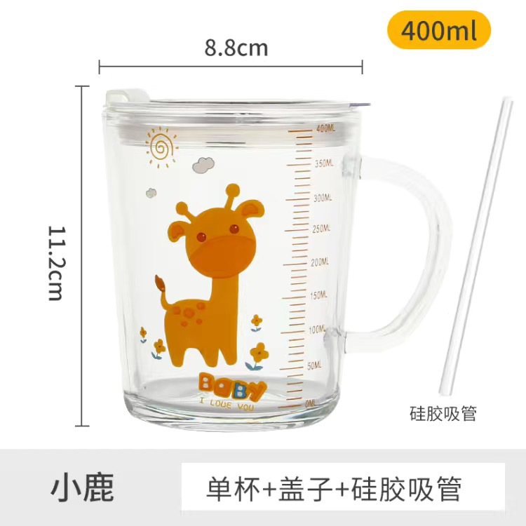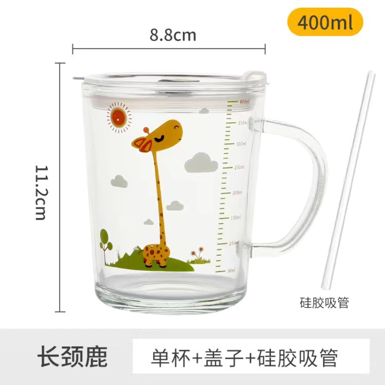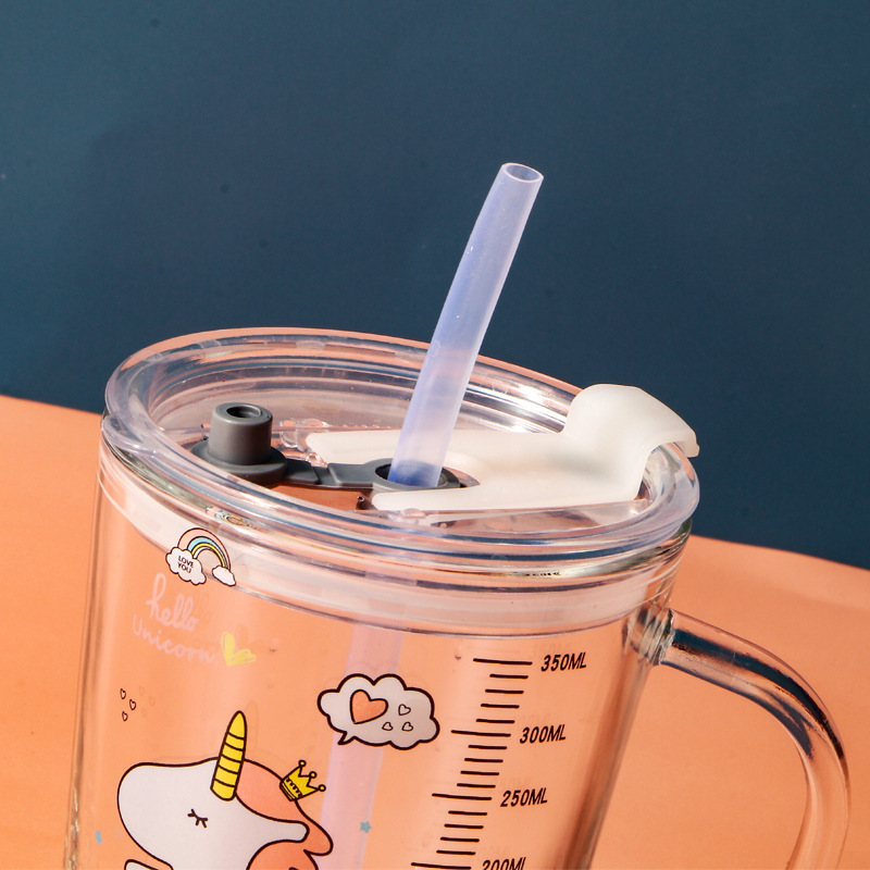 卡通创意带刻度饮水杯家用 防摔带盖三件套早餐吸管杯玻璃牛奶杯