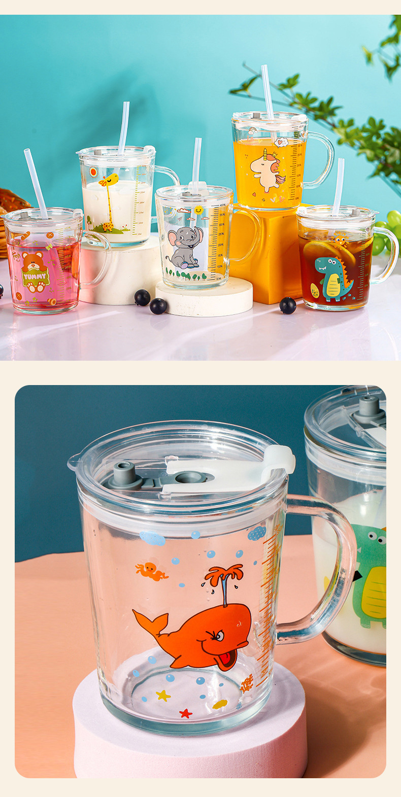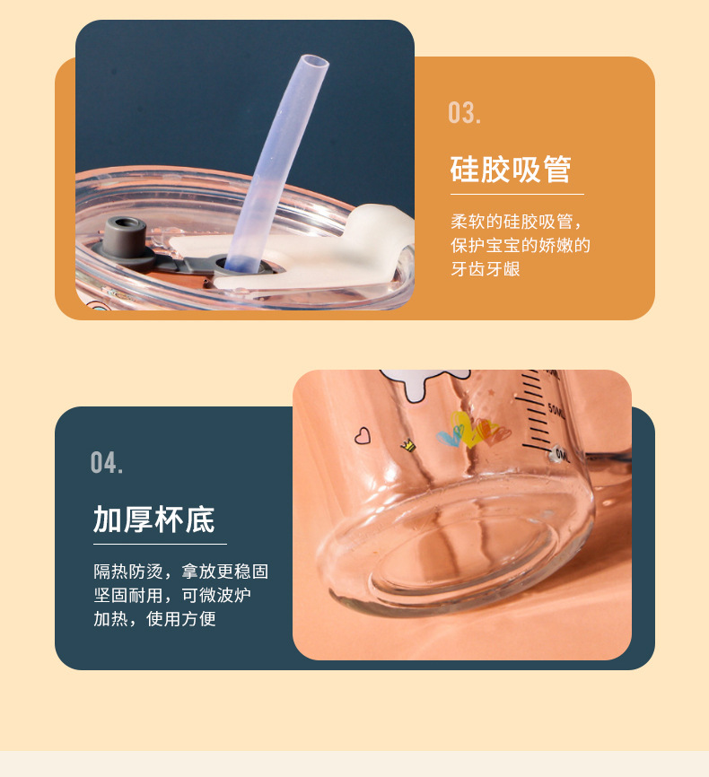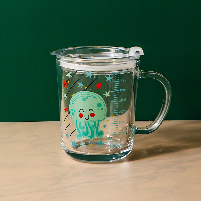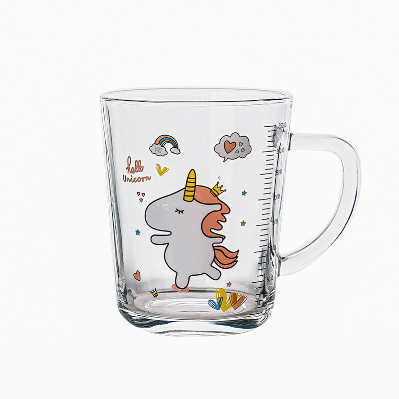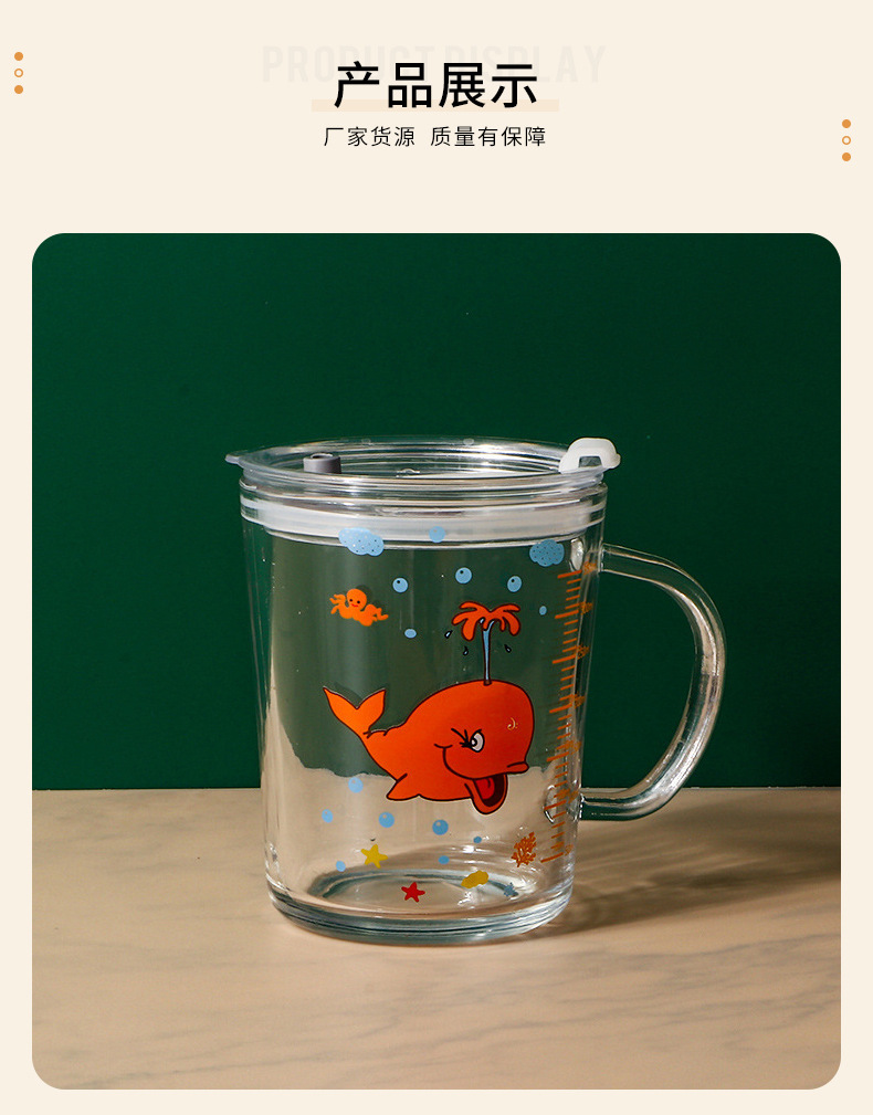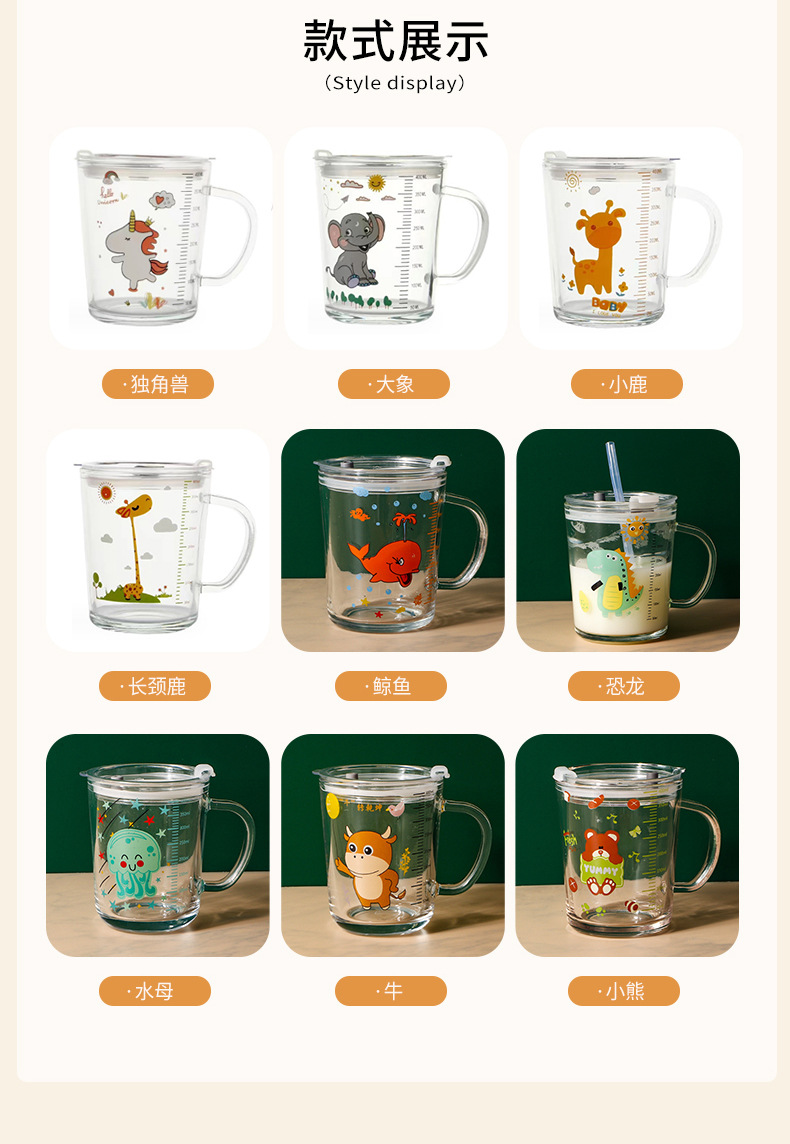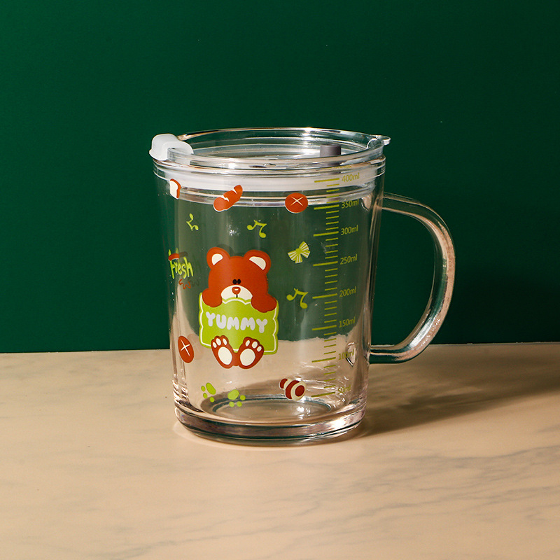 卡通创意带刻度饮水杯家用 防摔带盖三件套早餐吸管杯玻璃牛奶杯