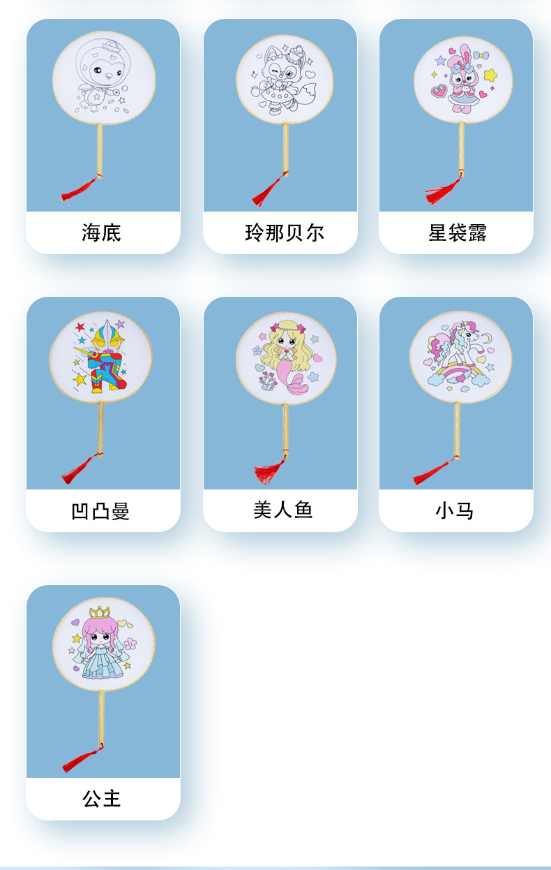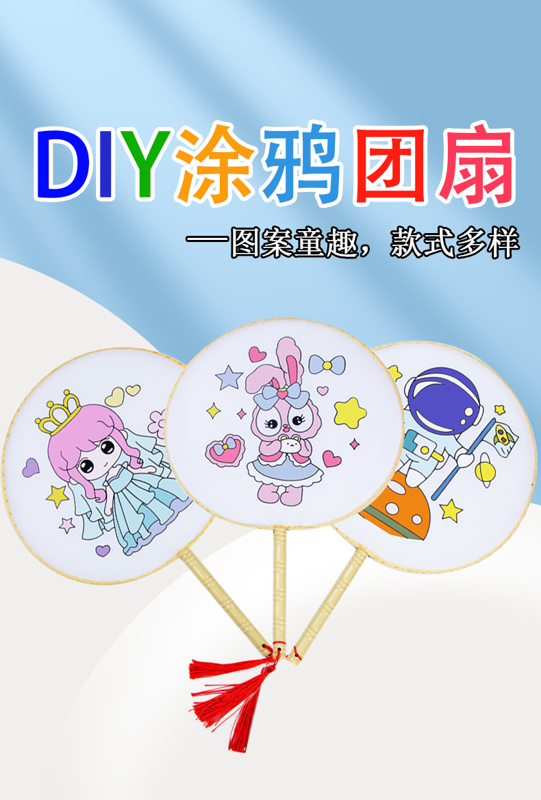 儿童涂鸦彩绘扇子diy 幼教绘画圆形宫廷扇 卡通图案填色团扇地摊