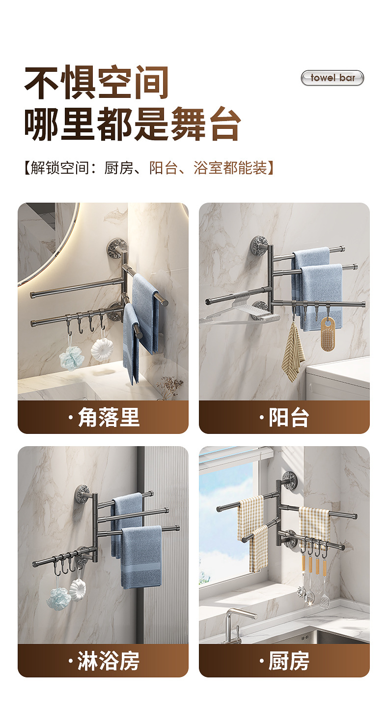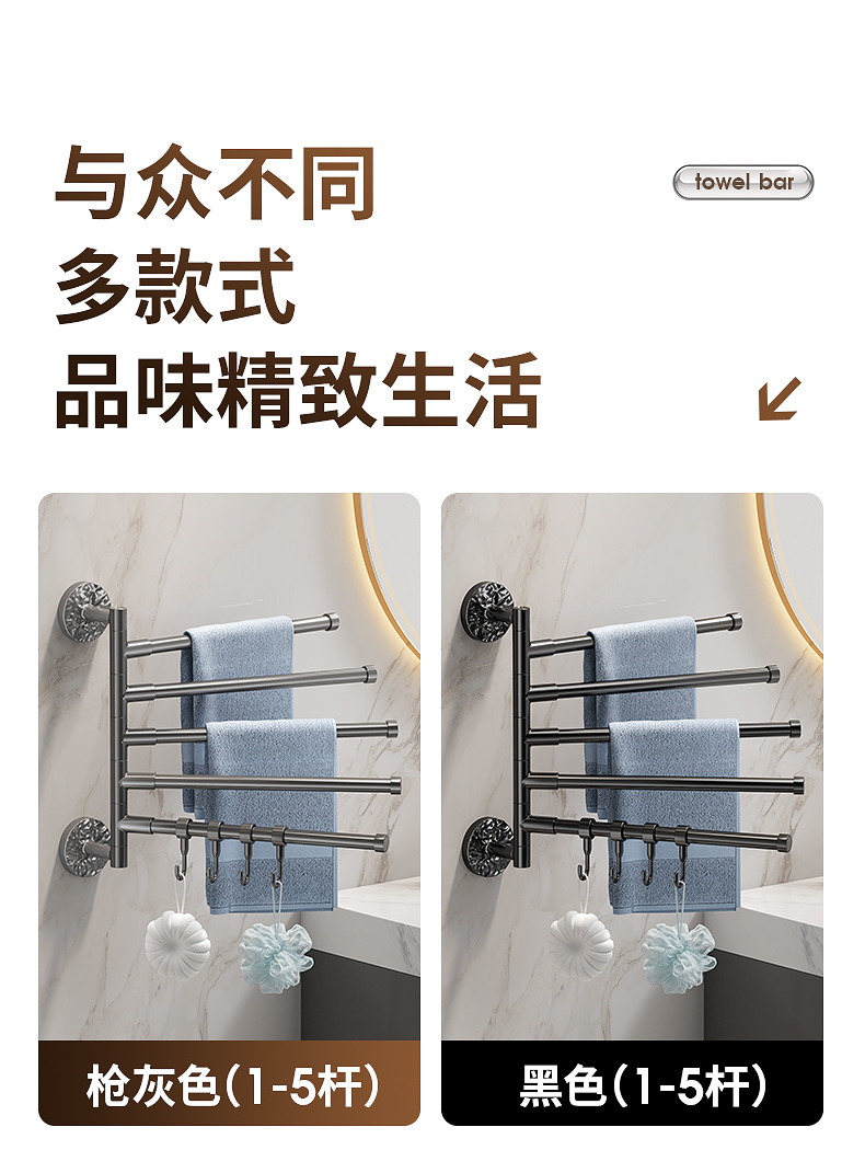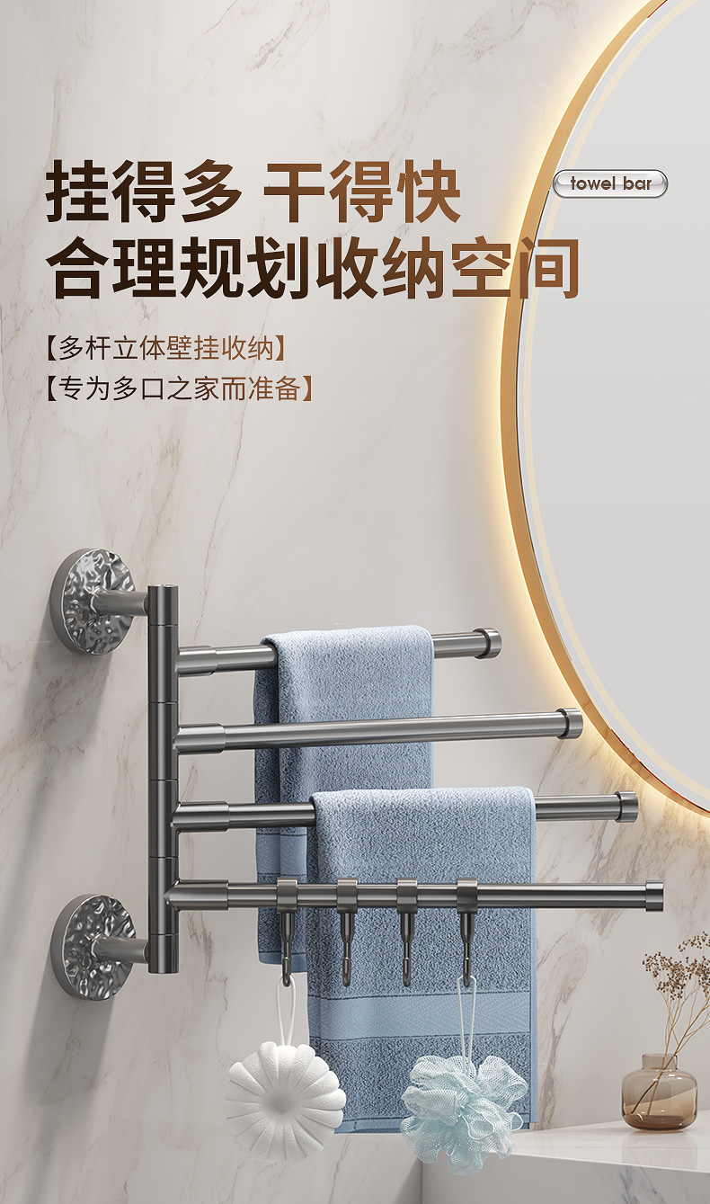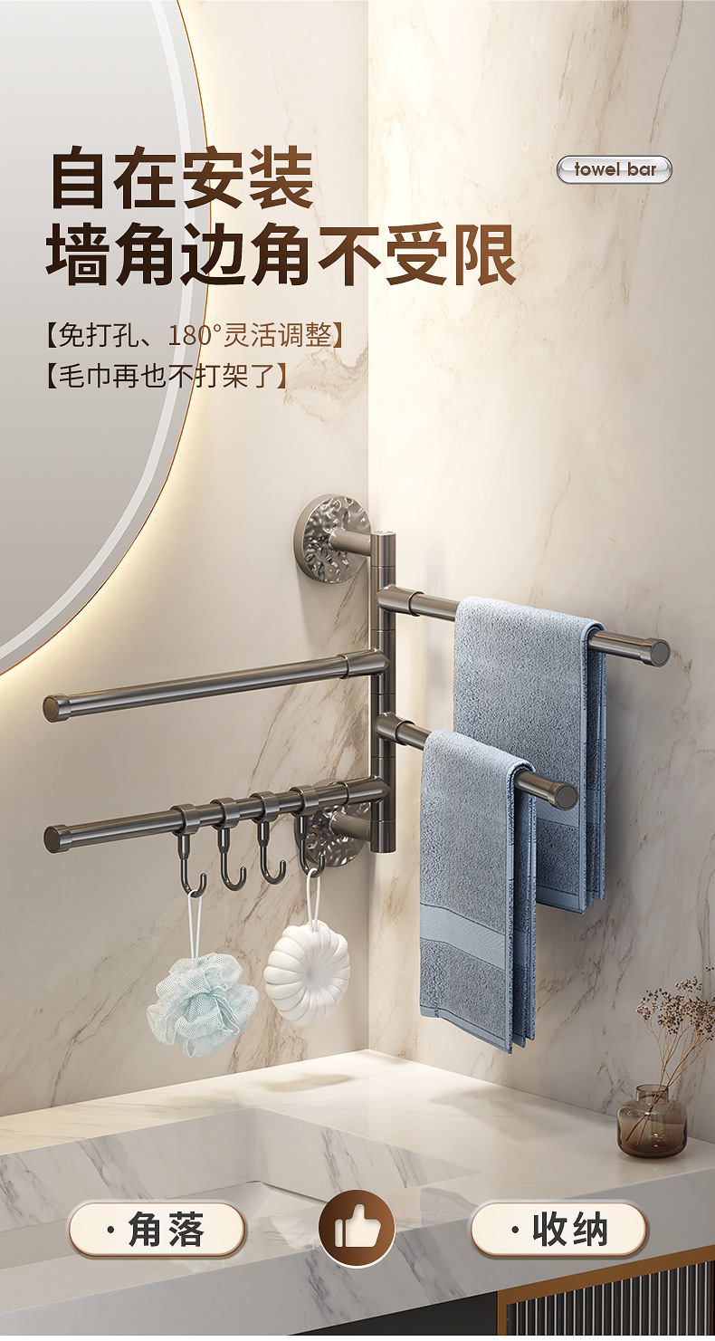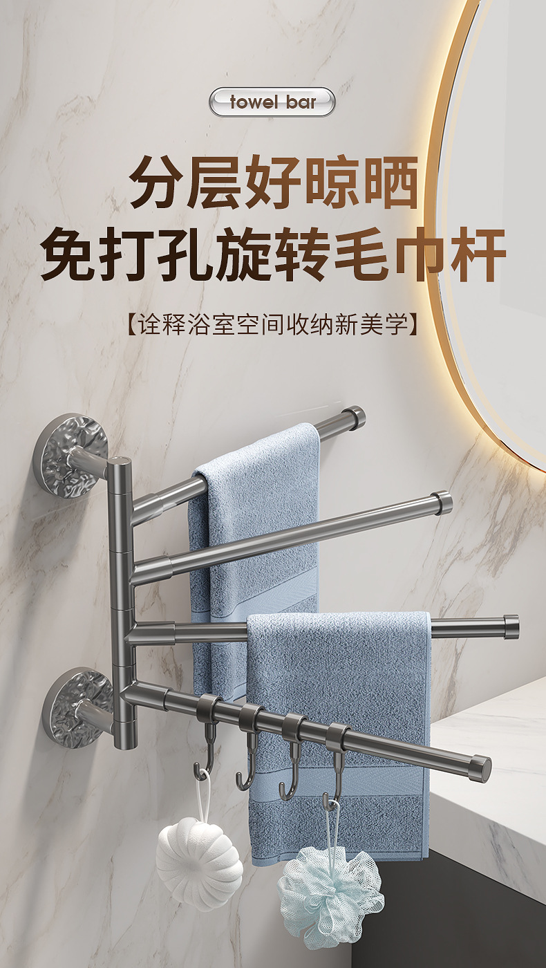 旋转毛巾架卫生间免打孔多杆浴巾收纳挂架壁挂式浴室转角毛巾挂杆