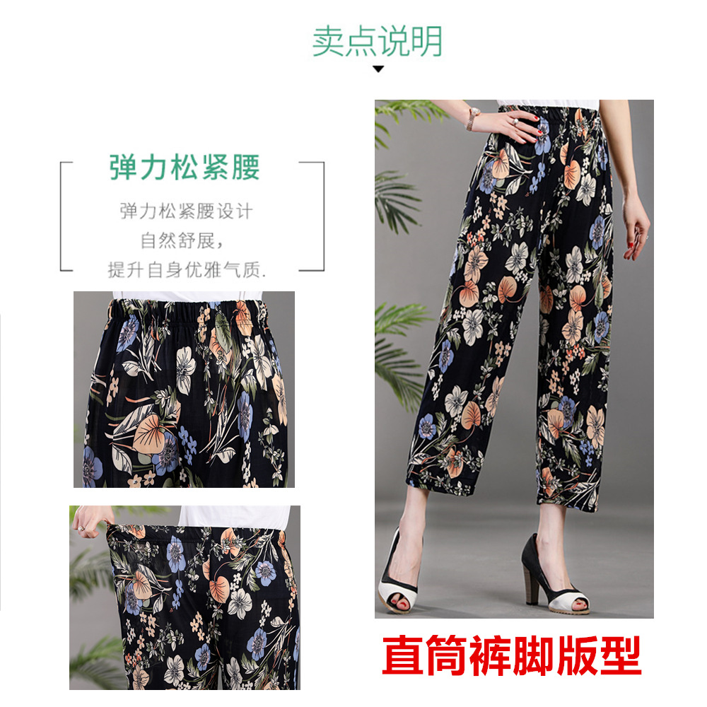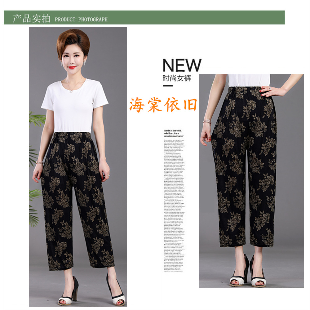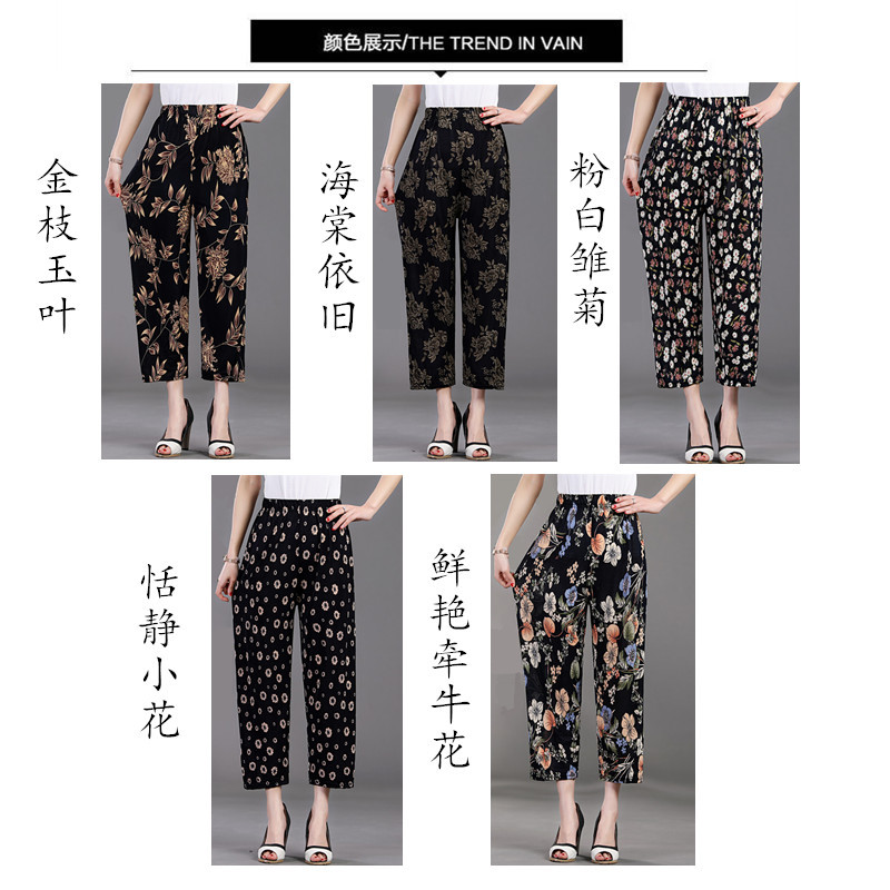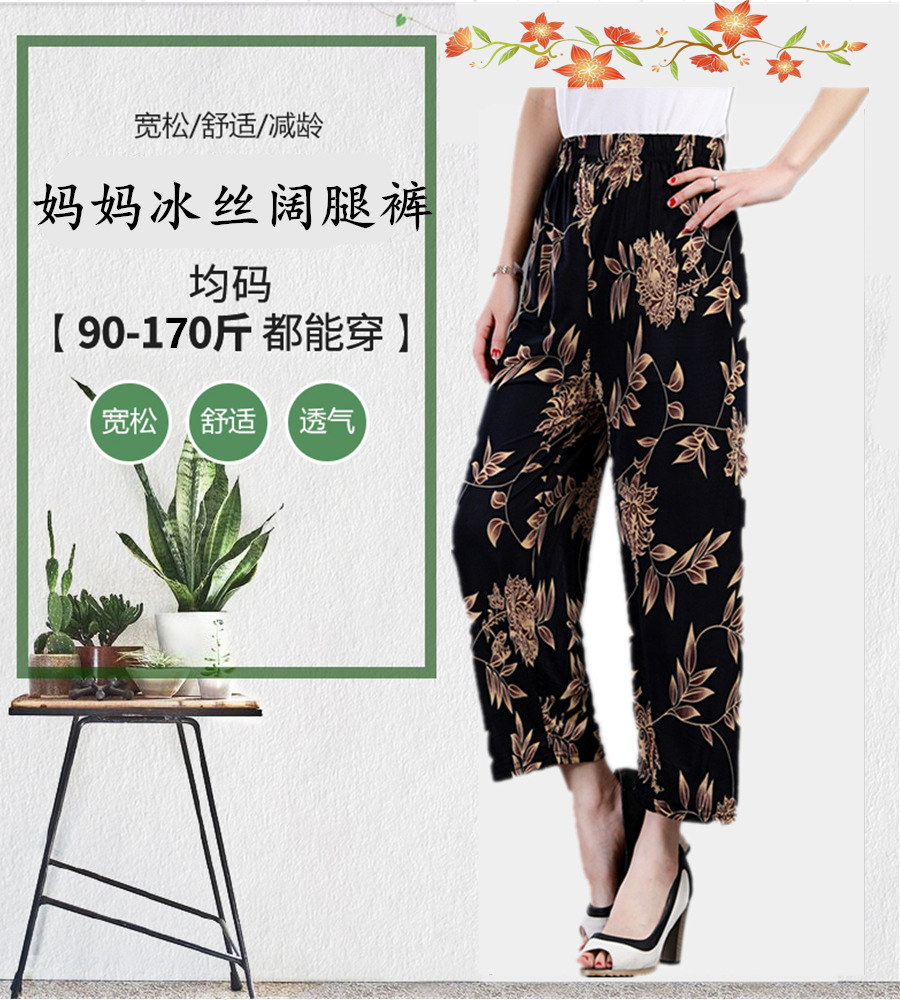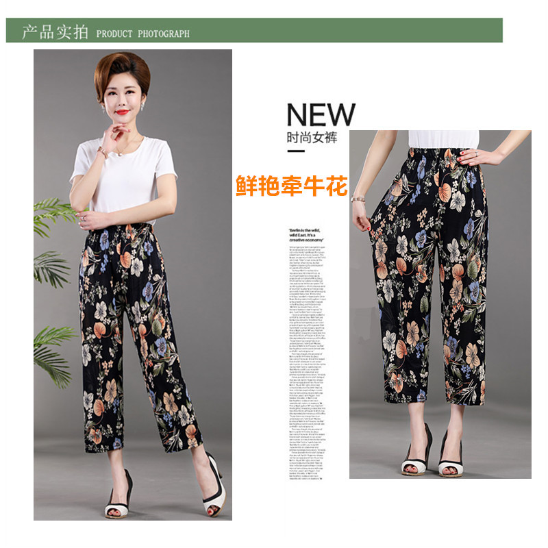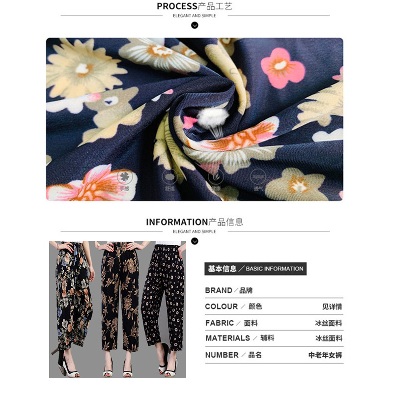 春夏中老年休闲女裤冰丝妈妈裤宽松大码花裤子松紧腰九分裤打底裤