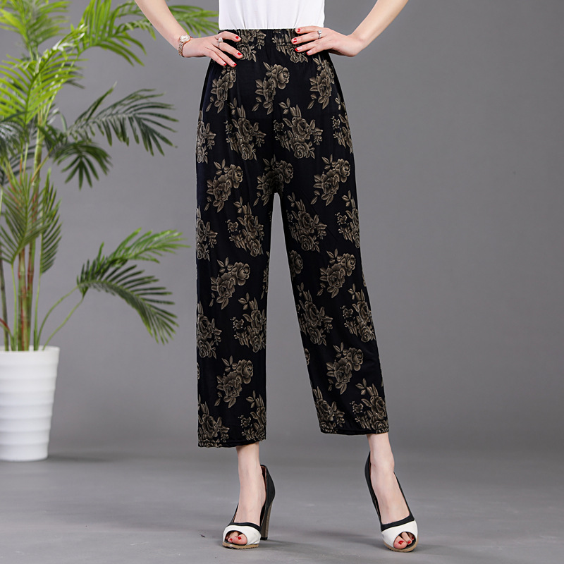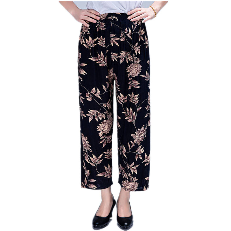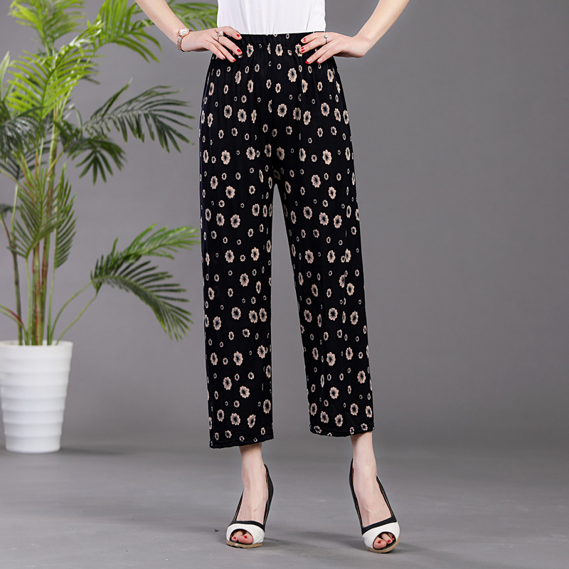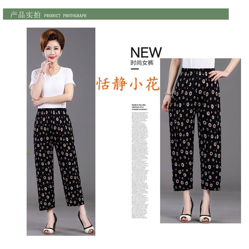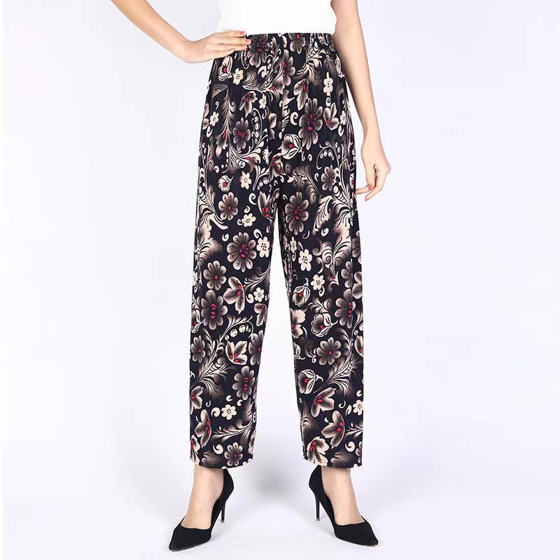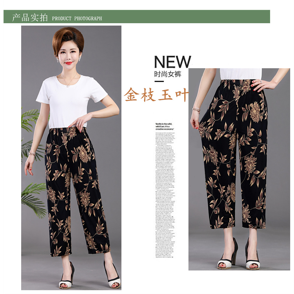 春夏中老年休闲女裤冰丝妈妈裤宽松大码花裤子松紧腰九分裤打底裤