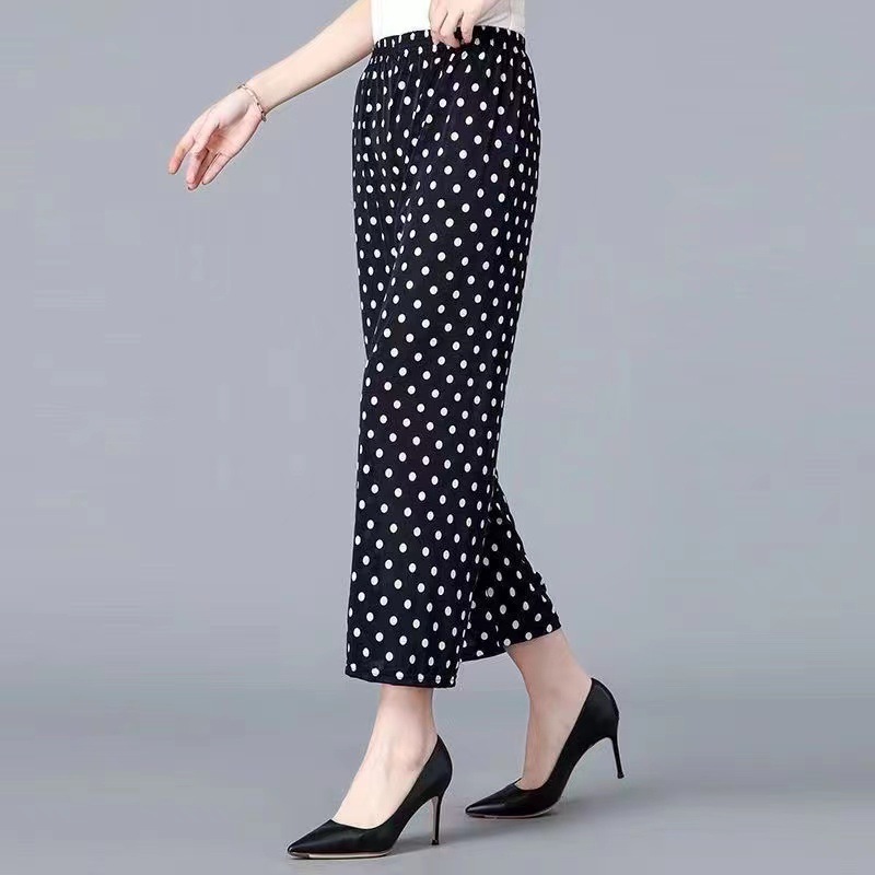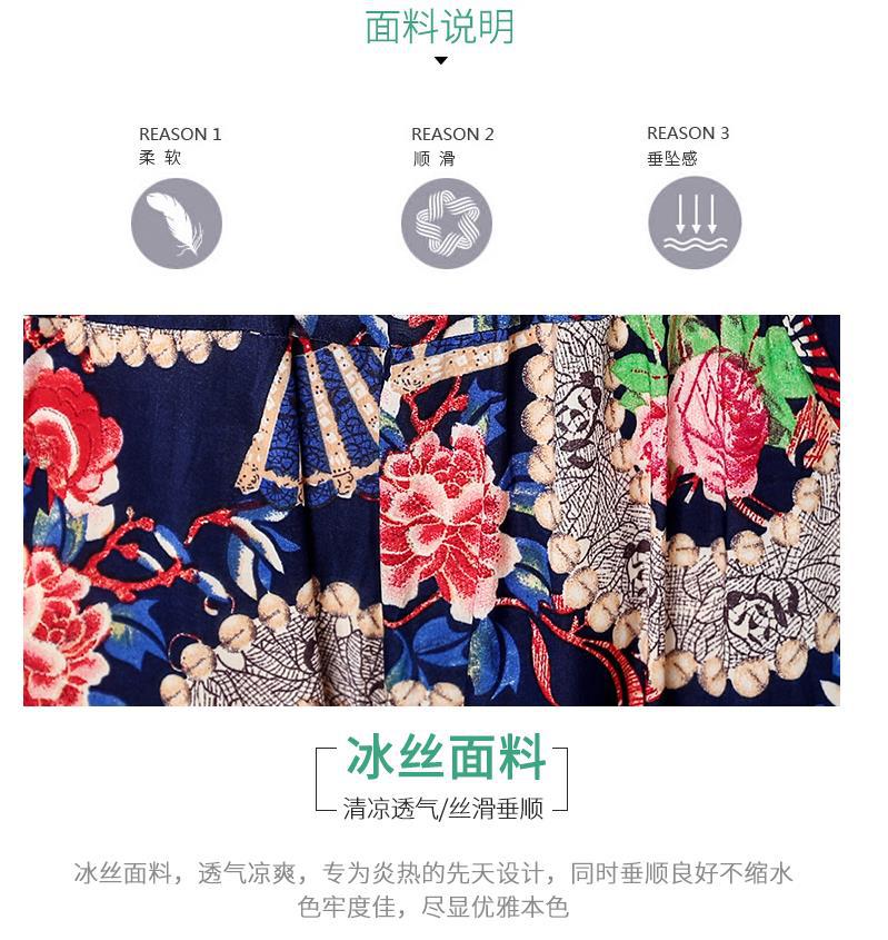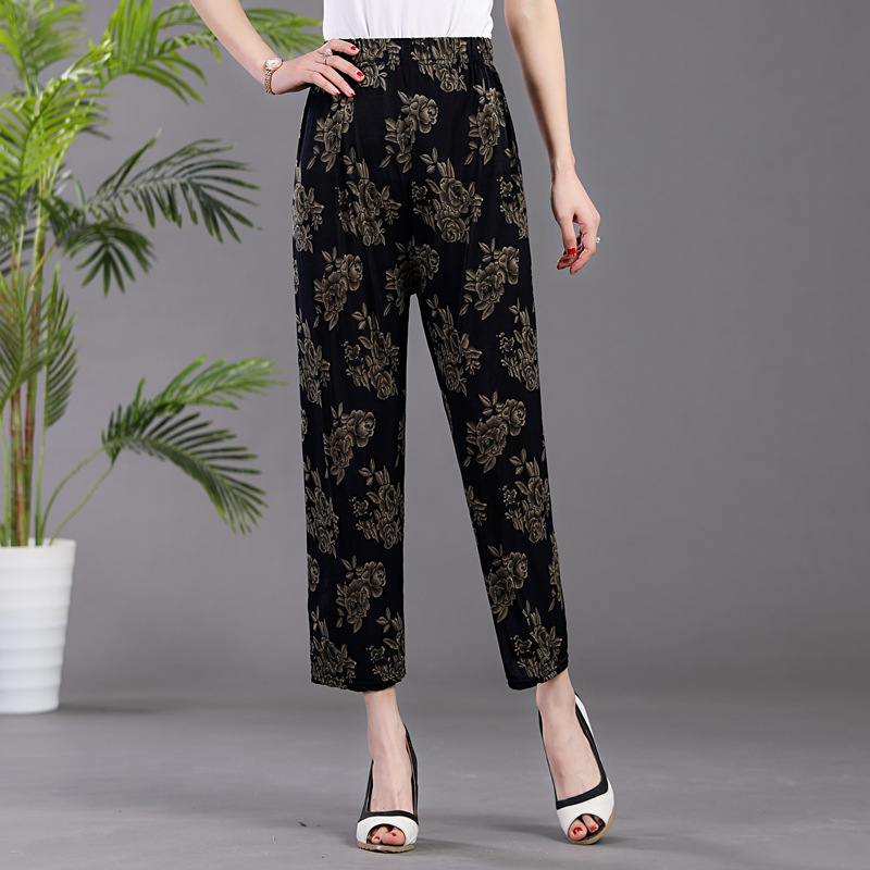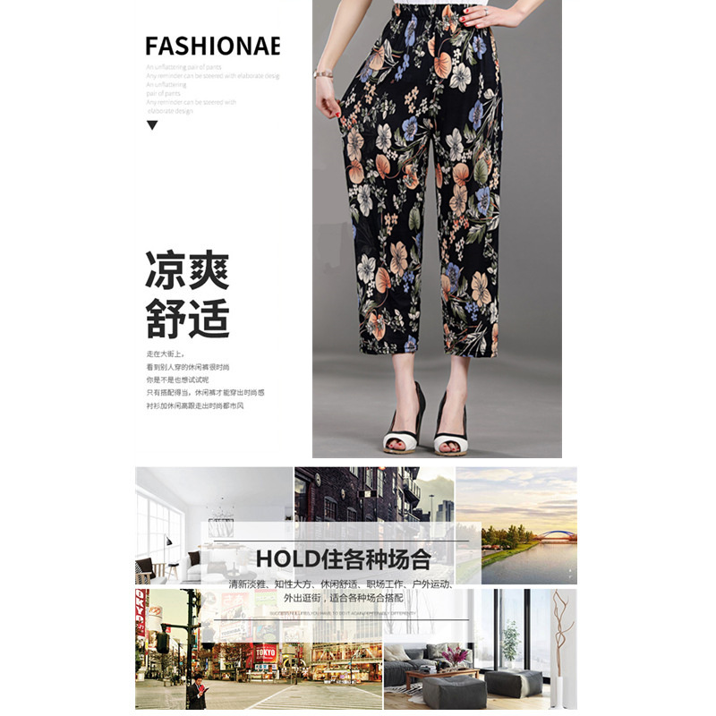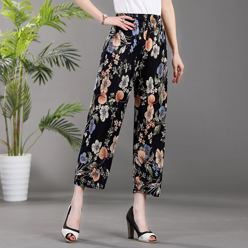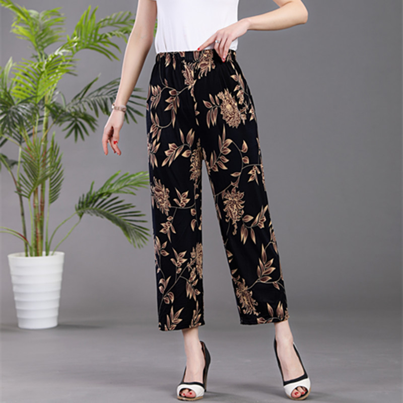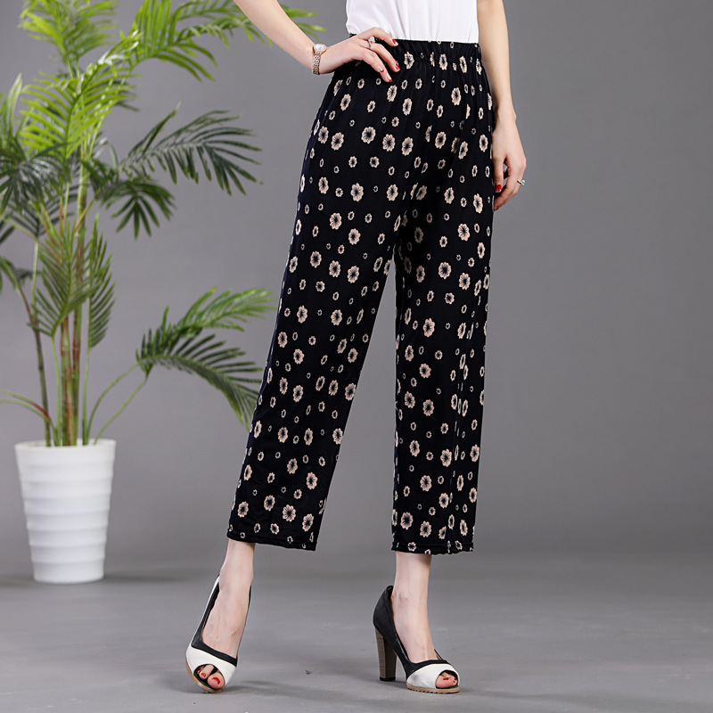 春夏中老年休闲女裤冰丝妈妈裤宽松大码花裤子松紧腰九分裤打底裤