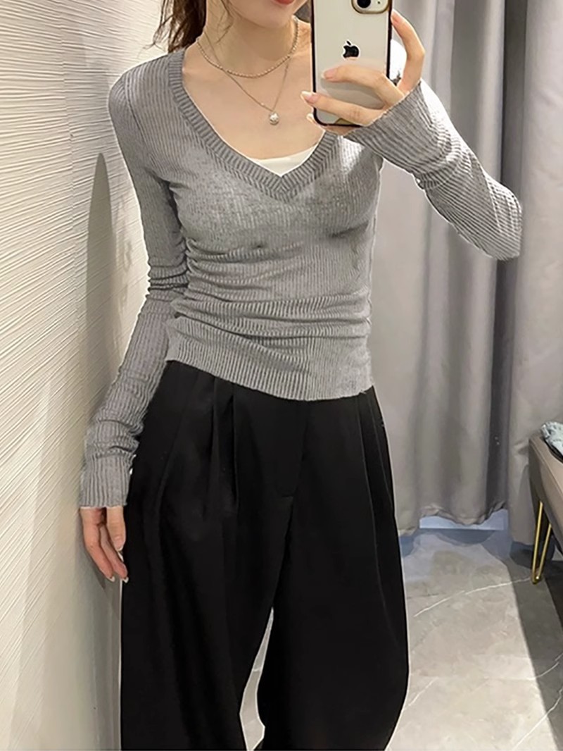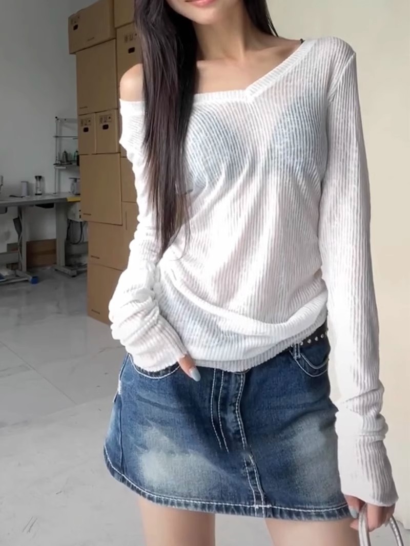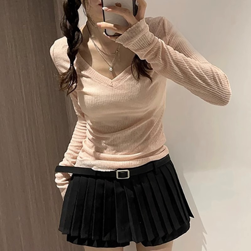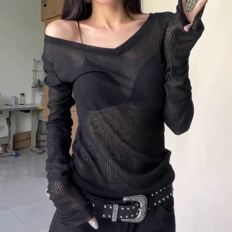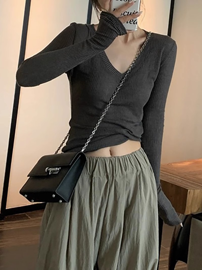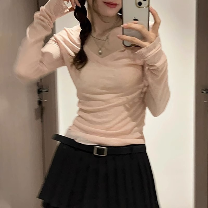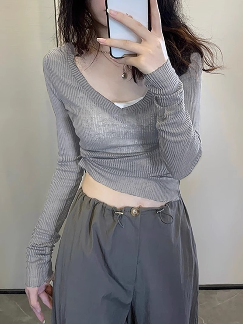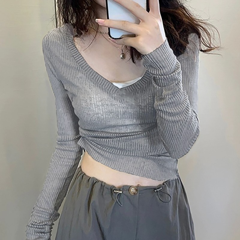 夏季美式V领长袖t恤女防晒罩衫慵懒感薄款空调衫内搭打底衫上衣女