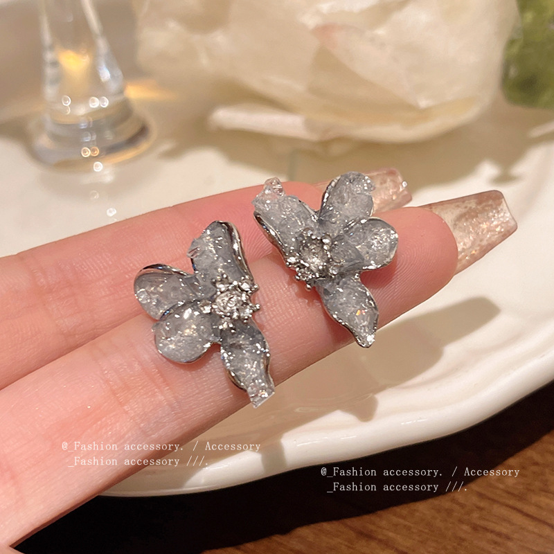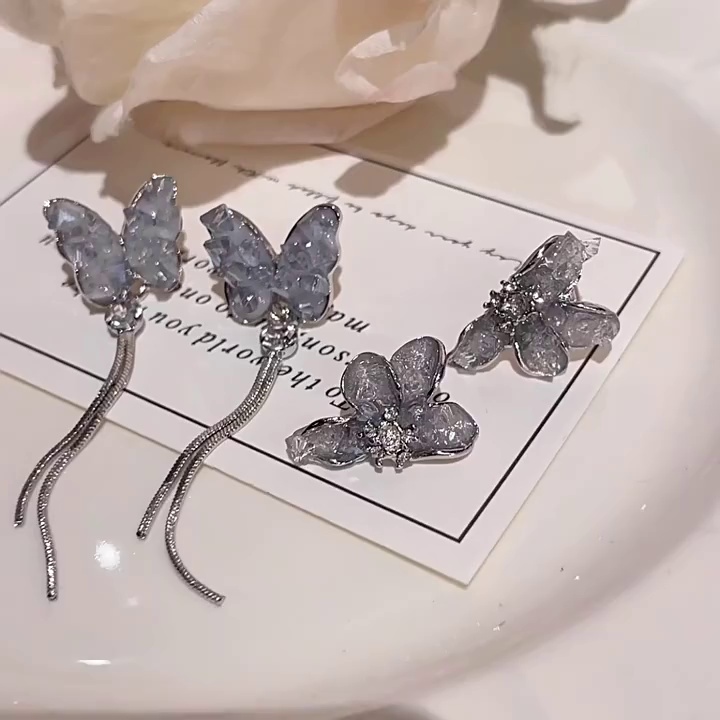 长款流苏百搭气质蝴蝶耳环S925银针超仙气质蓝色水晶碎钻花朵耳钉