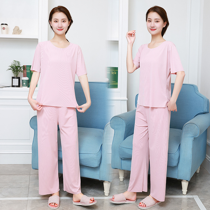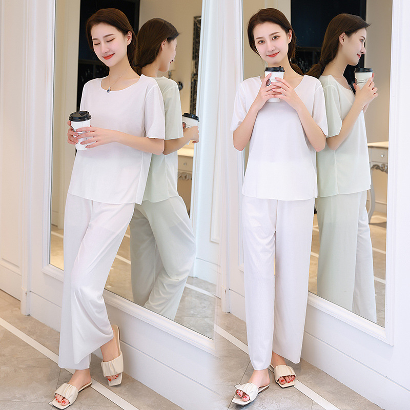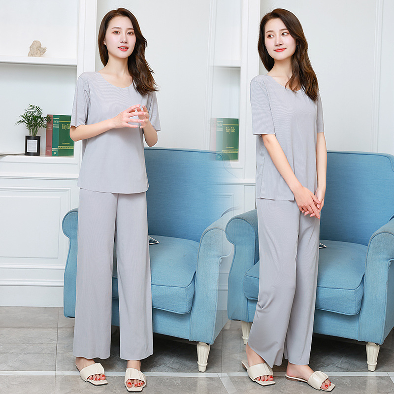 四季女士短袖套装睡衣外穿家居服纯色凉爽时尚宽松阔腿裤套装批发