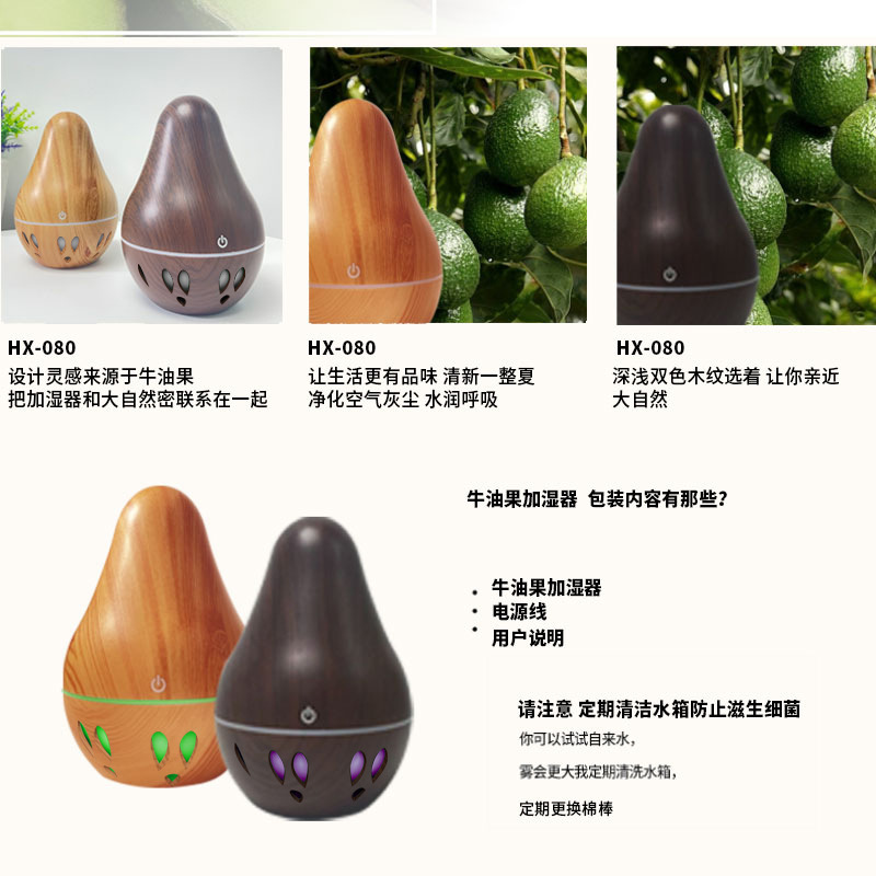 新款牛油果木纹超声波加湿器桌面车载加湿器七彩渐变扩散器