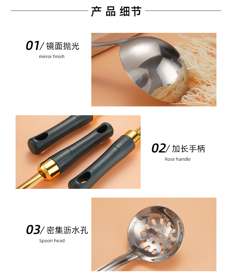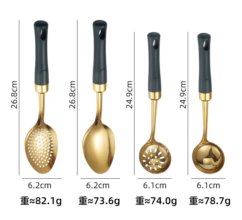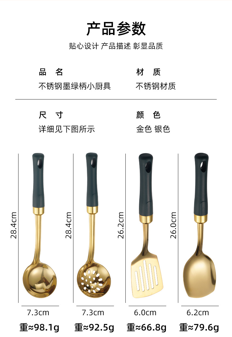 尺寸绿柄7公分汤壳-银色,绿柄7公分汤壳-金色,绿柄7公分汤漏-本色,绿柄7公分汤漏-金色,绿柄6公分汤壳-银色,绿柄6公分汤壳-金色,绿柄6公分汤漏-银色,绿柄6公分汤漏-金色,绿柄平锅铲-银色,绿柄平锅铲-金色,绿柄平漏铲-银色,绿柄平漏铲-金色,绿柄分餐勺-银色,绿柄分餐勺-金色,绿柄分餐漏勺-银色,绿柄分餐漏勺-金色 |