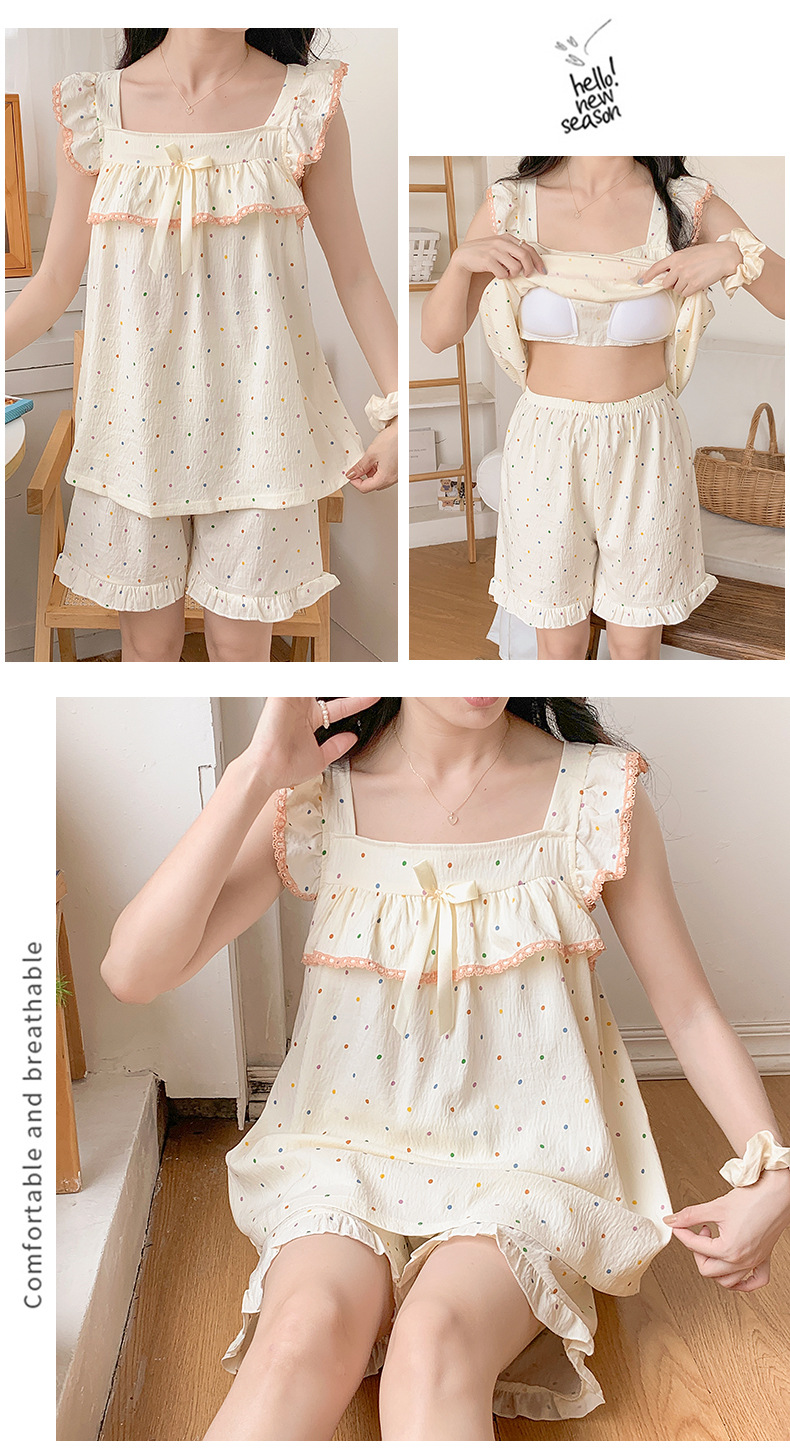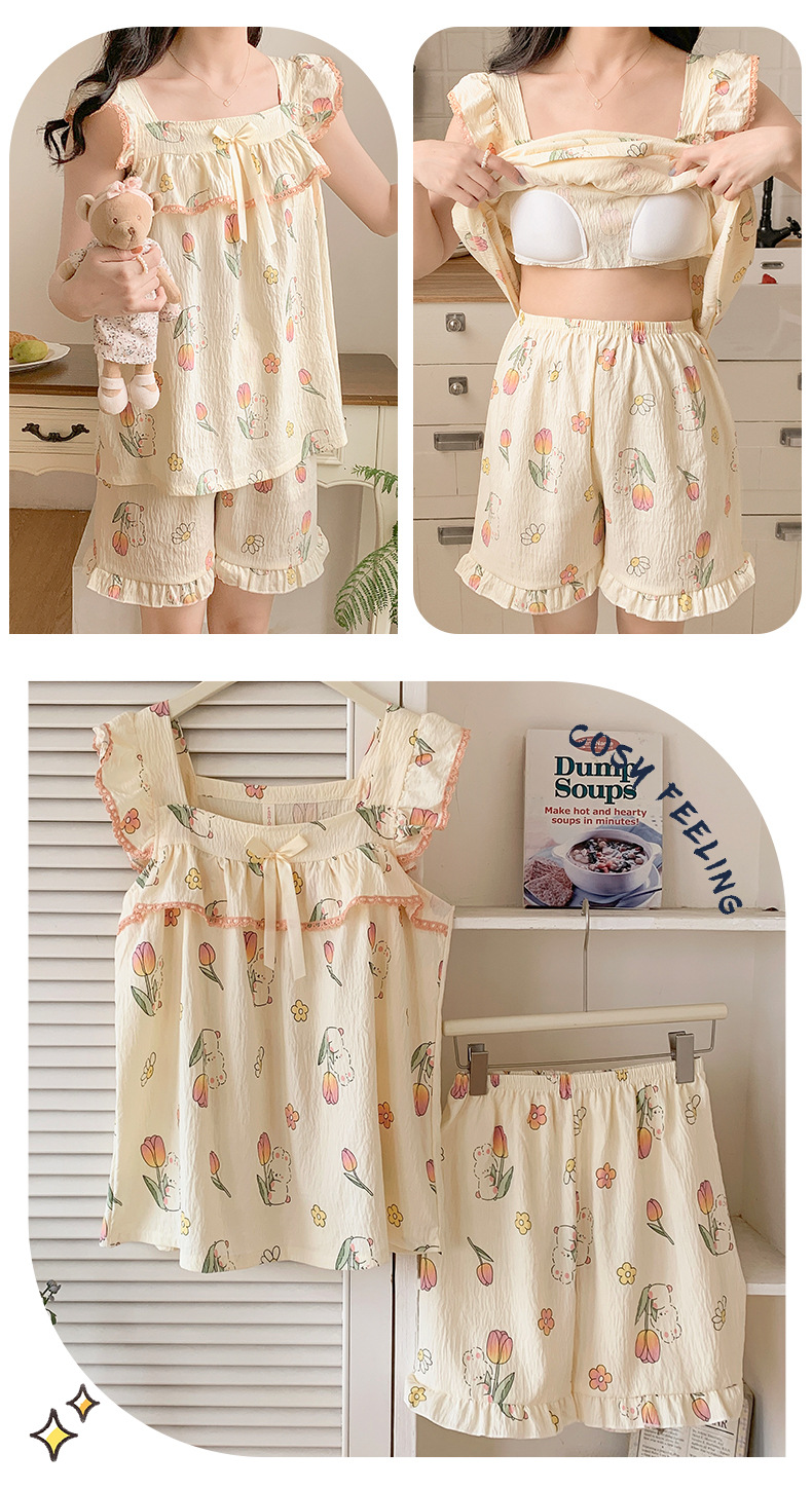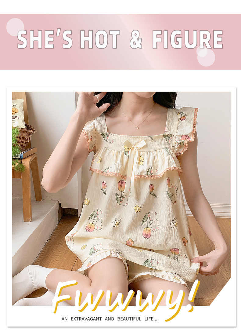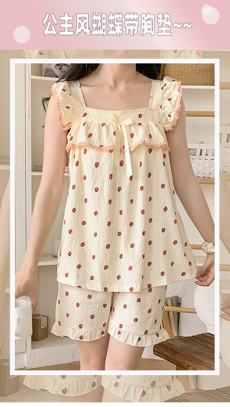睡衣女夏季带胸垫天丝爽棉小飞袖背心短裤甜美韩版少女家居服套装