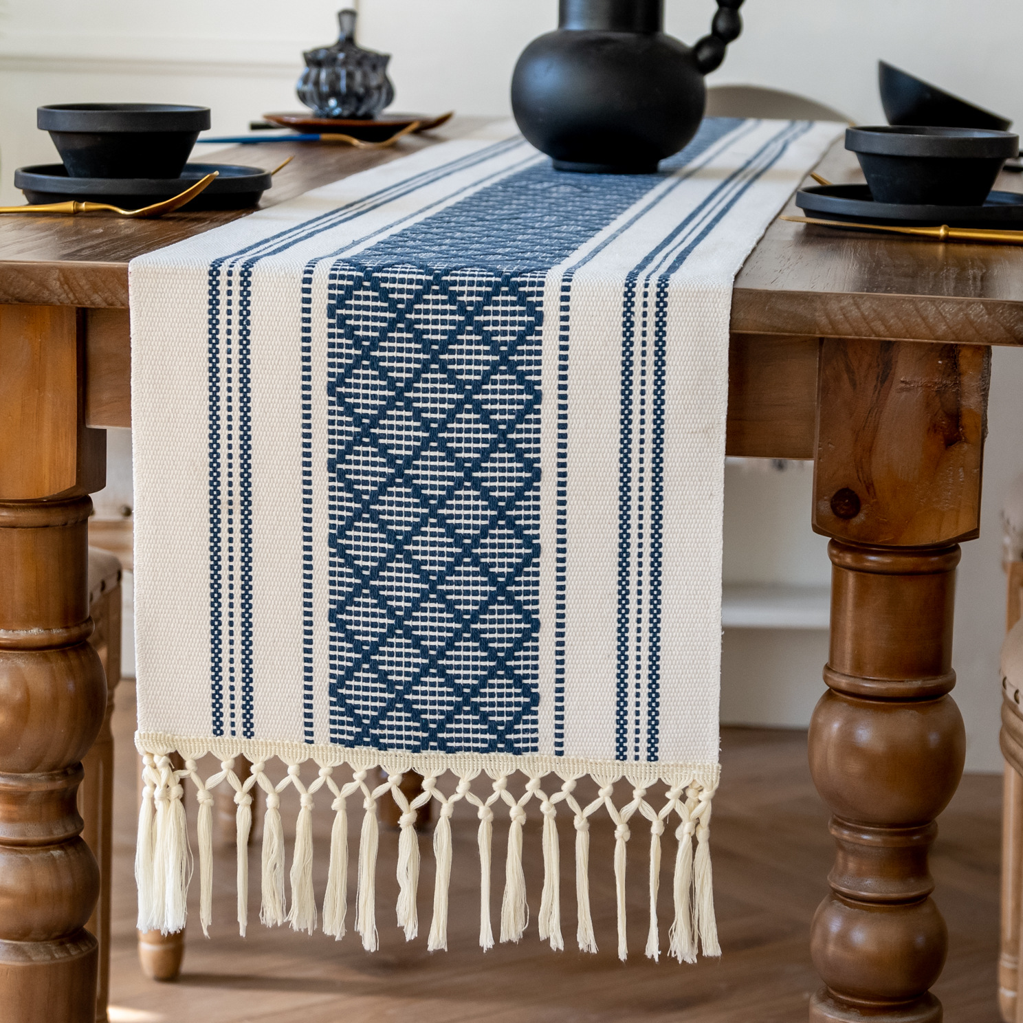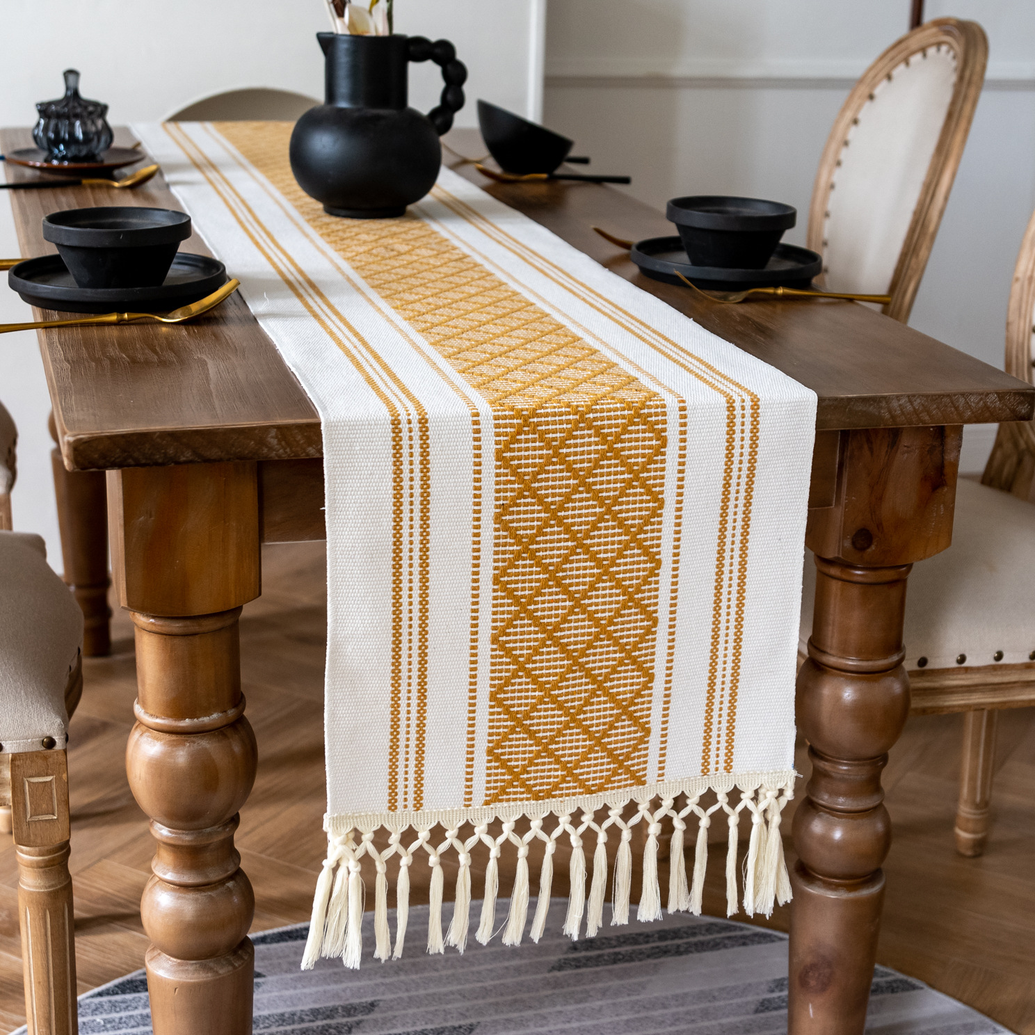 跨境热销编织打结流苏桌旗网格提花色织拼色美式复古现代桌巾批发