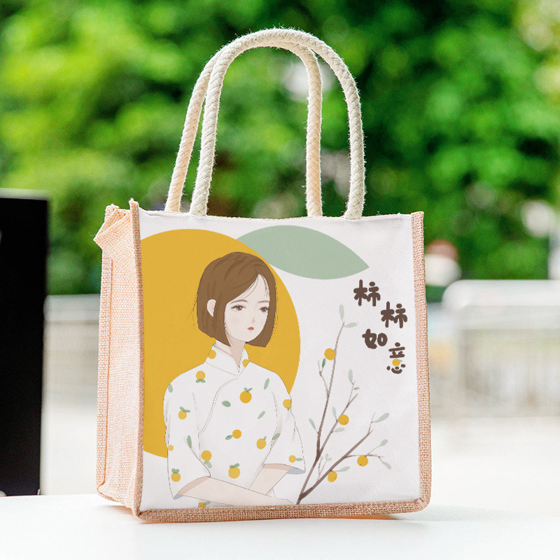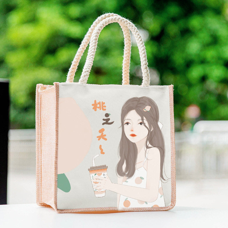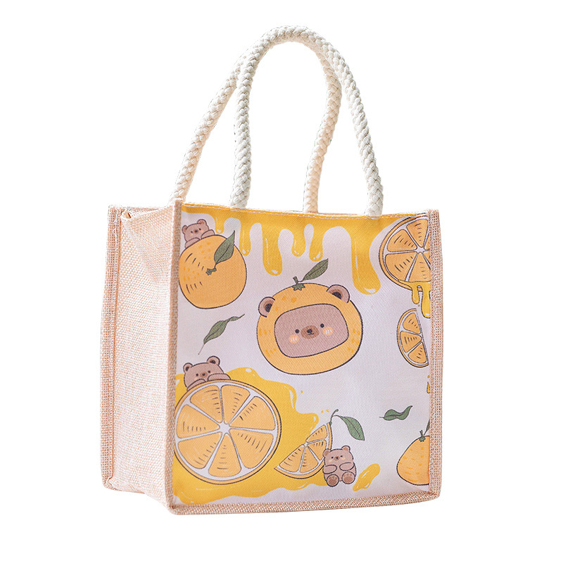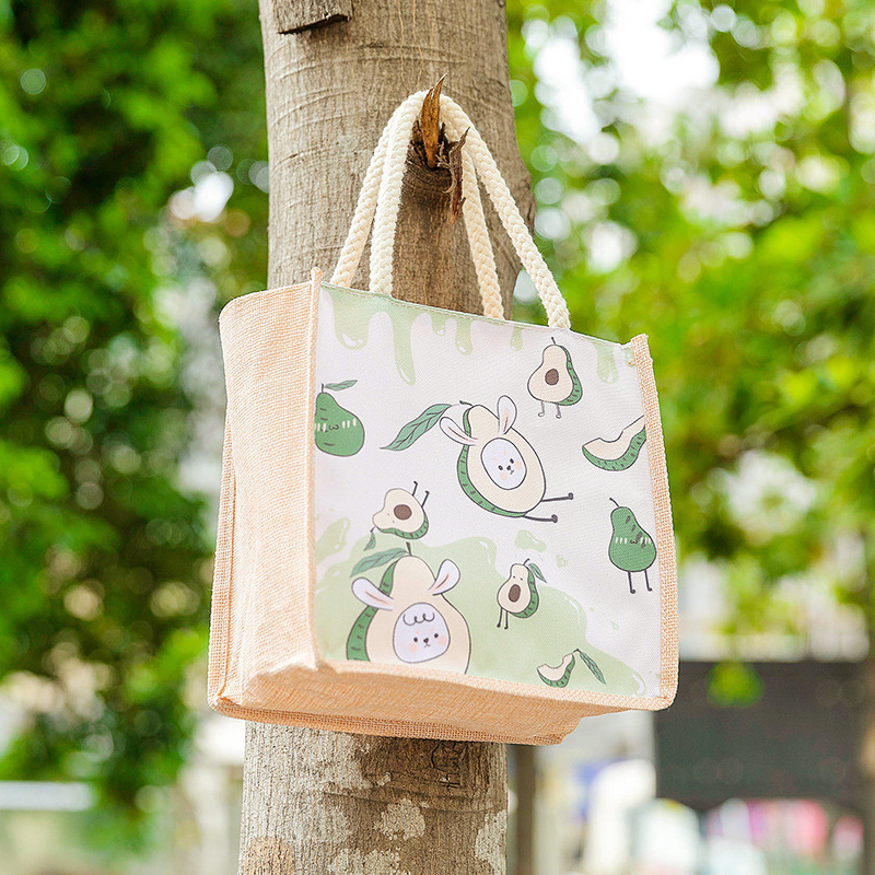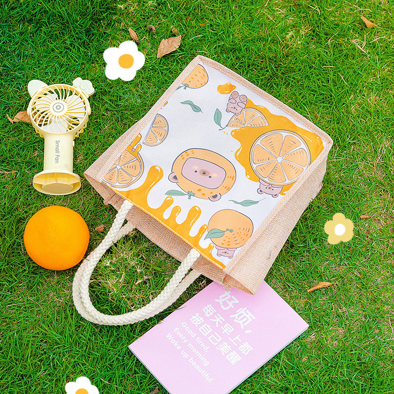 仿麻包ins手提袋饭盒袋上班族带饭卡通饭盒包 小清新大容量便当包