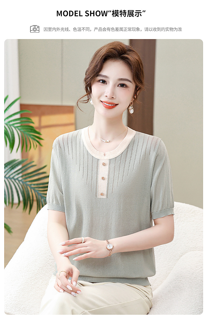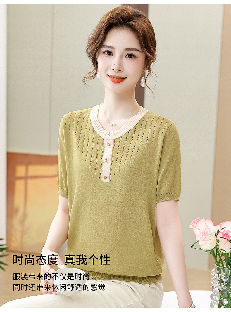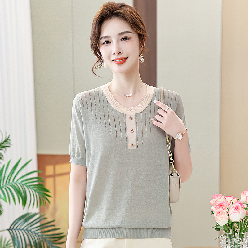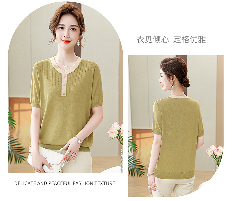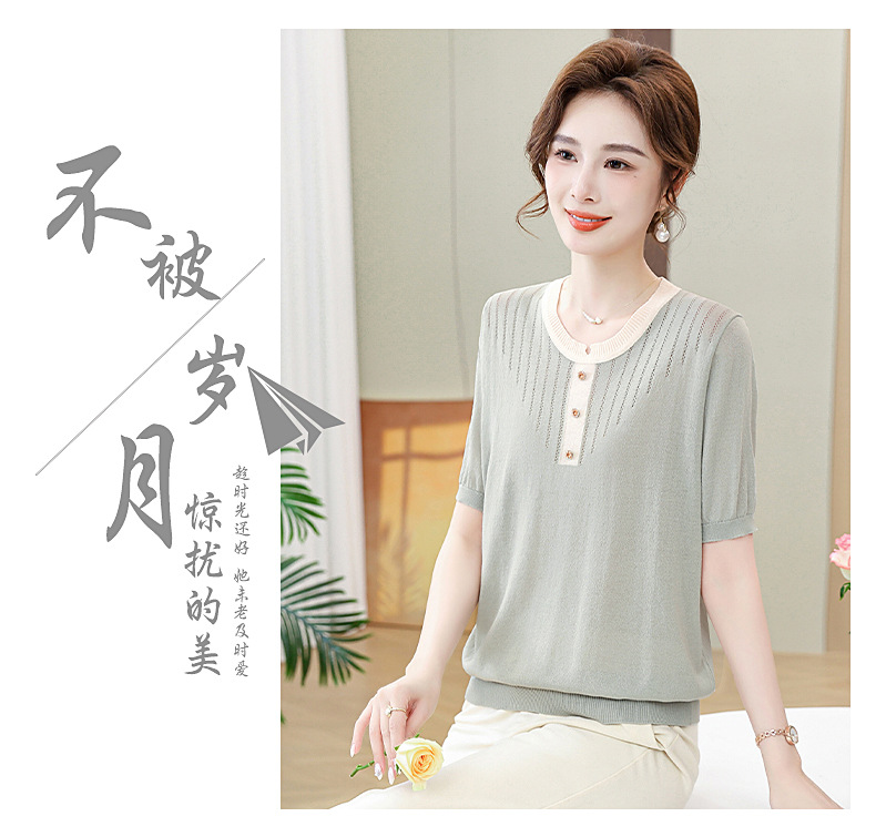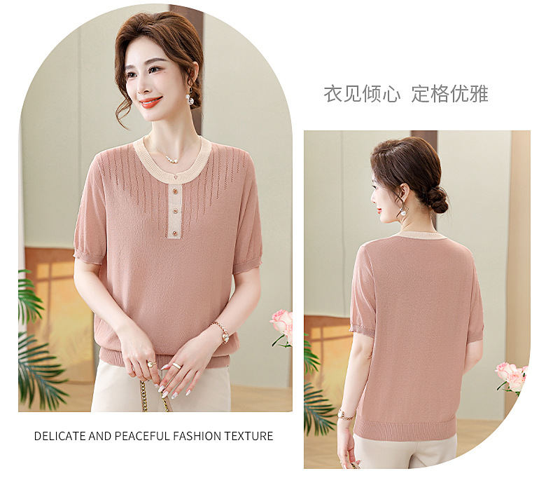 妈妈夏装圆领洋气冰丝短袖50岁中年女薄款上衣中老年针织T恤小衫