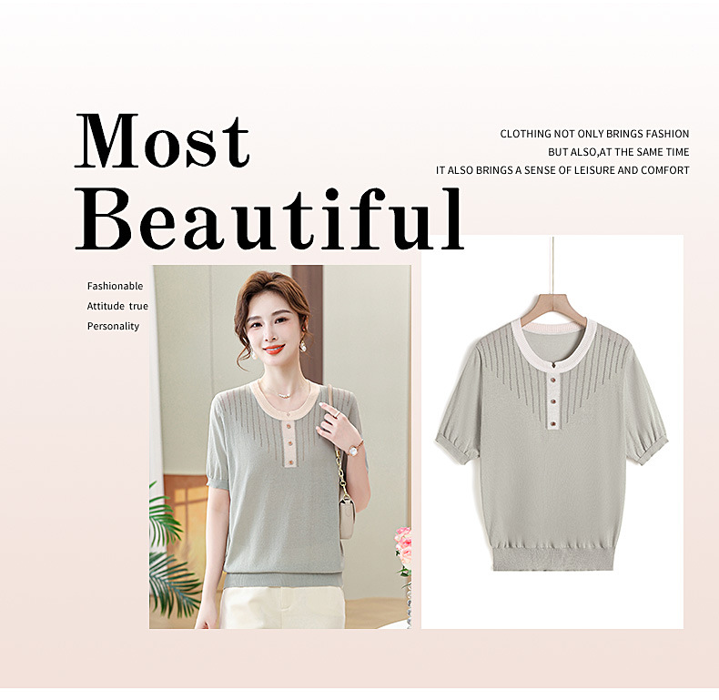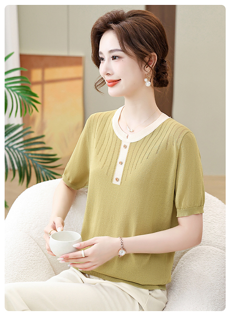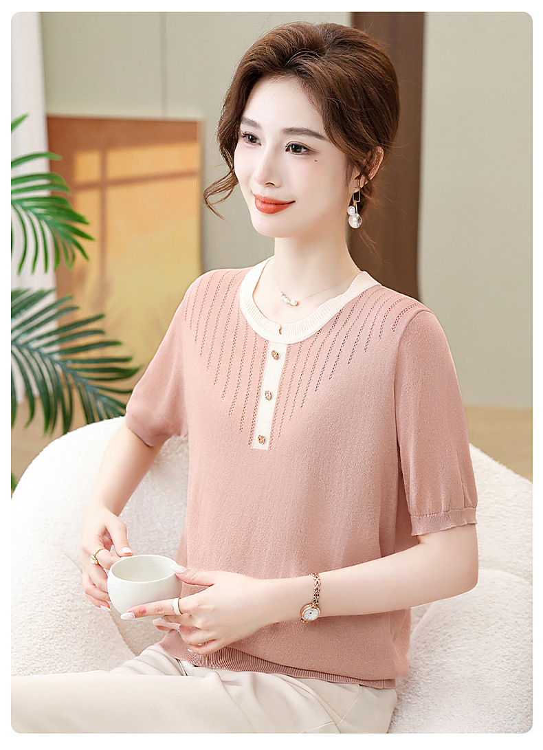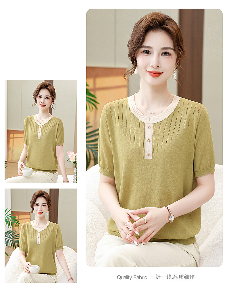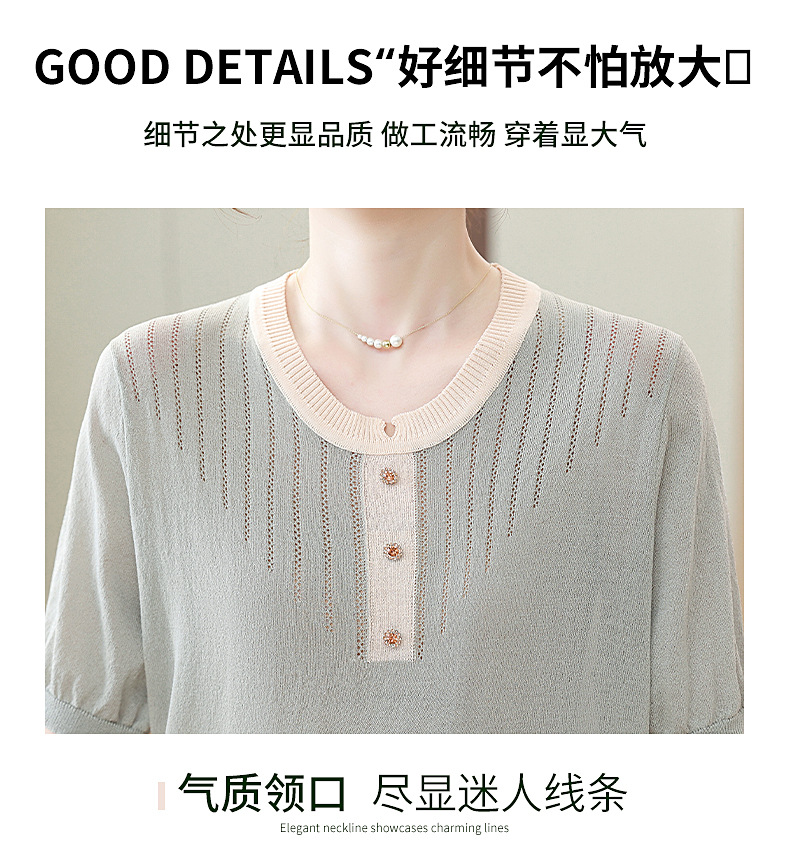 妈妈夏装圆领洋气冰丝短袖50岁中年女薄款上衣中老年针织T恤小衫