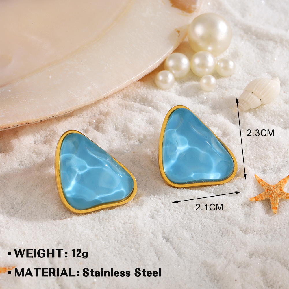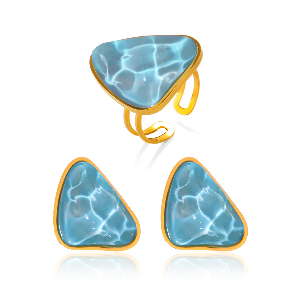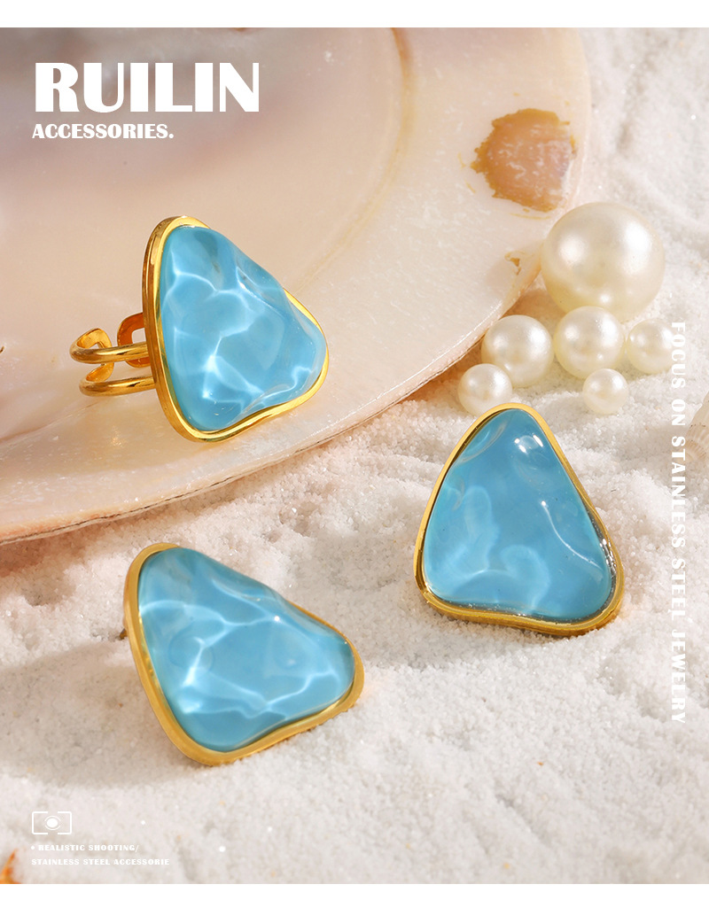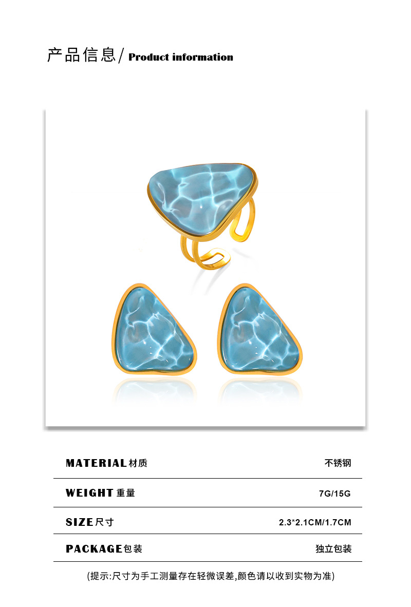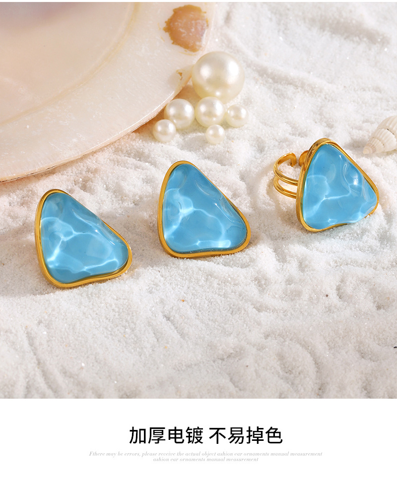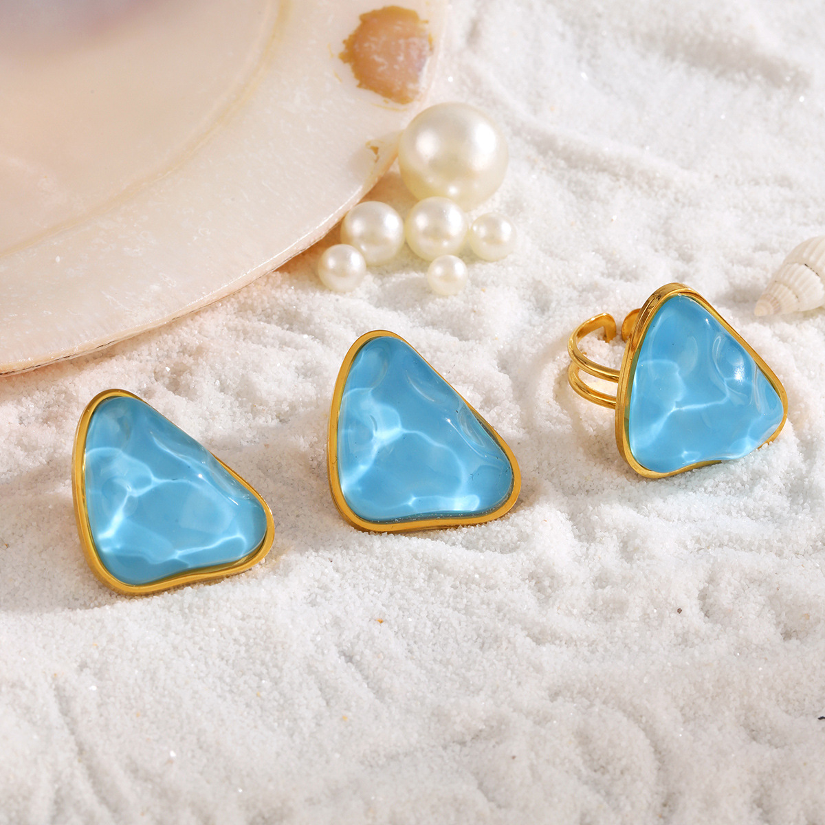 三角形不锈钢耳环戒指海滩度假风个性蓝色波光粼粼饰品套装女批发
