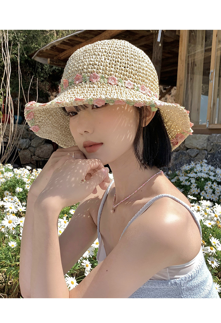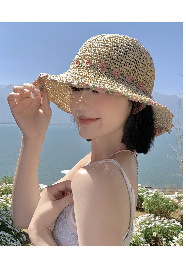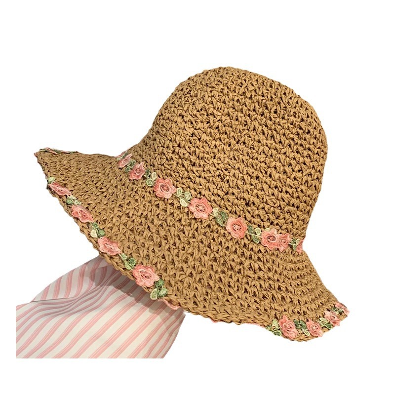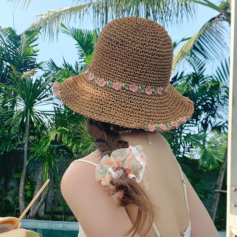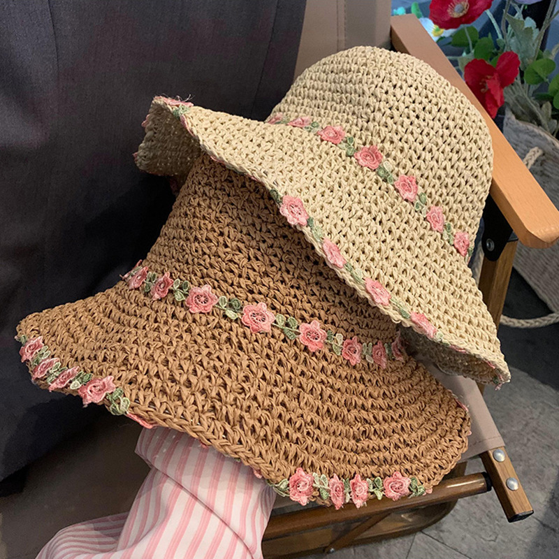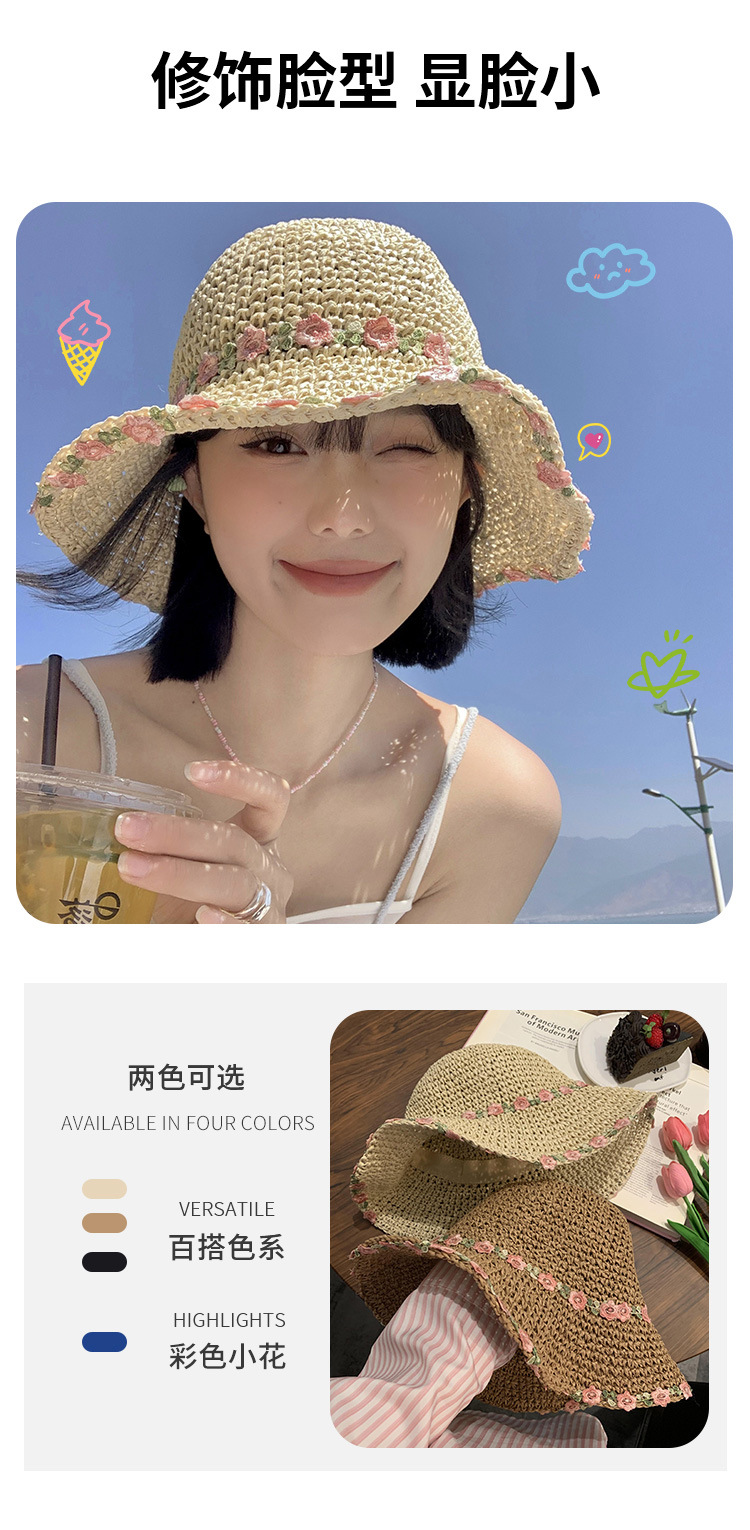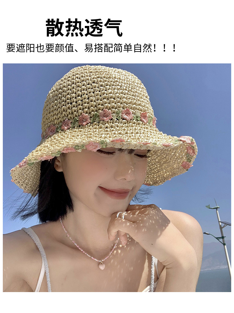 田园风~夏季钩针草帽女新款海边度假遮阳小花太阳帽可折叠草编帽
