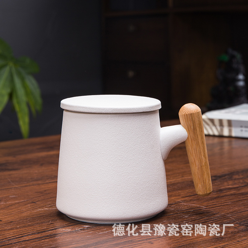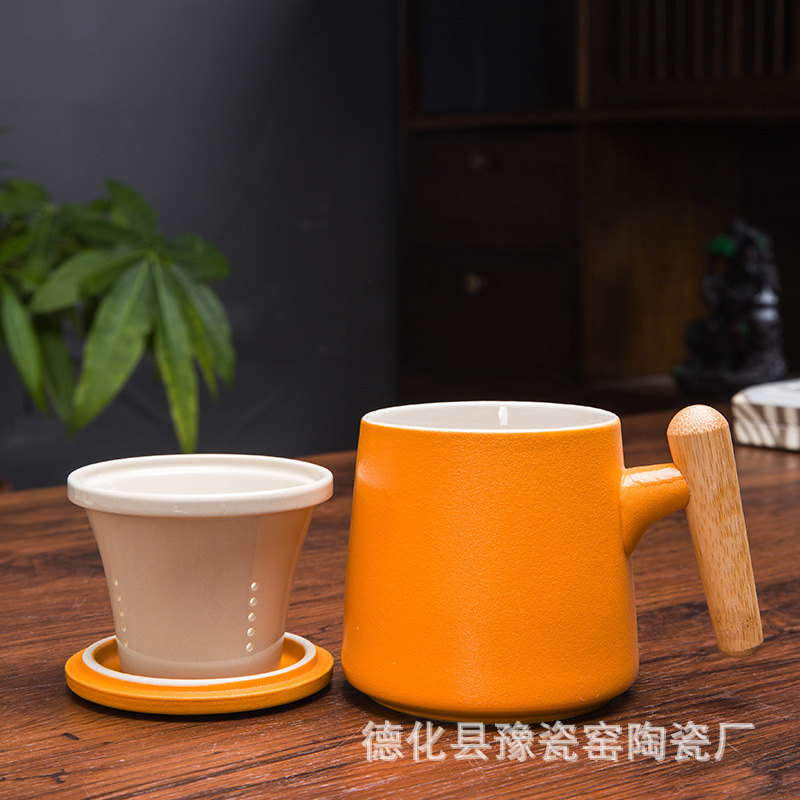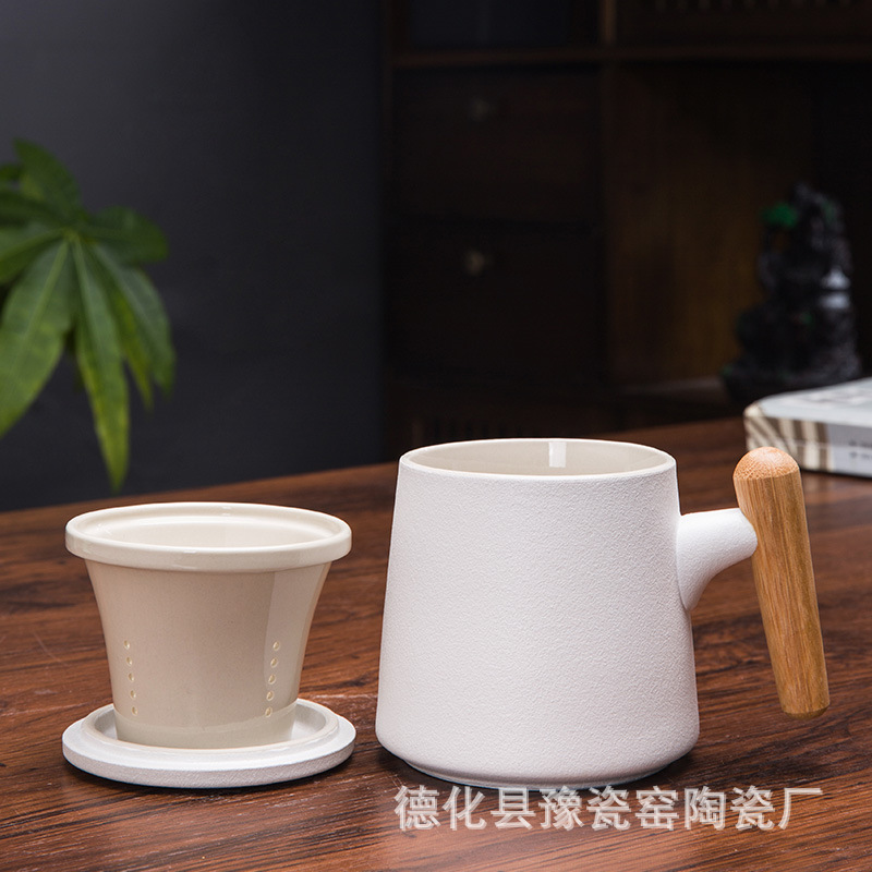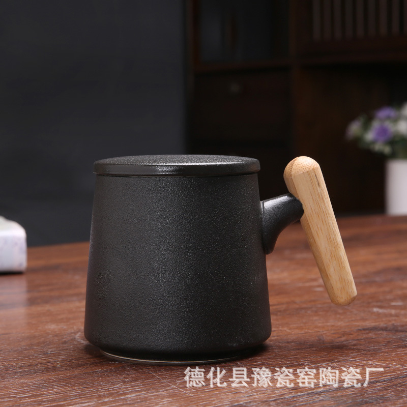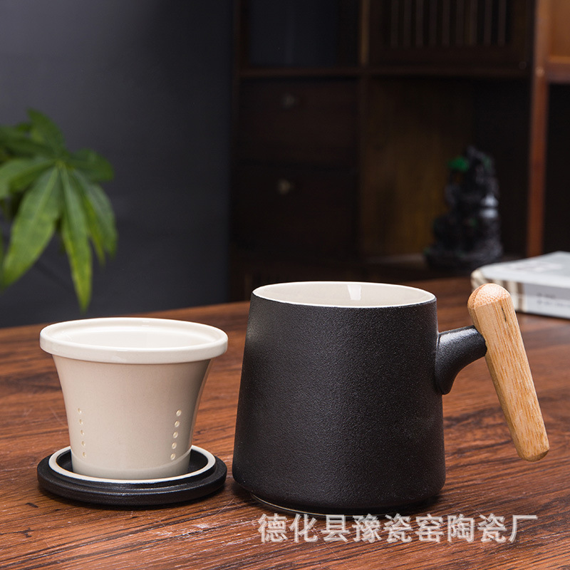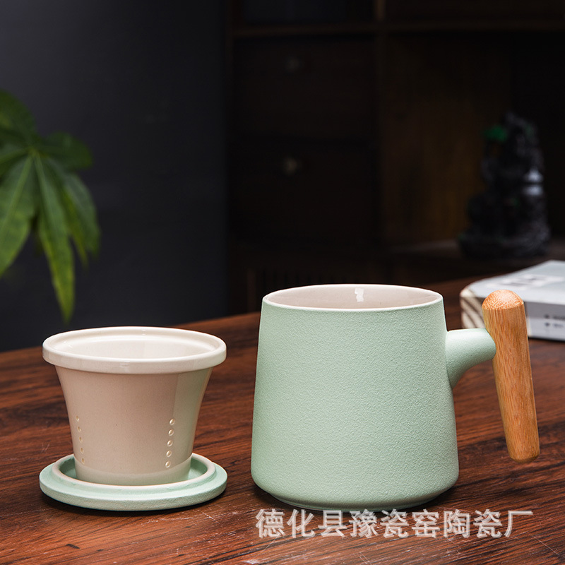 木柄杯 粗陶马克杯 木柄马克杯 木柄陶瓷杯 茶水分离茶杯刻字logo