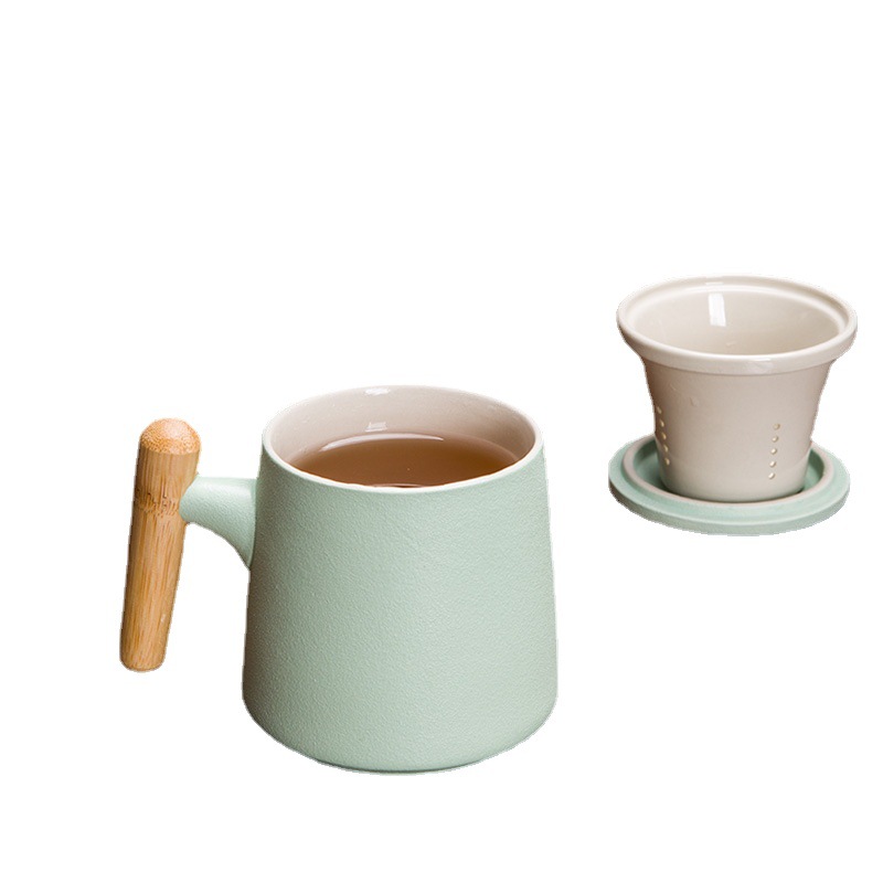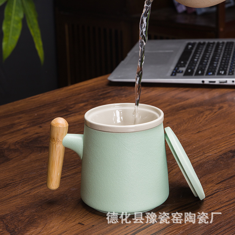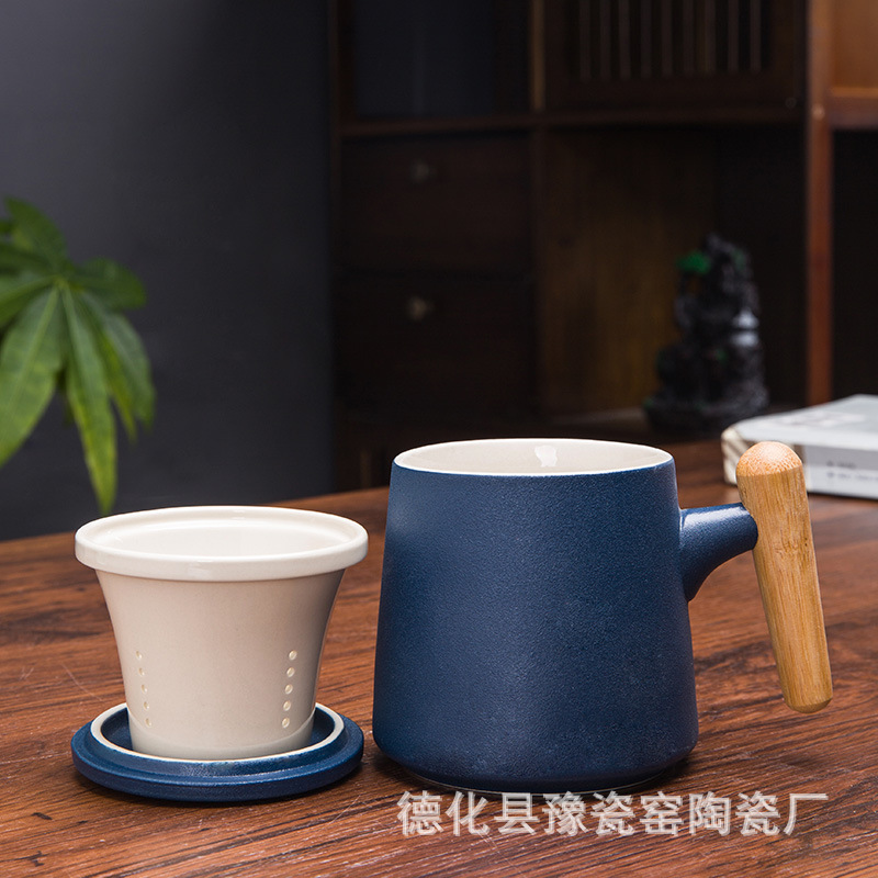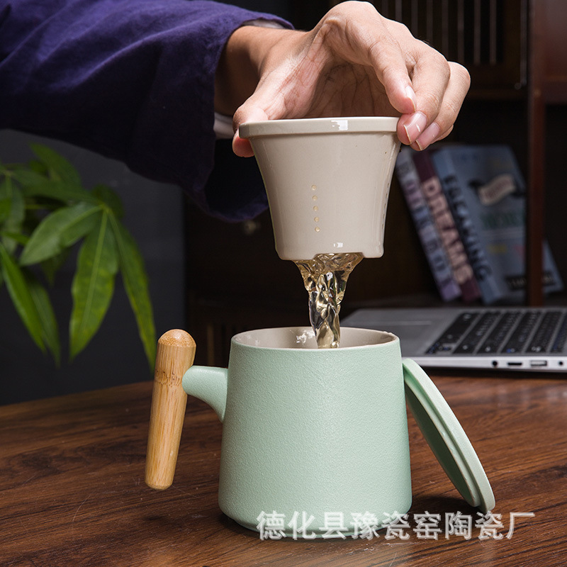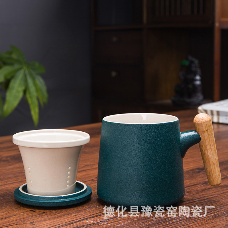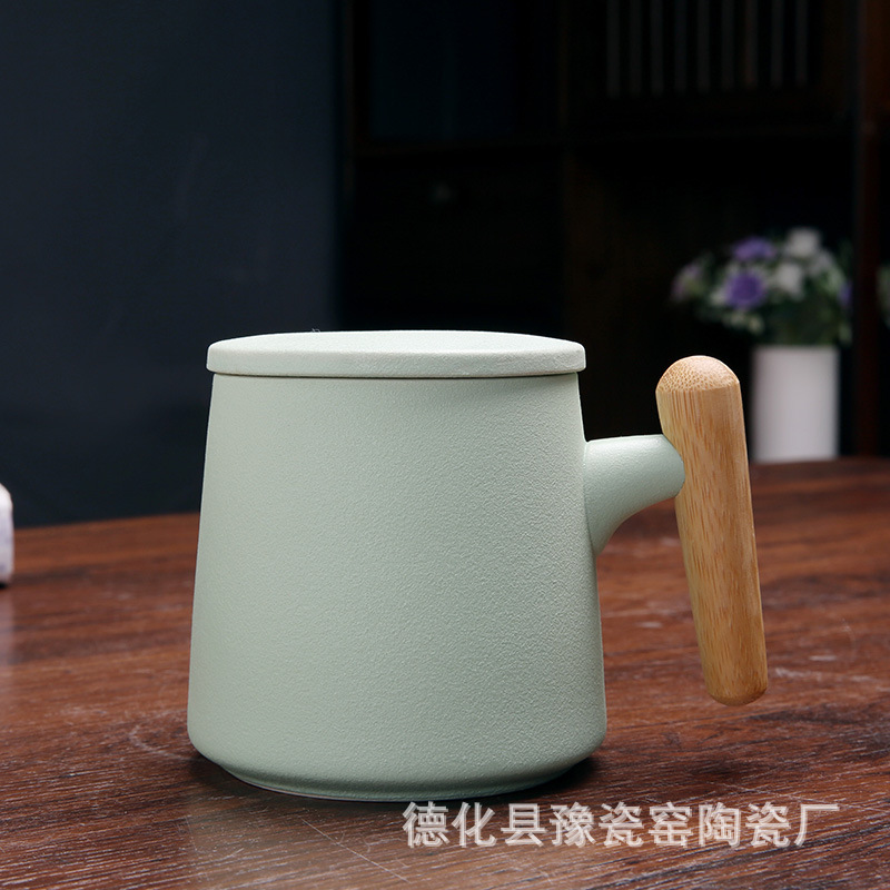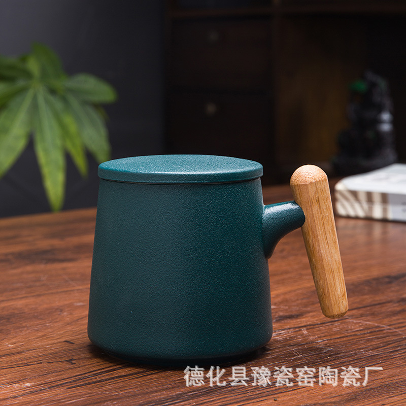 木柄杯 粗陶马克杯 木柄马克杯 木柄陶瓷杯 茶水分离茶杯刻字logo