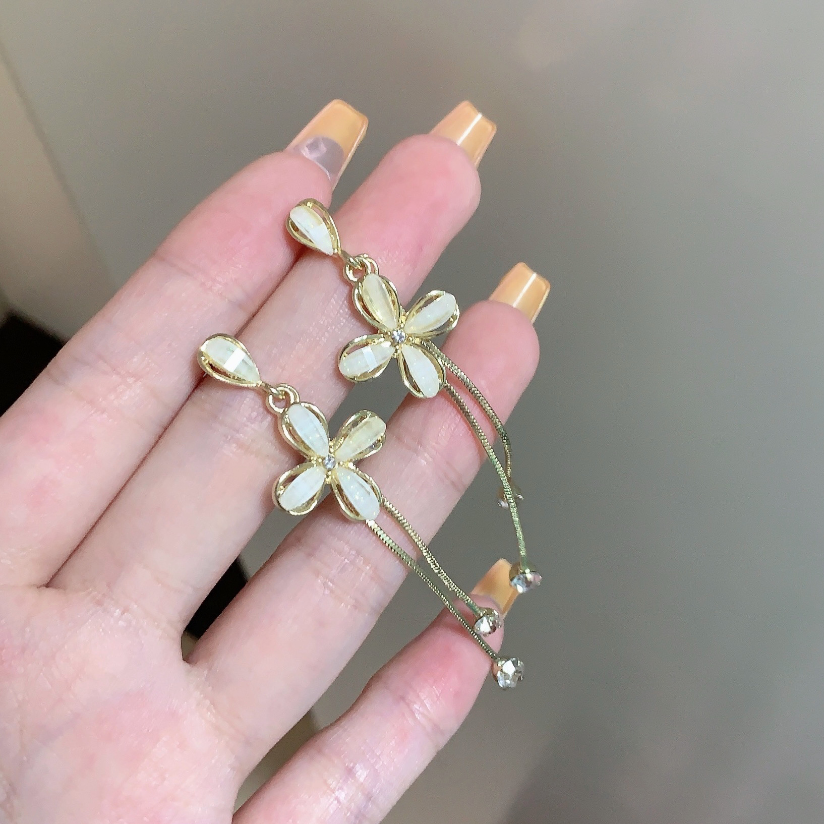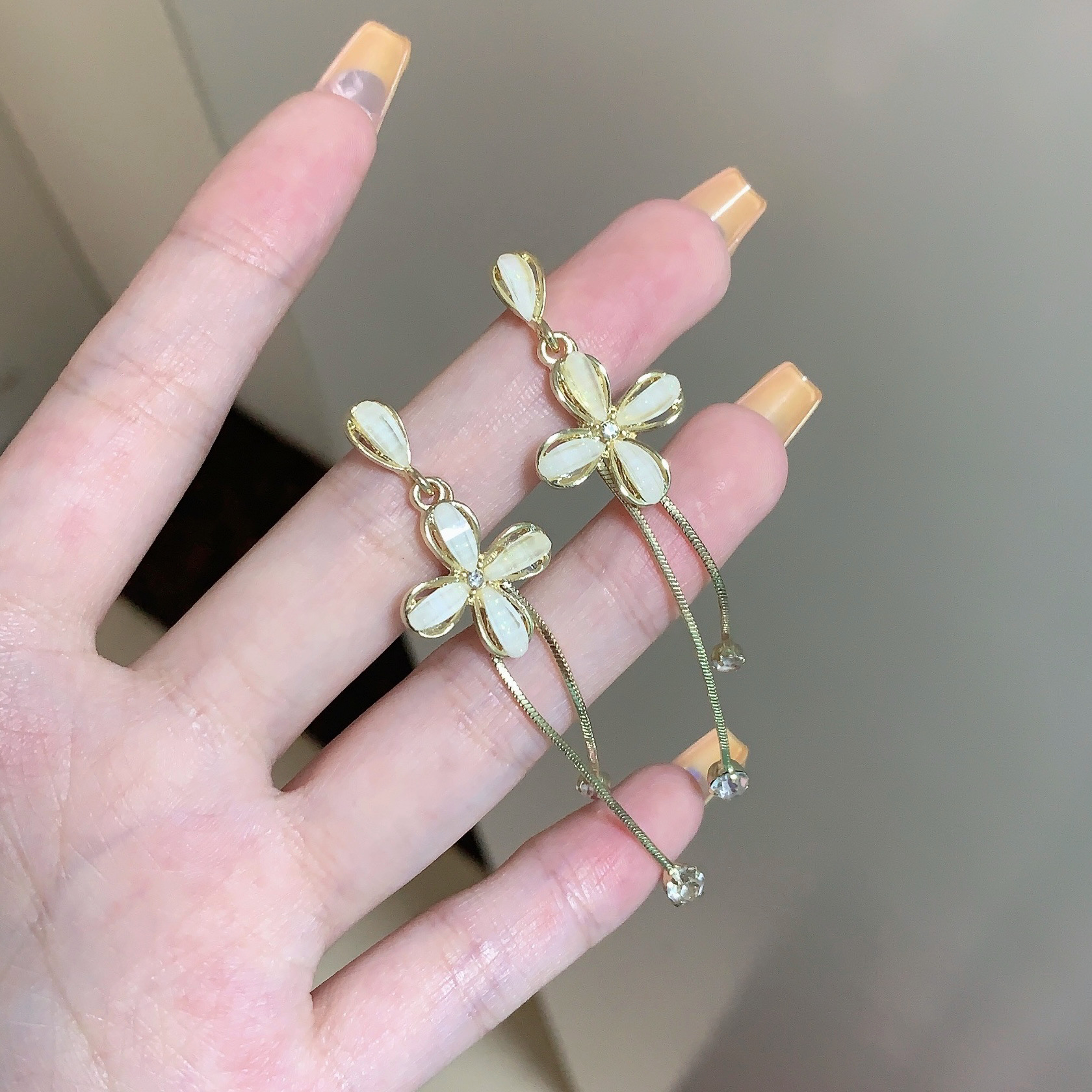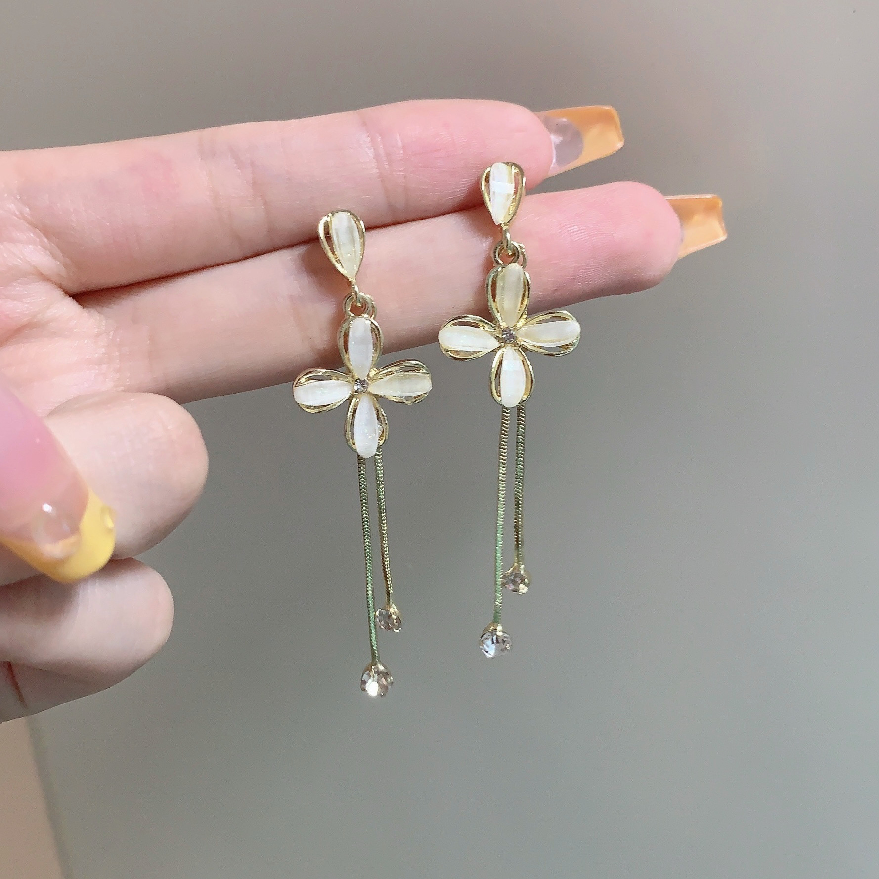 ins潮镶钻S925银针韩国新款长款流苏耳环女花朵耳钉网红同款耳饰