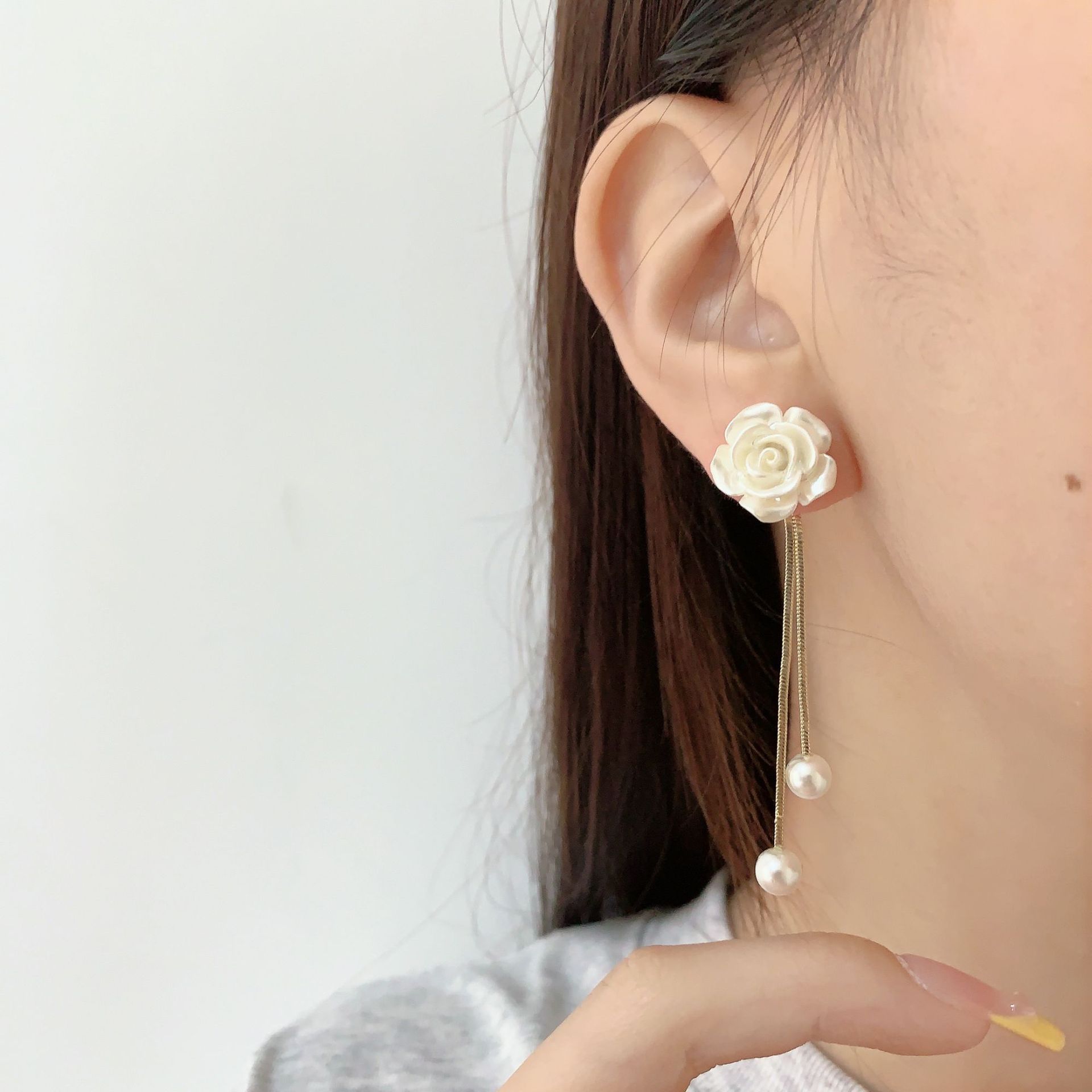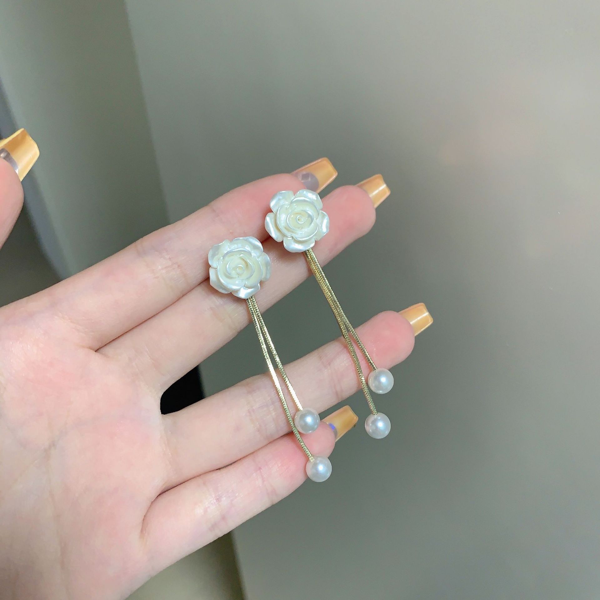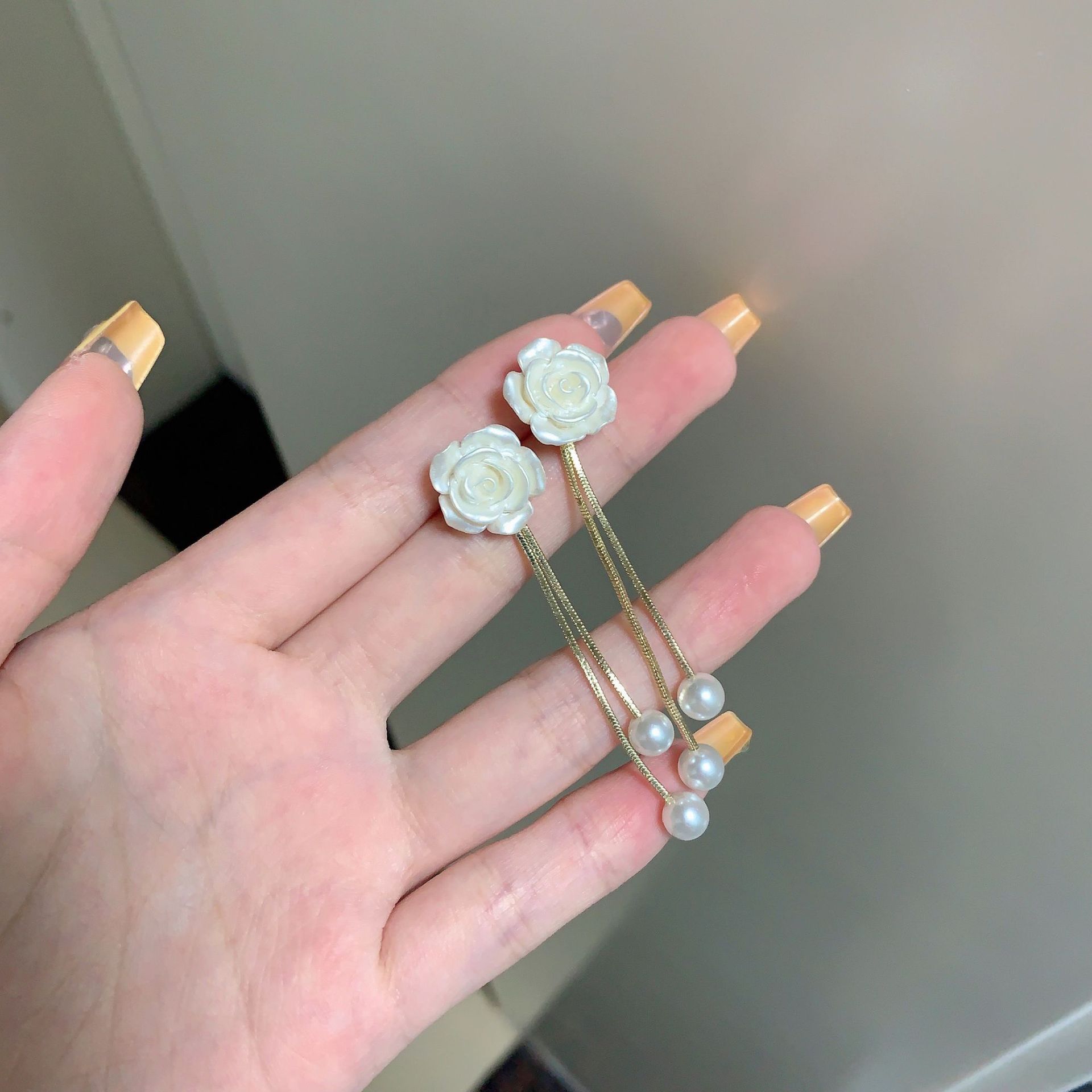 小众设计耳钉白色山茶花流苏耳坠女珍珠吊坠气质耳饰气质高级花朵