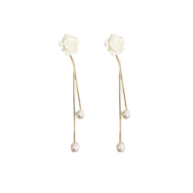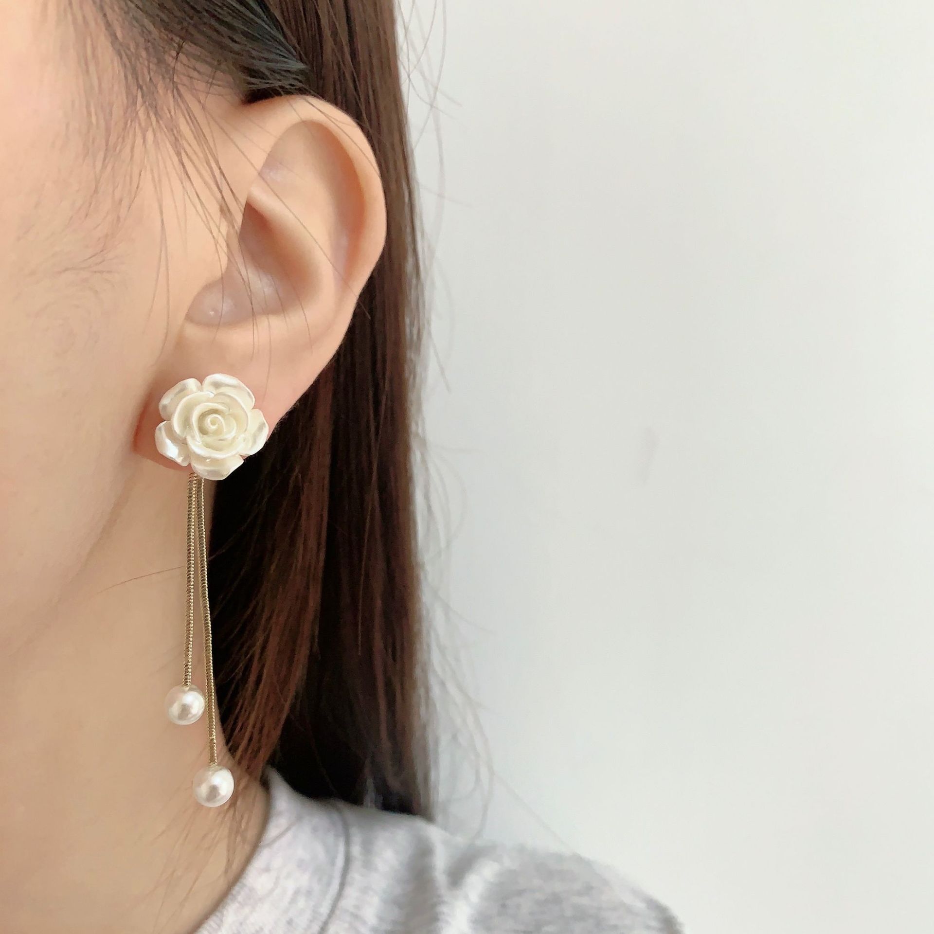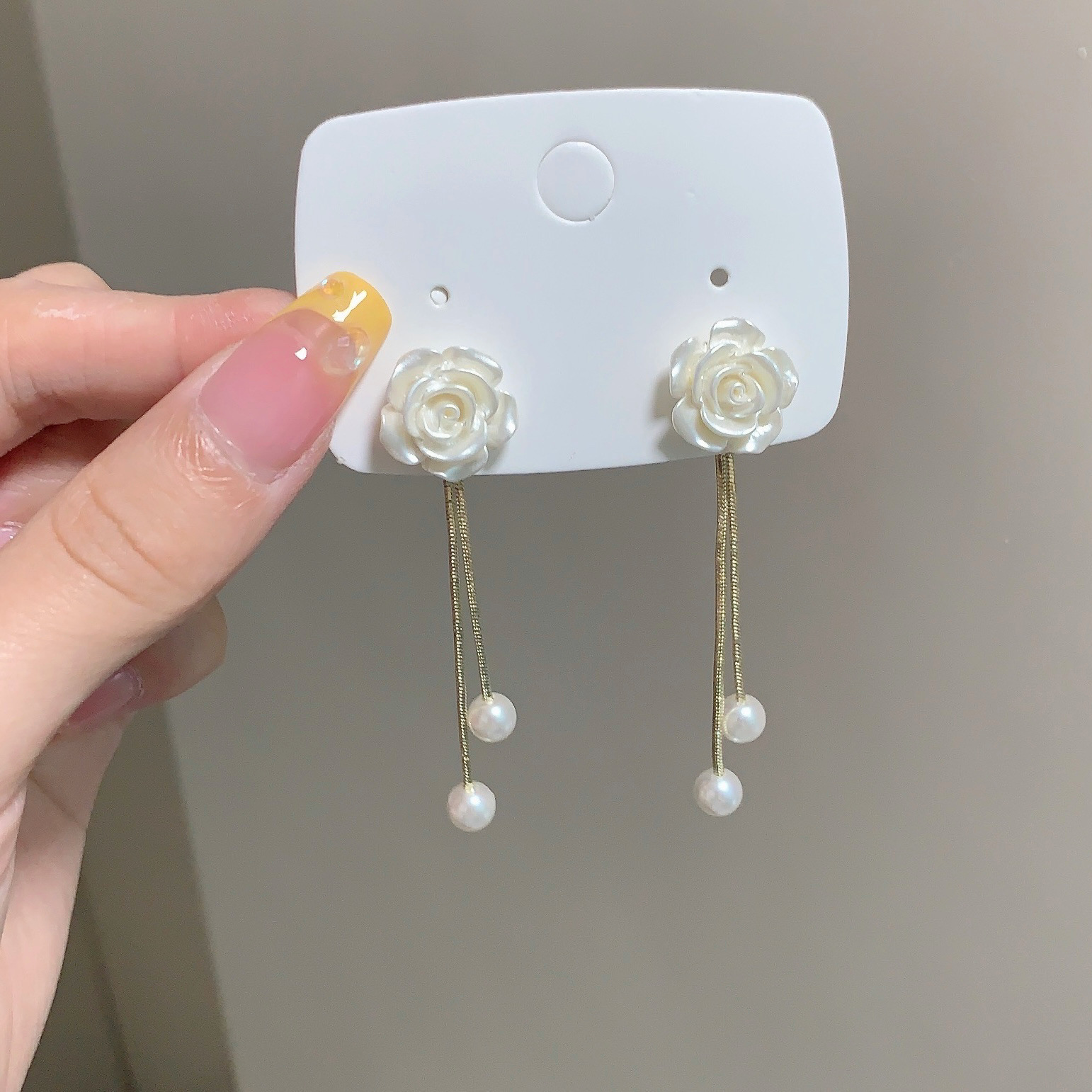 小众设计耳钉白色山茶花流苏耳坠女珍珠吊坠气质耳饰气质高级花朵