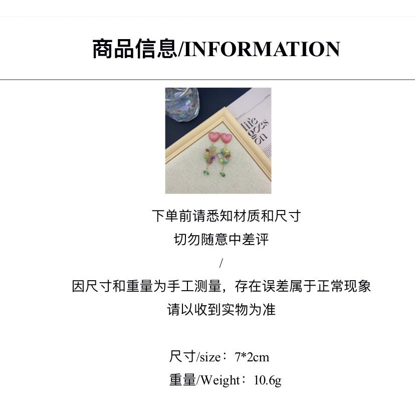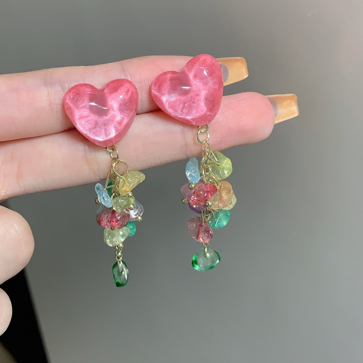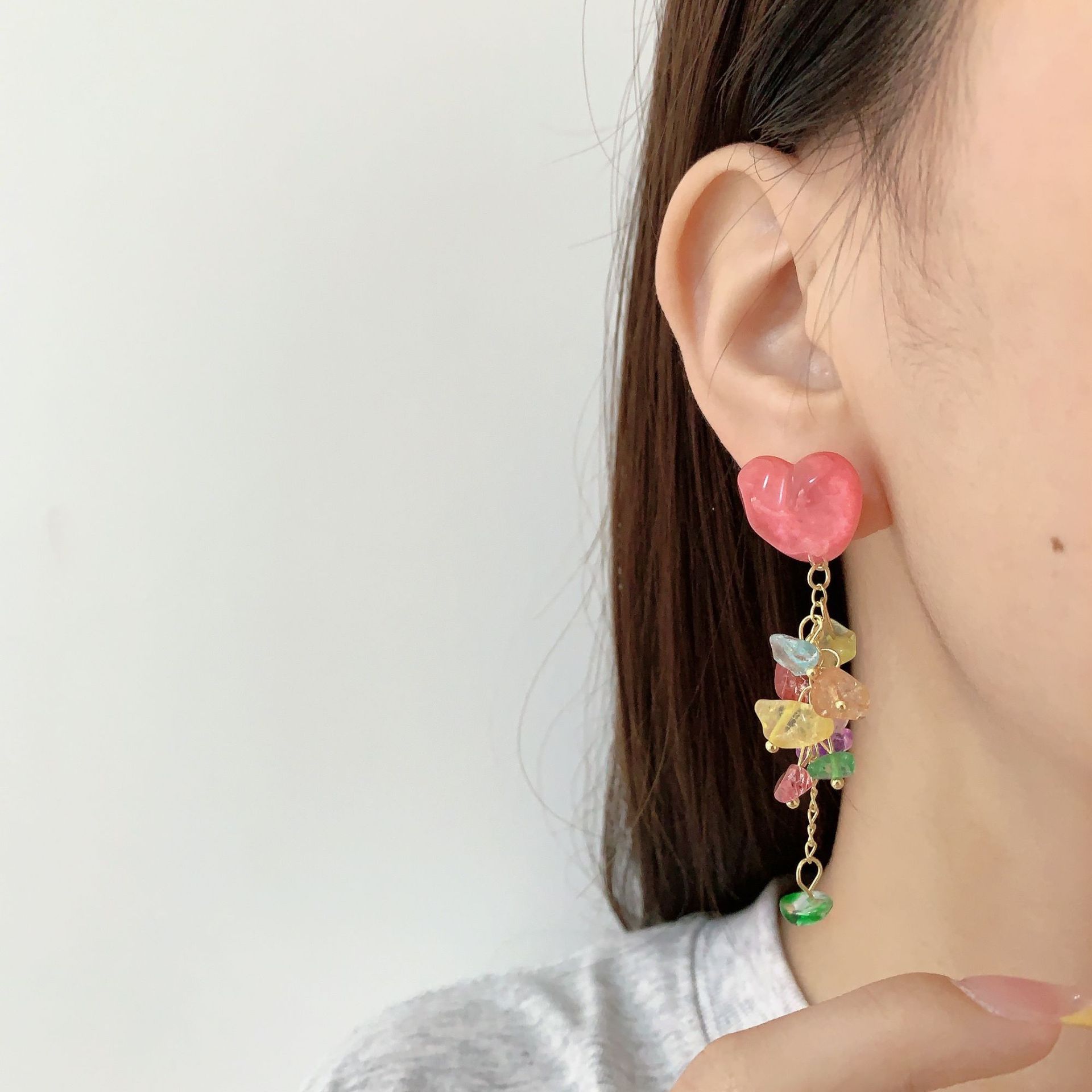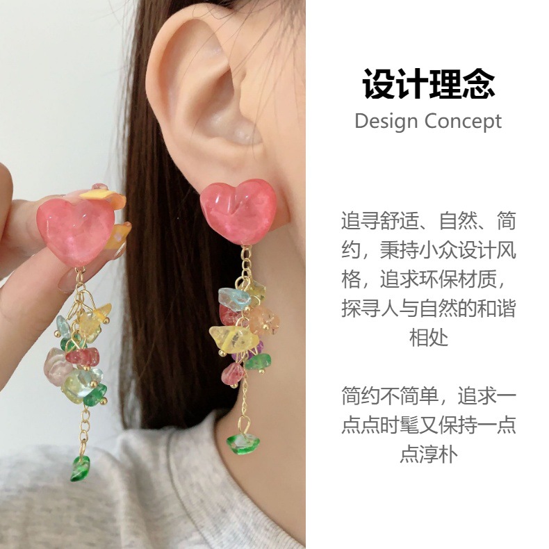 爱心碎石新款甜美设计感小众气质潮耳环彩色流苏耳钉女显脸小耳饰