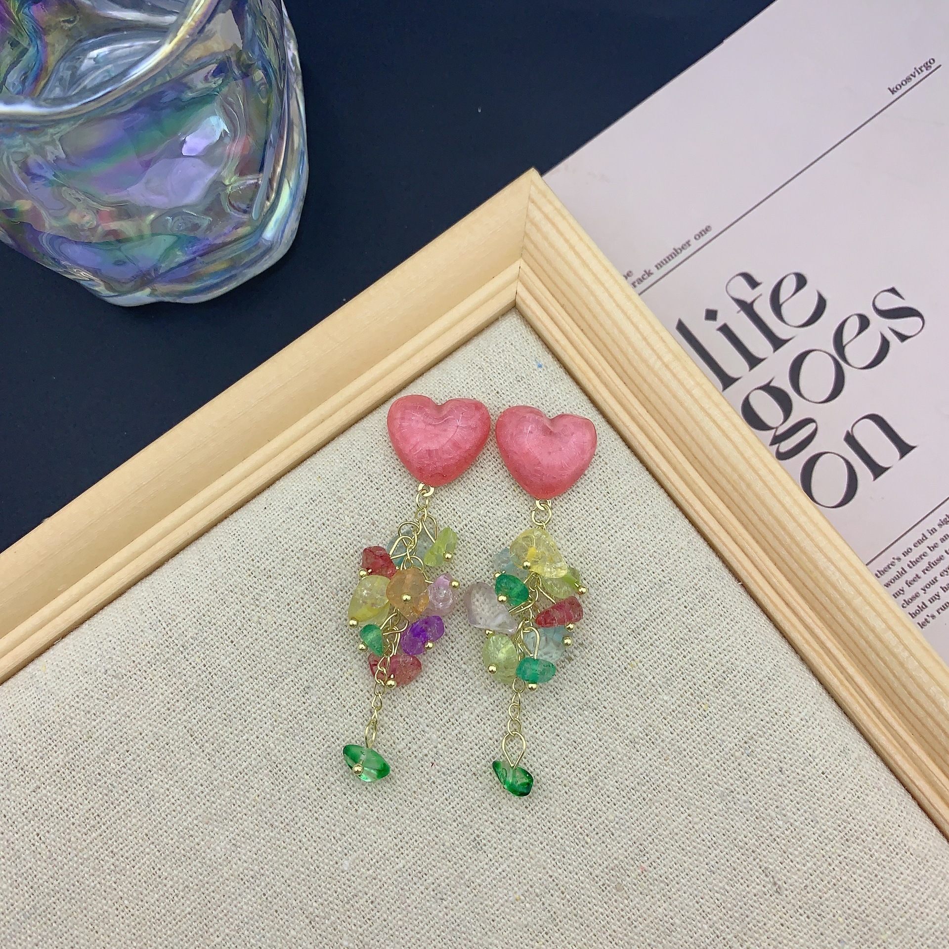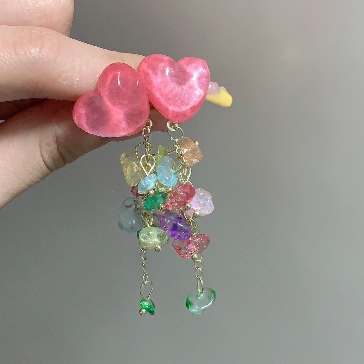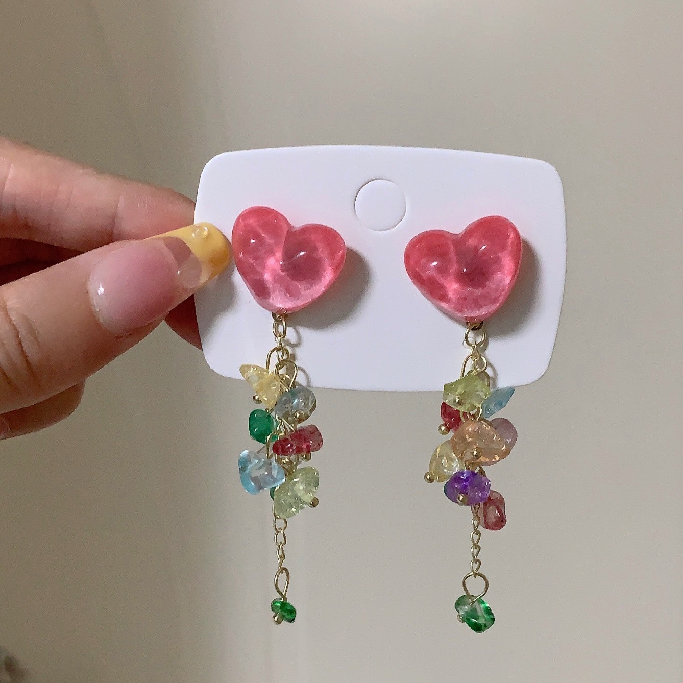 爱心碎石新款甜美设计感小众气质潮耳环彩色流苏耳钉女显脸小耳饰