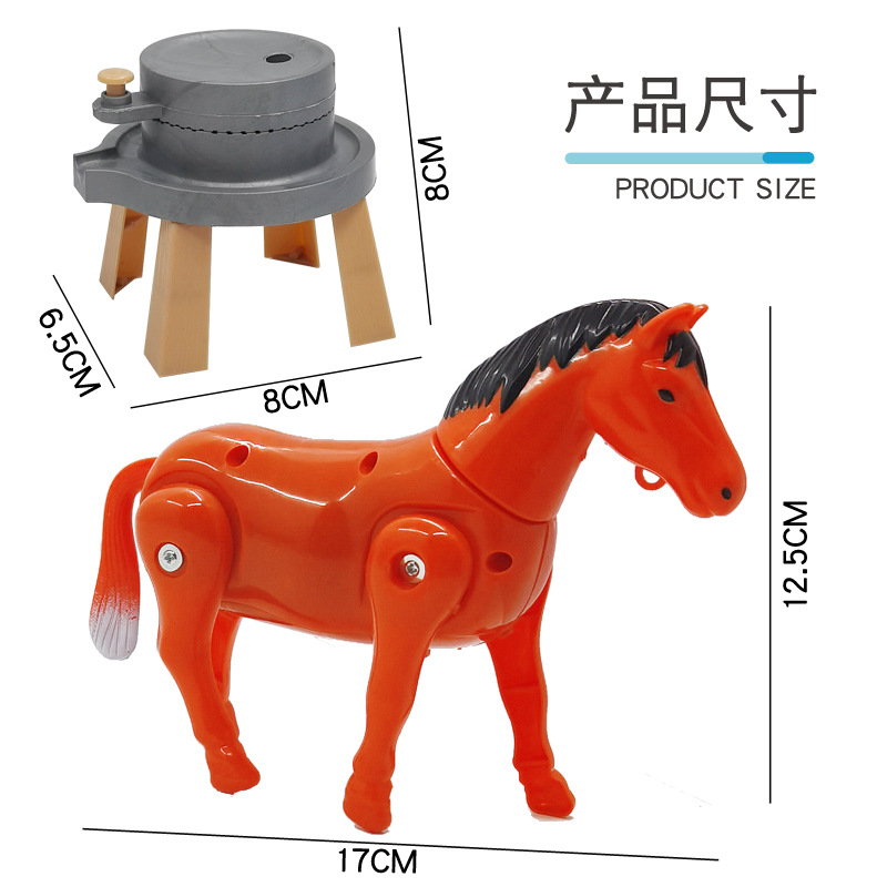 装入一节5号电池,用手向上抬一下马儿的尾 巴,马的4 条腿会像真的一样跑起来,另附有趣味磨盘,绳子一头系在磨盘上,另一头系在马的嘴 角处,这样马会以树桩为中心来回转圈。还有 种玩法,宝宝可以直接牵着绳子在前面走,让马跑起来吧。