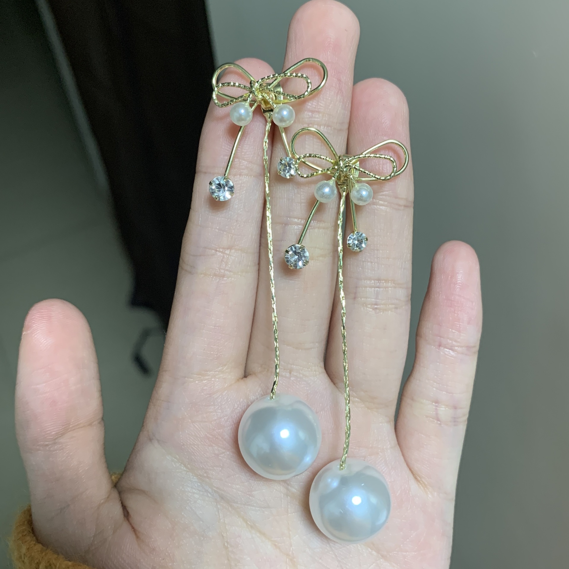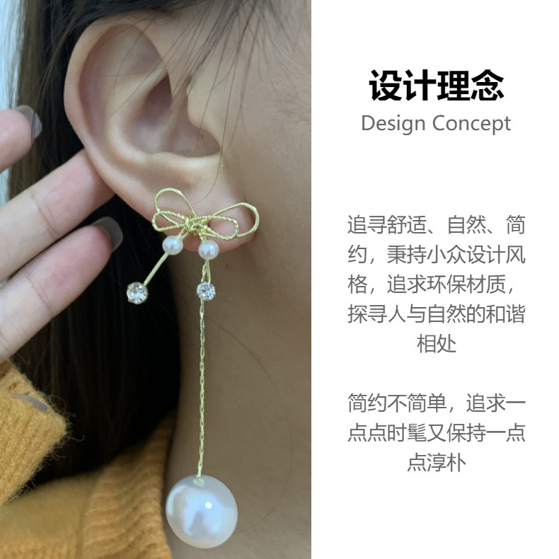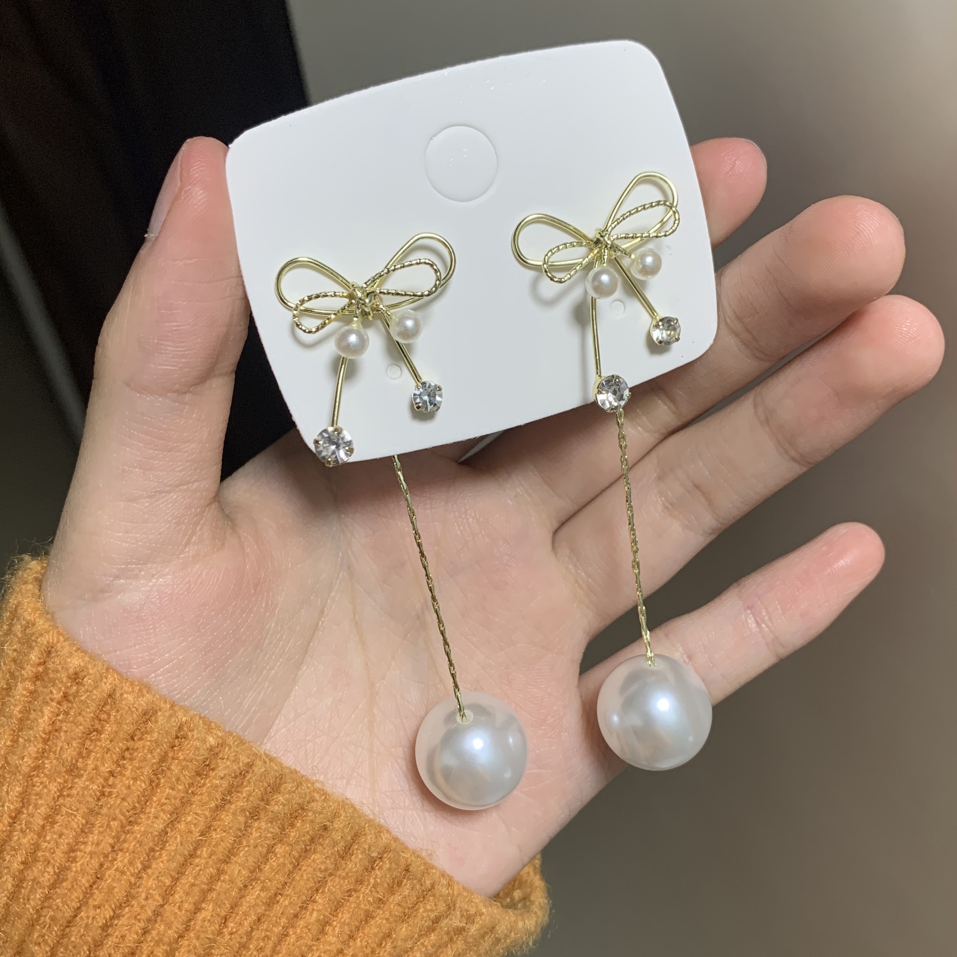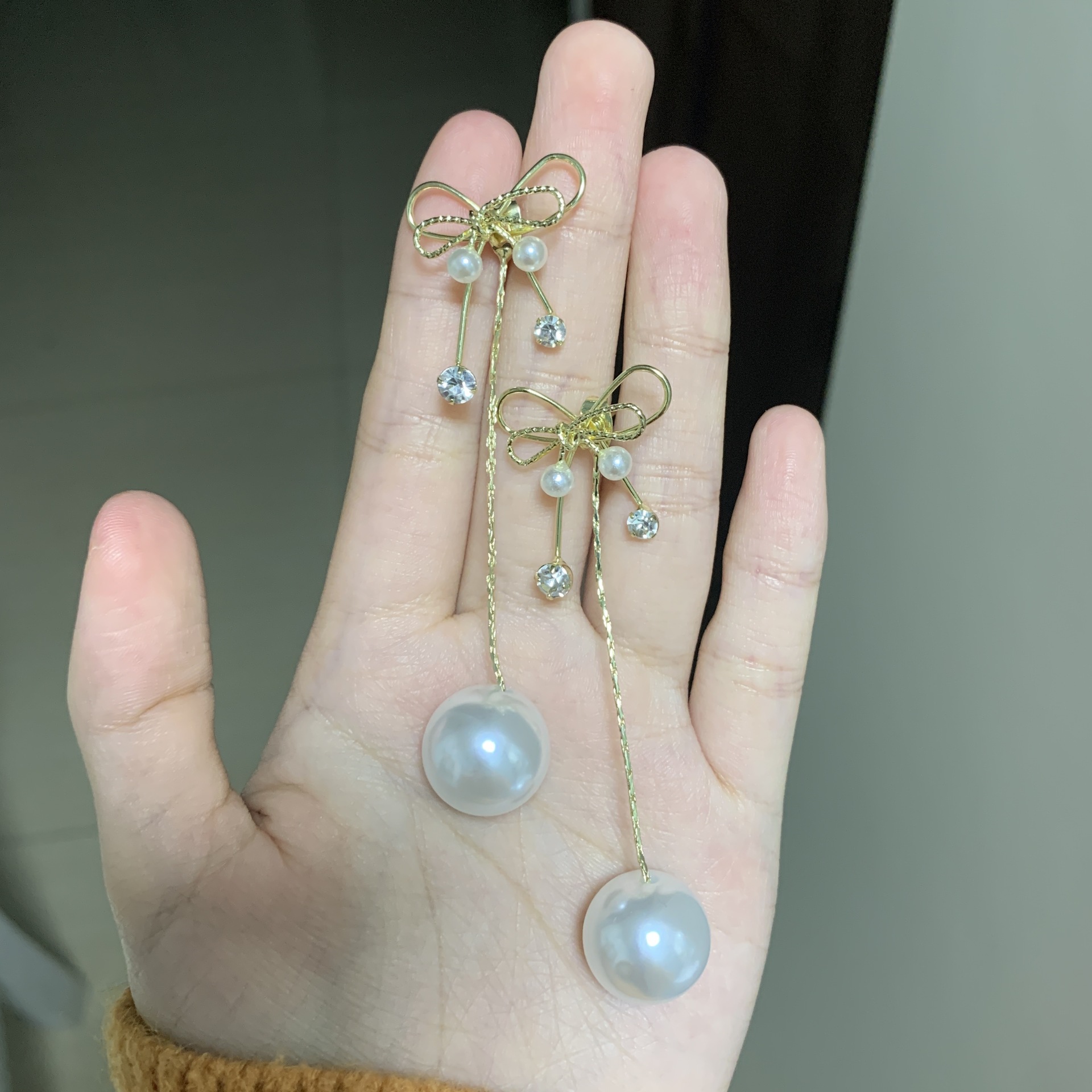 S925银针双层蝴蝶结耳饰新款锆石耳钉一款两戴法式珍珠流苏耳环女