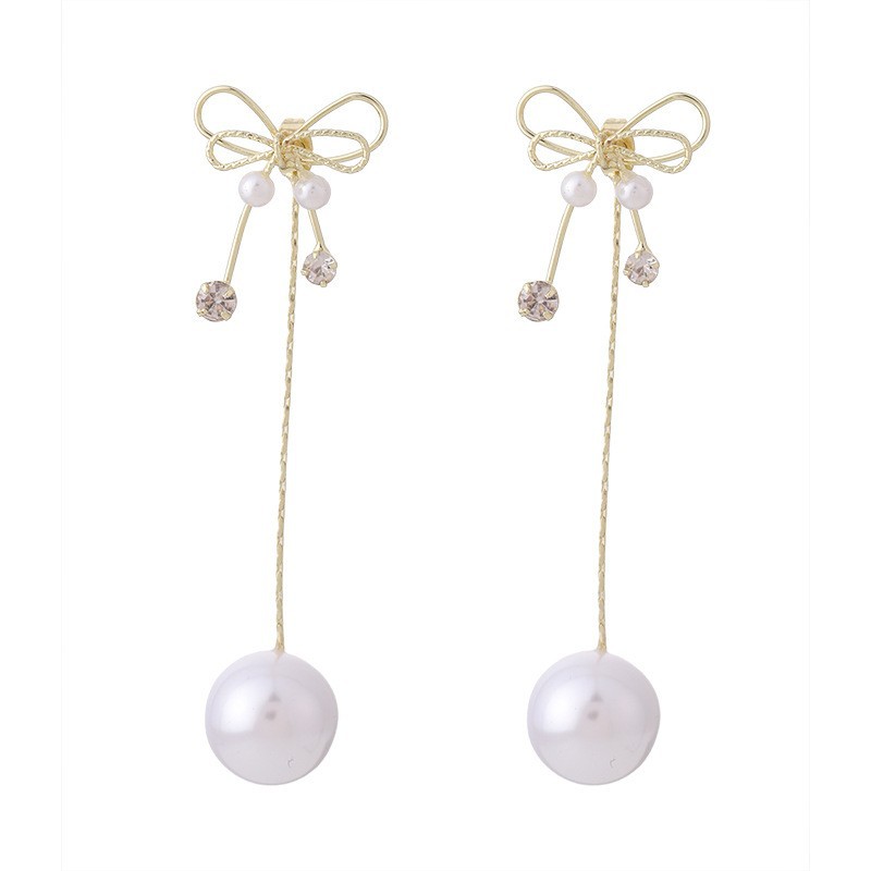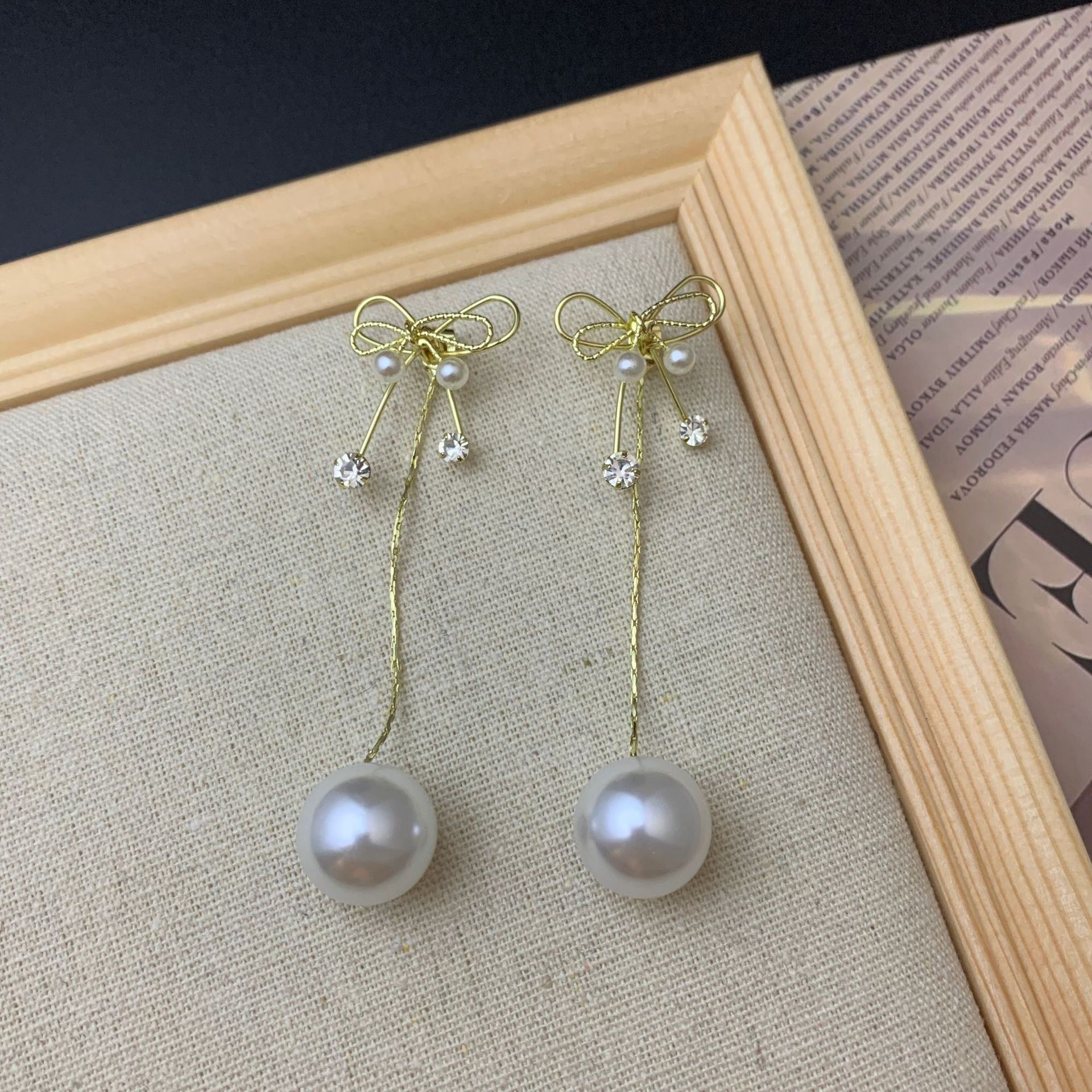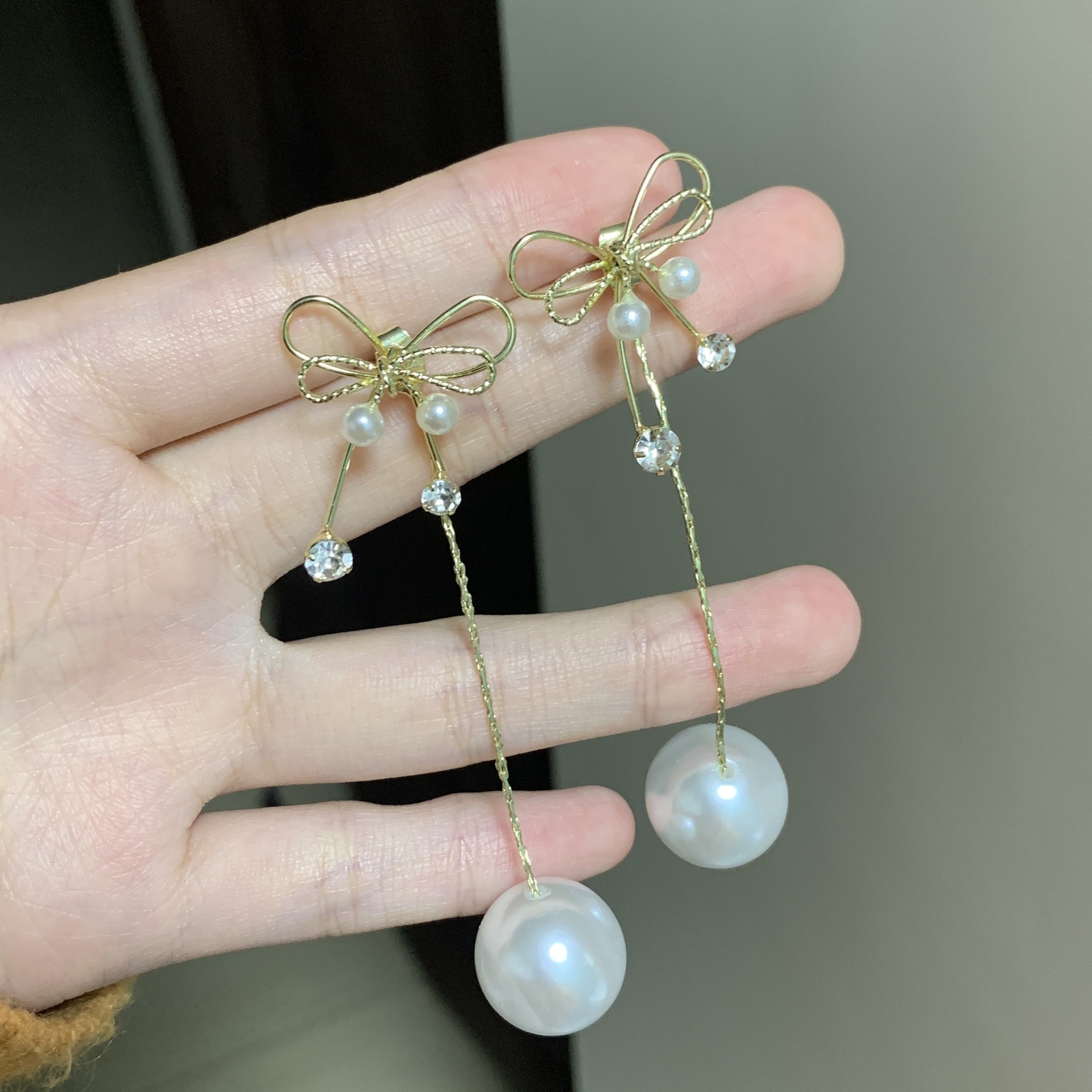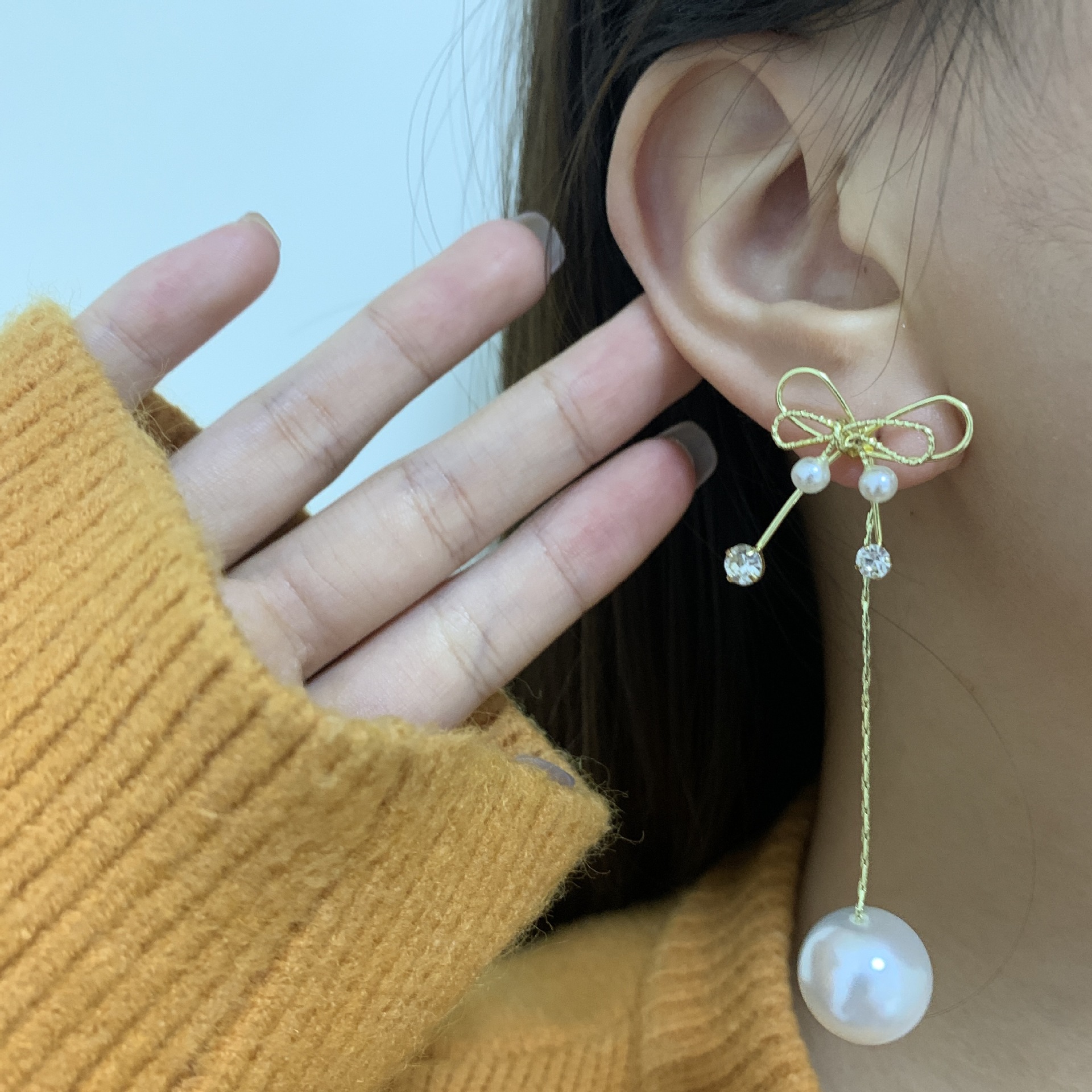 S925银针双层蝴蝶结耳饰新款锆石耳钉一款两戴法式珍珠流苏耳环女