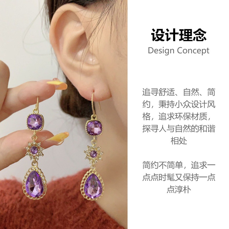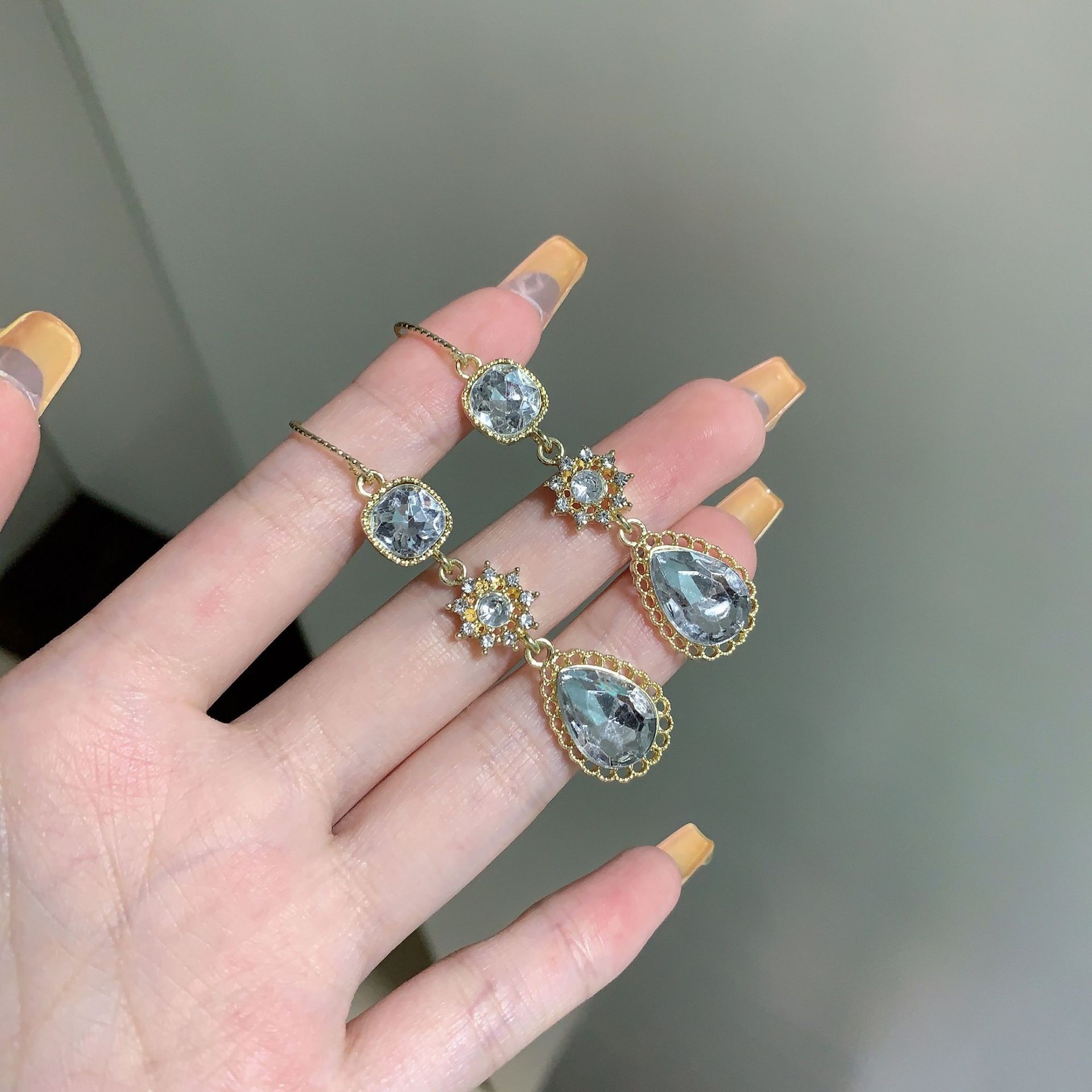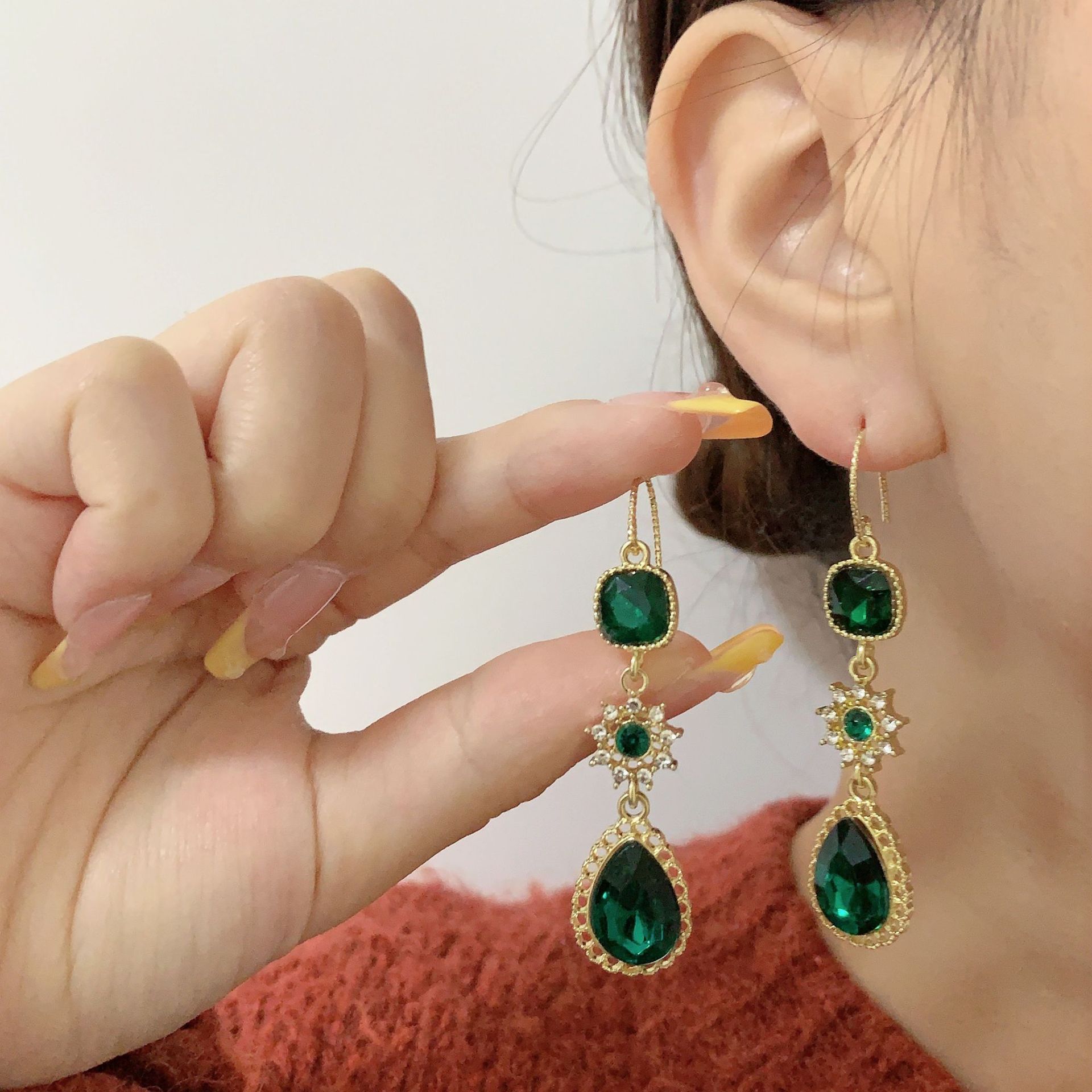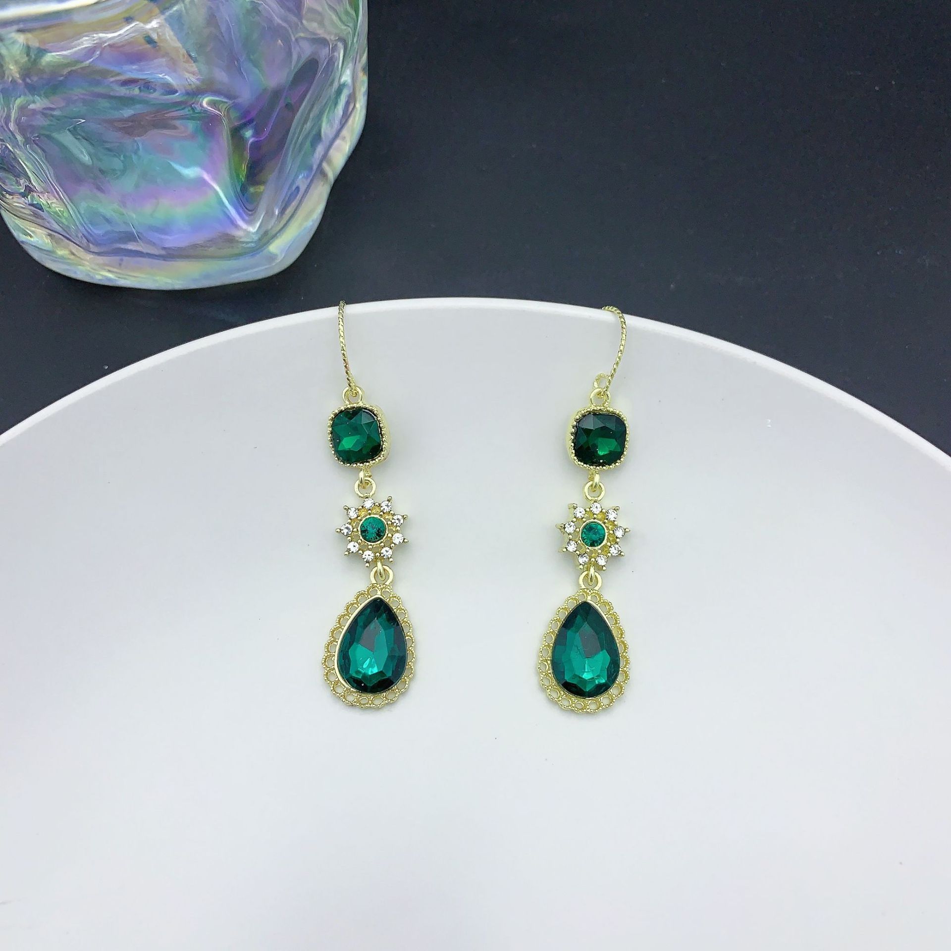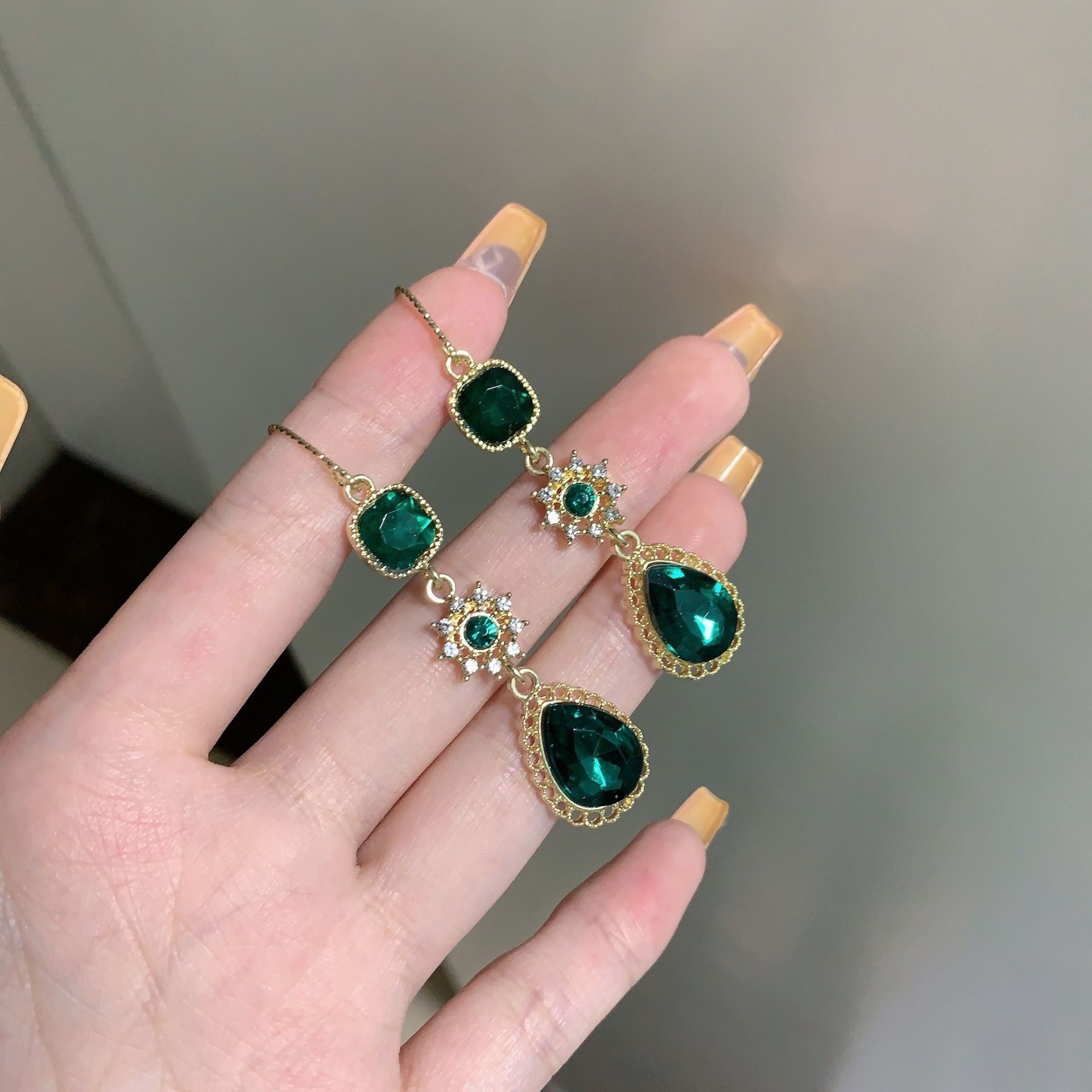 绿色宫廷风复古高级水晶镶钻项链耳环套装感长款流苏耳坠耳环耳饰