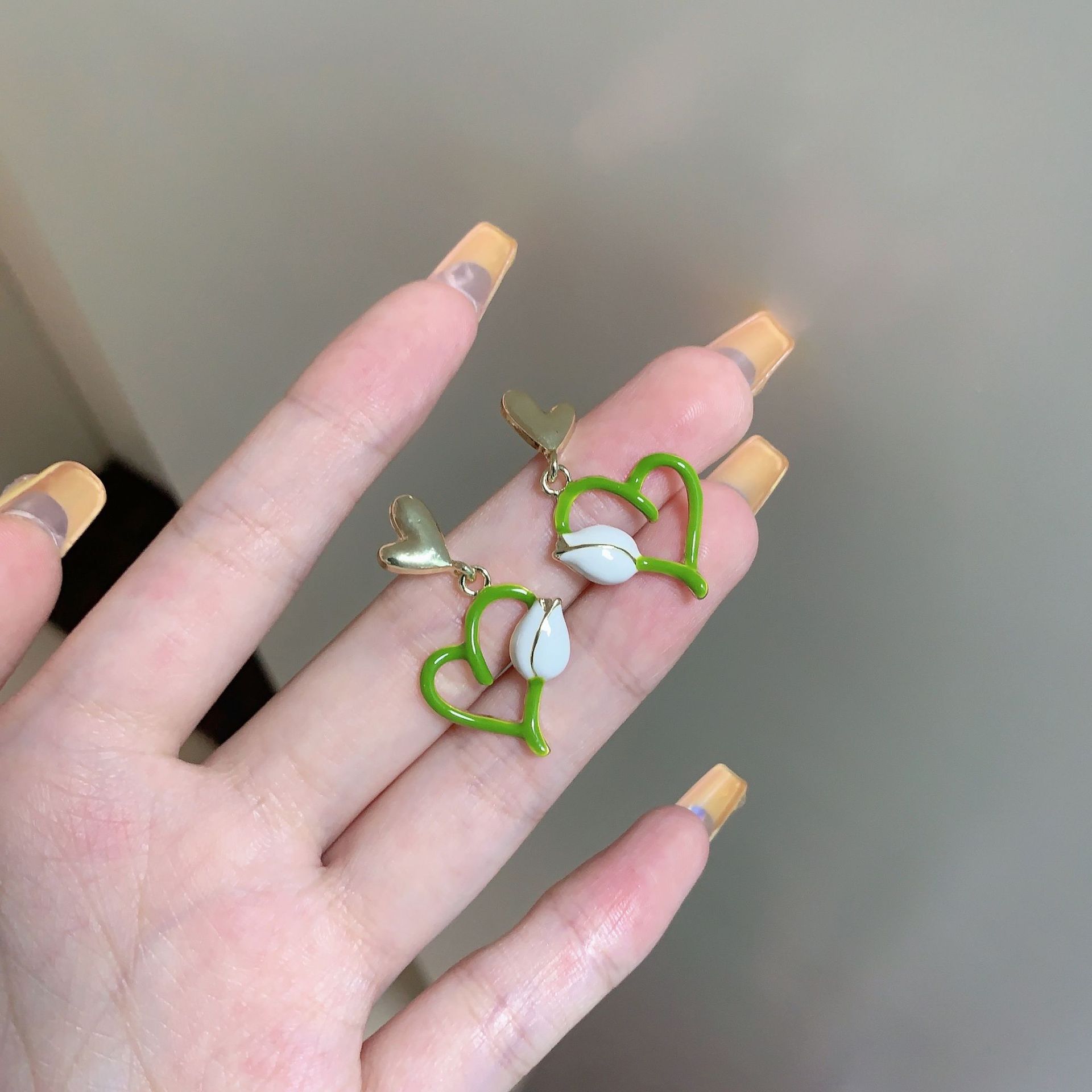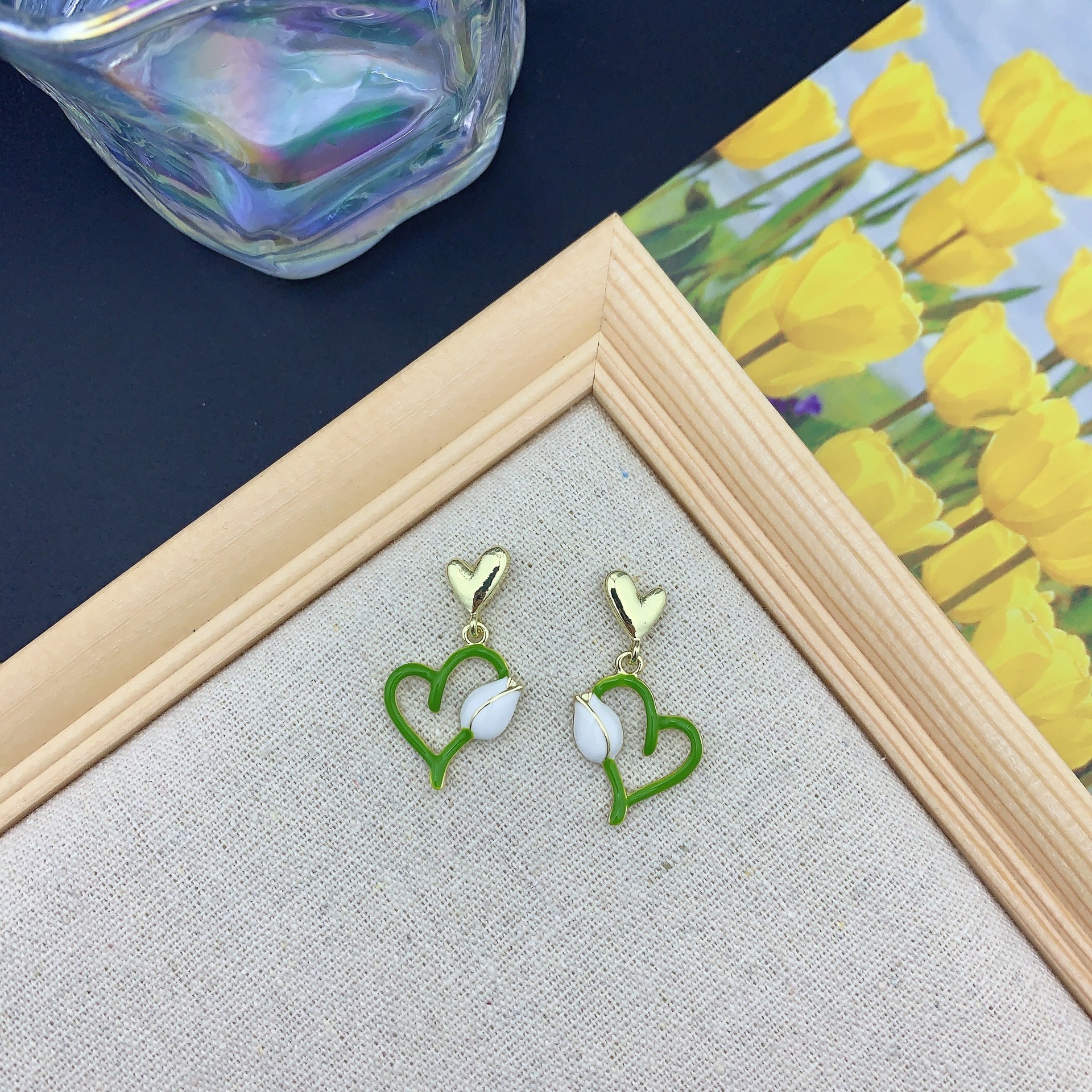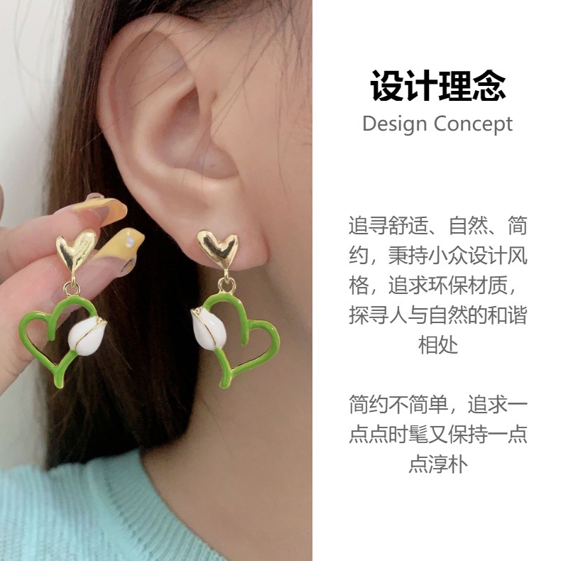 精致简约新款小清新绿色郁金香女耳环爱心耳钉银针设计感夏季耳饰