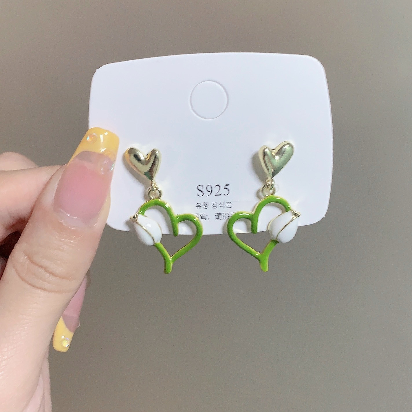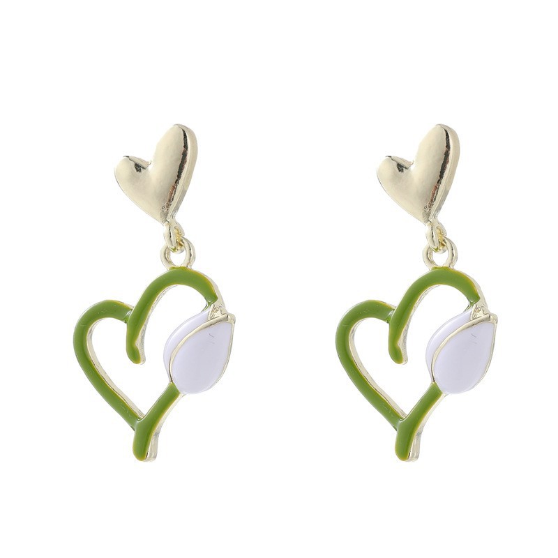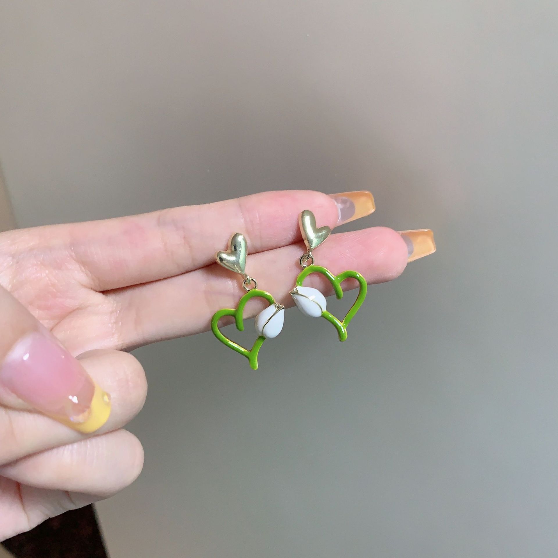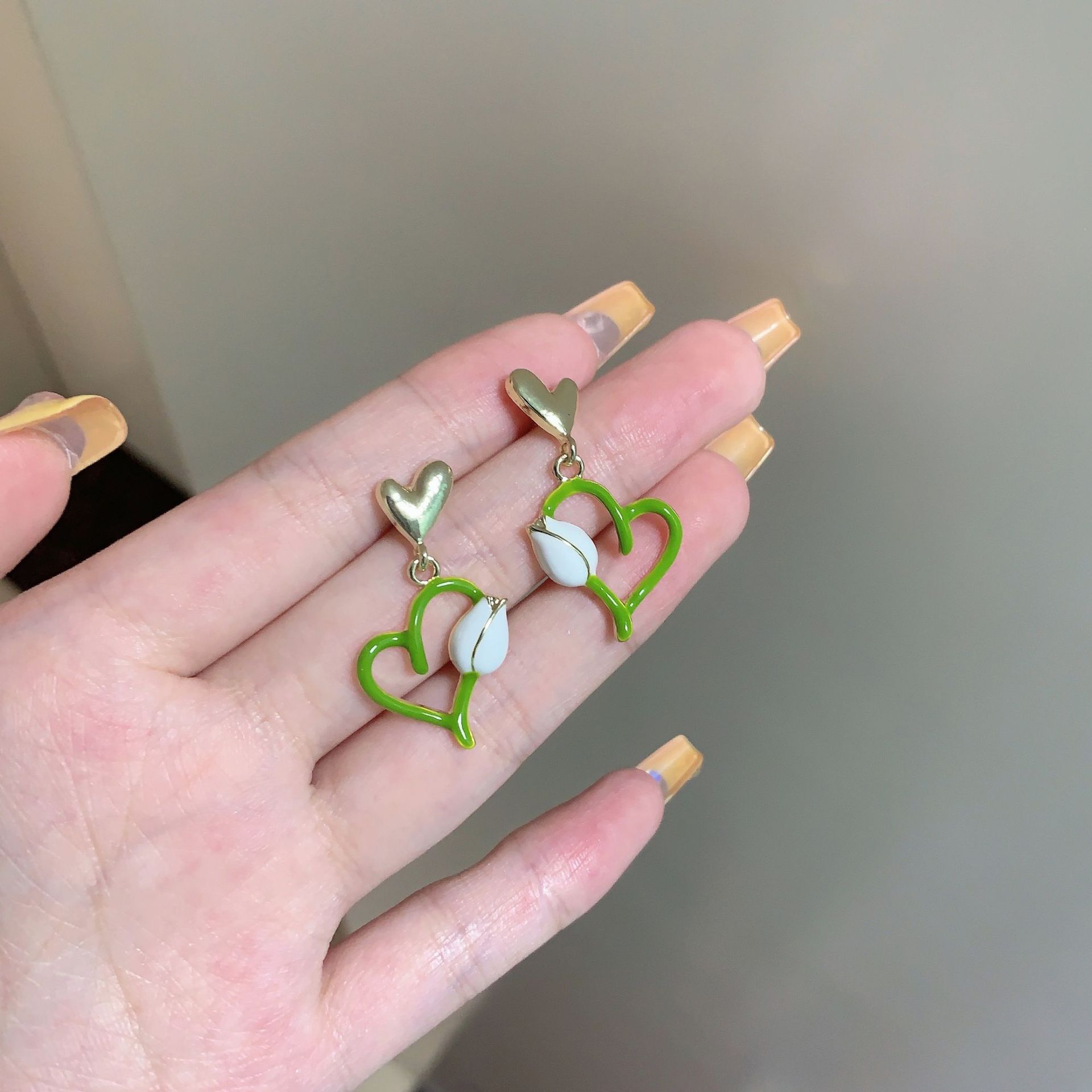 精致简约新款小清新绿色郁金香女耳环爱心耳钉银针设计感夏季耳饰