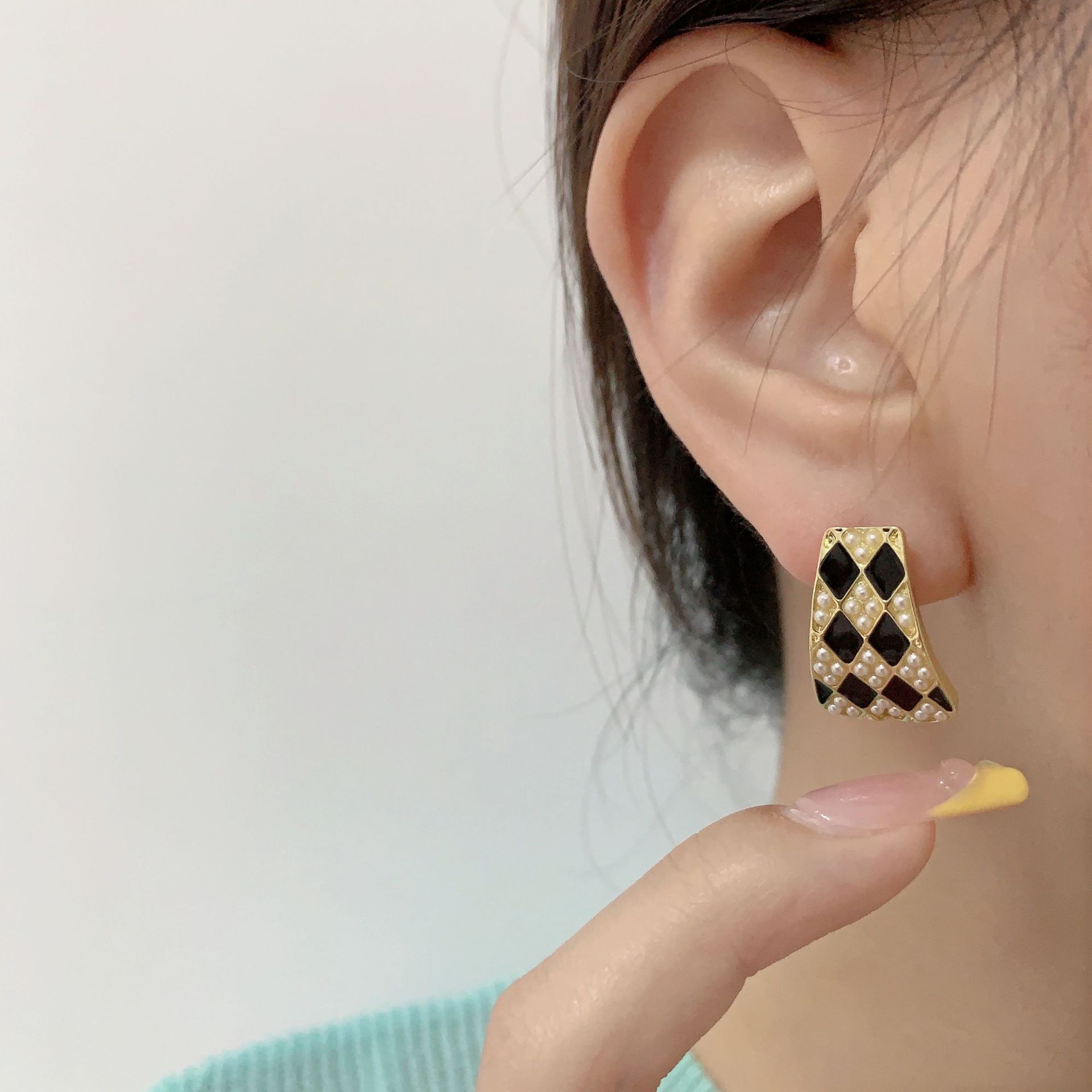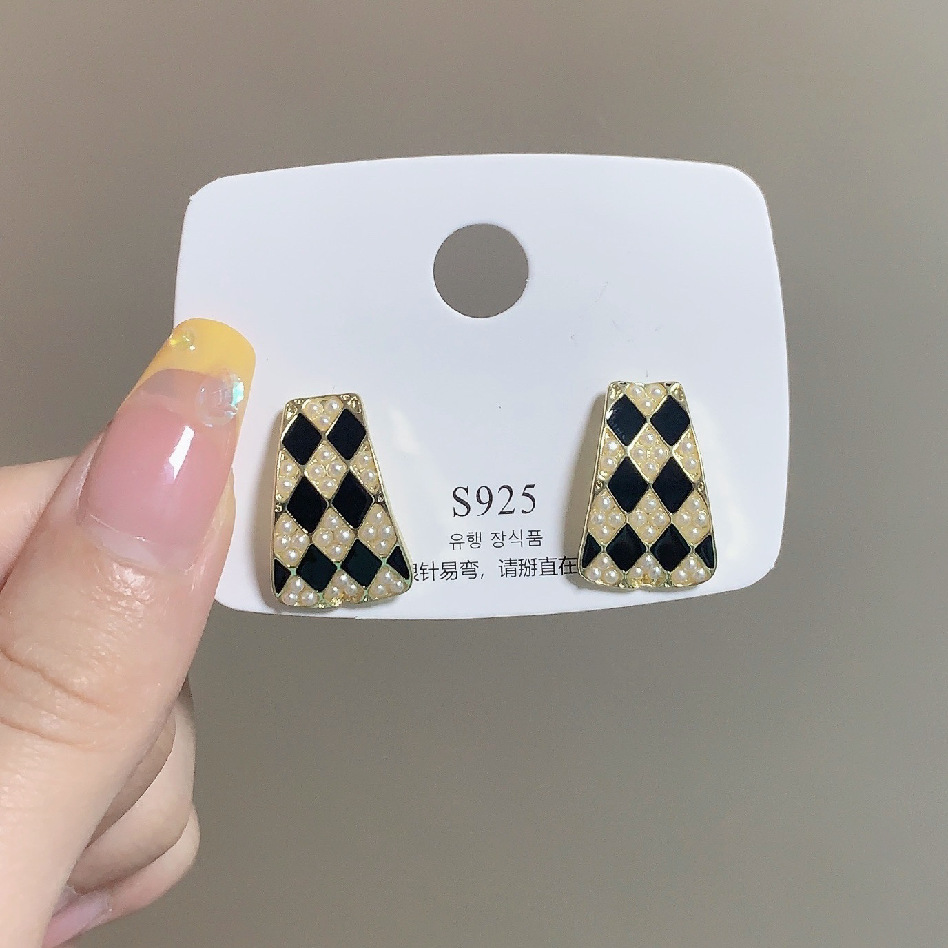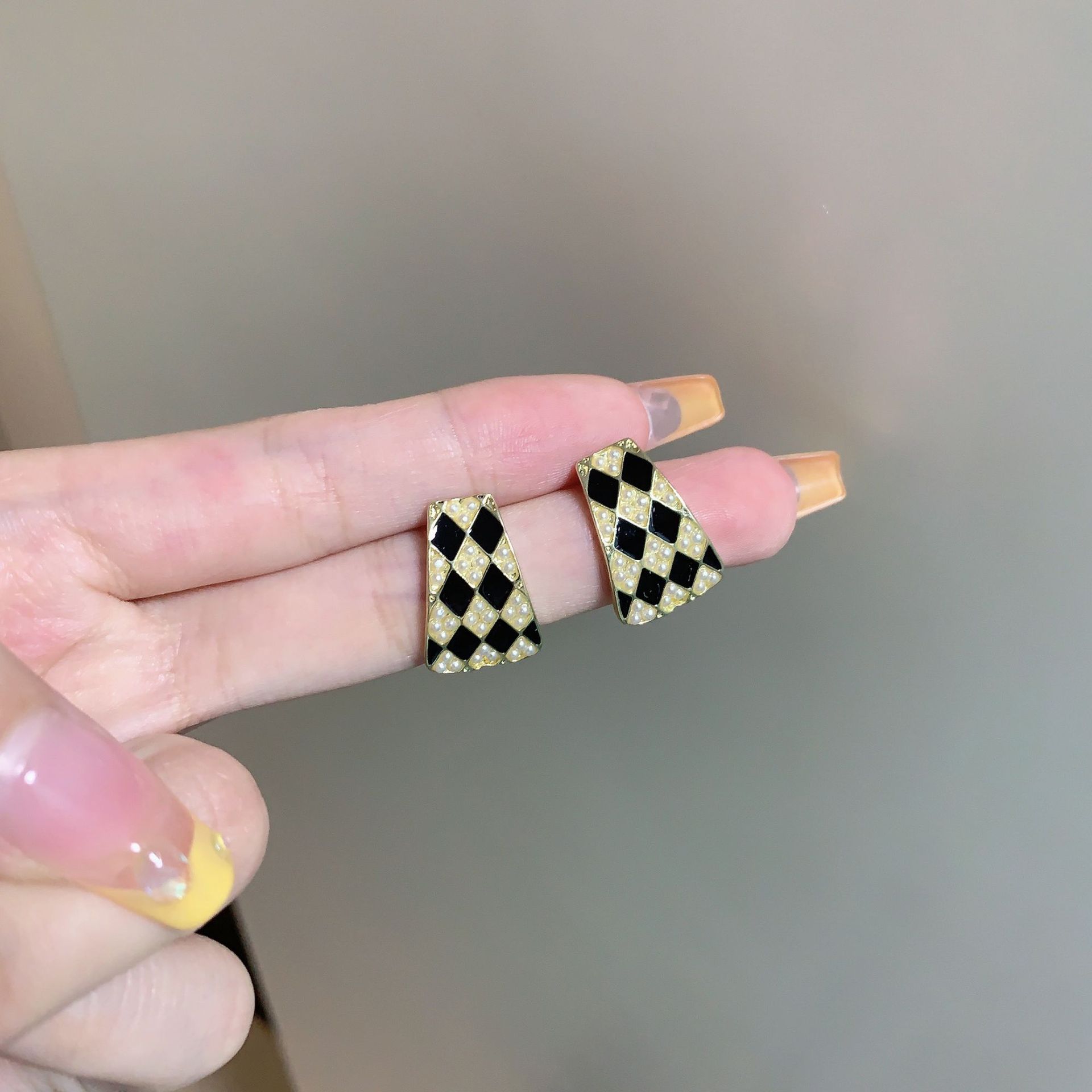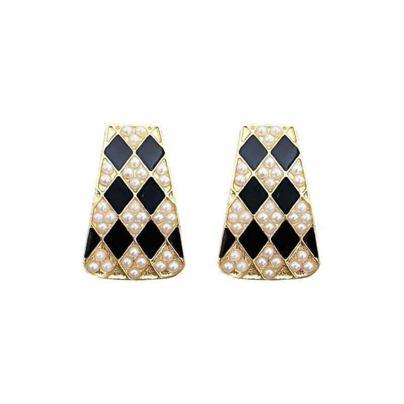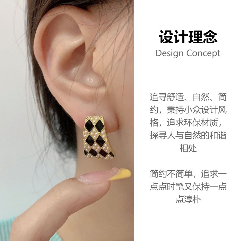s925银针几何珍珠气质高级设计感耳钉韩国法式复古黑白棋盘格耳环