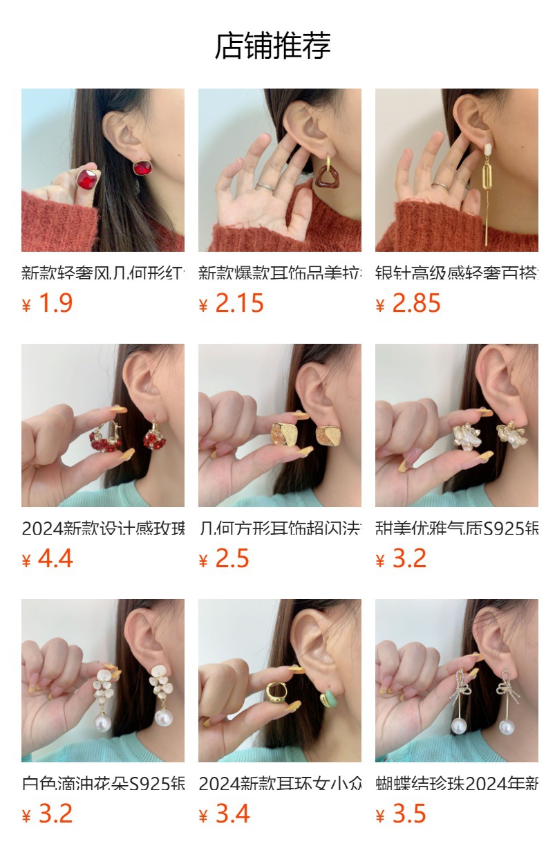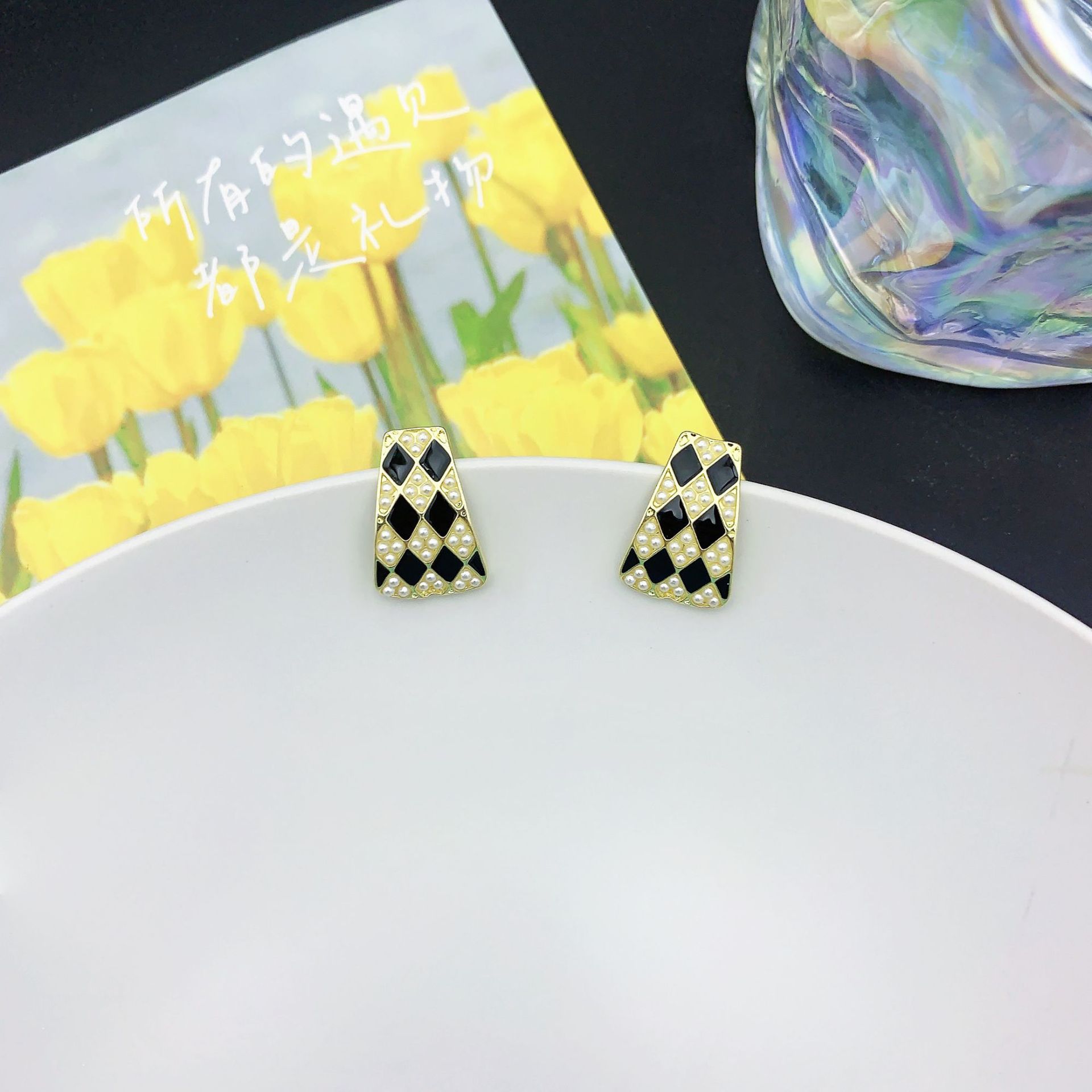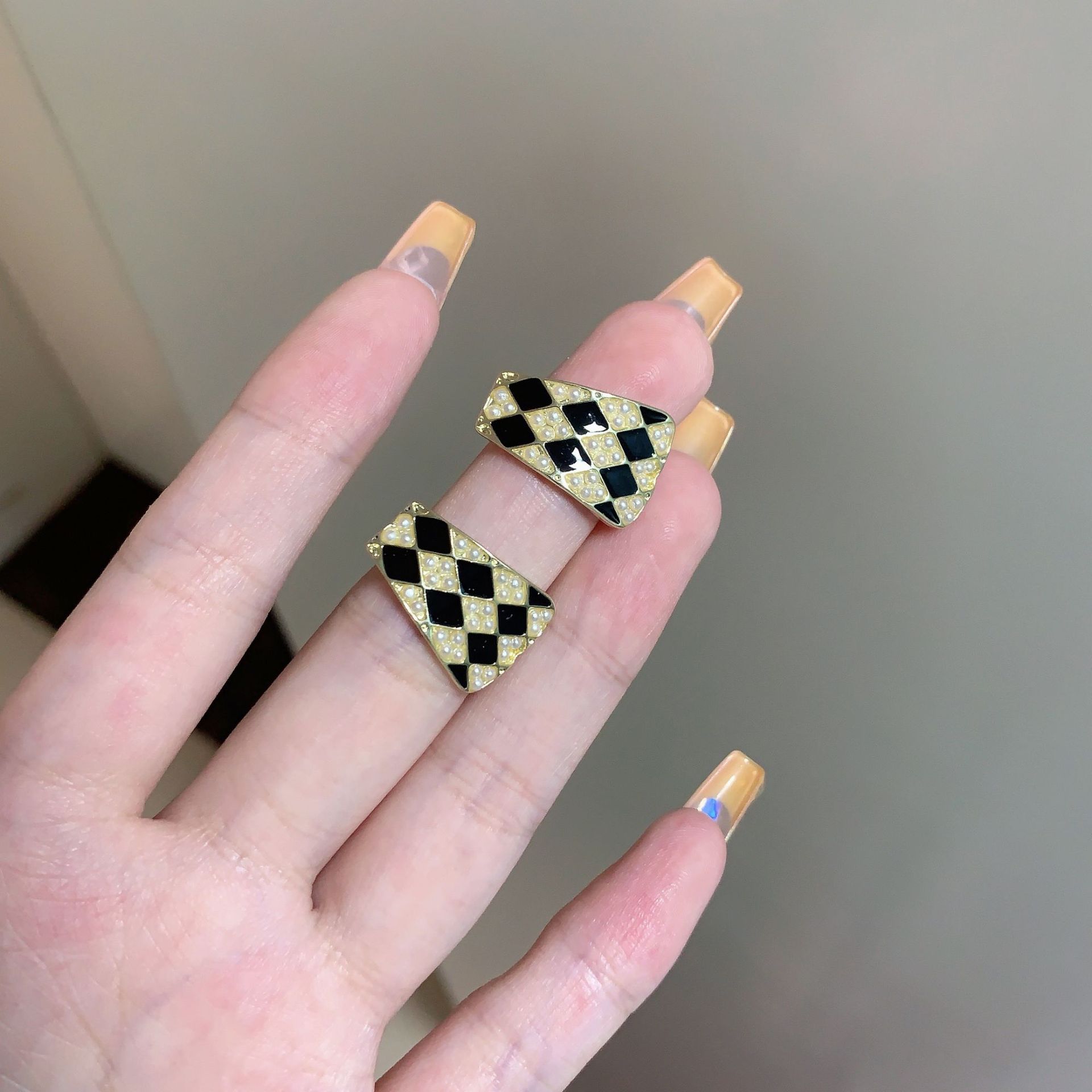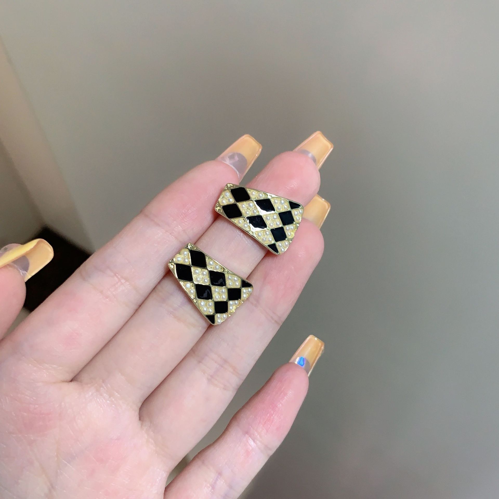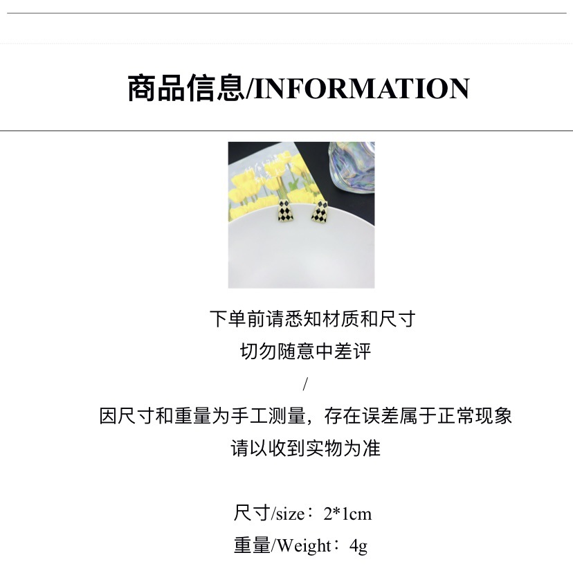 s925银针几何珍珠气质高级设计感耳钉韩国法式复古黑白棋盘格耳环
