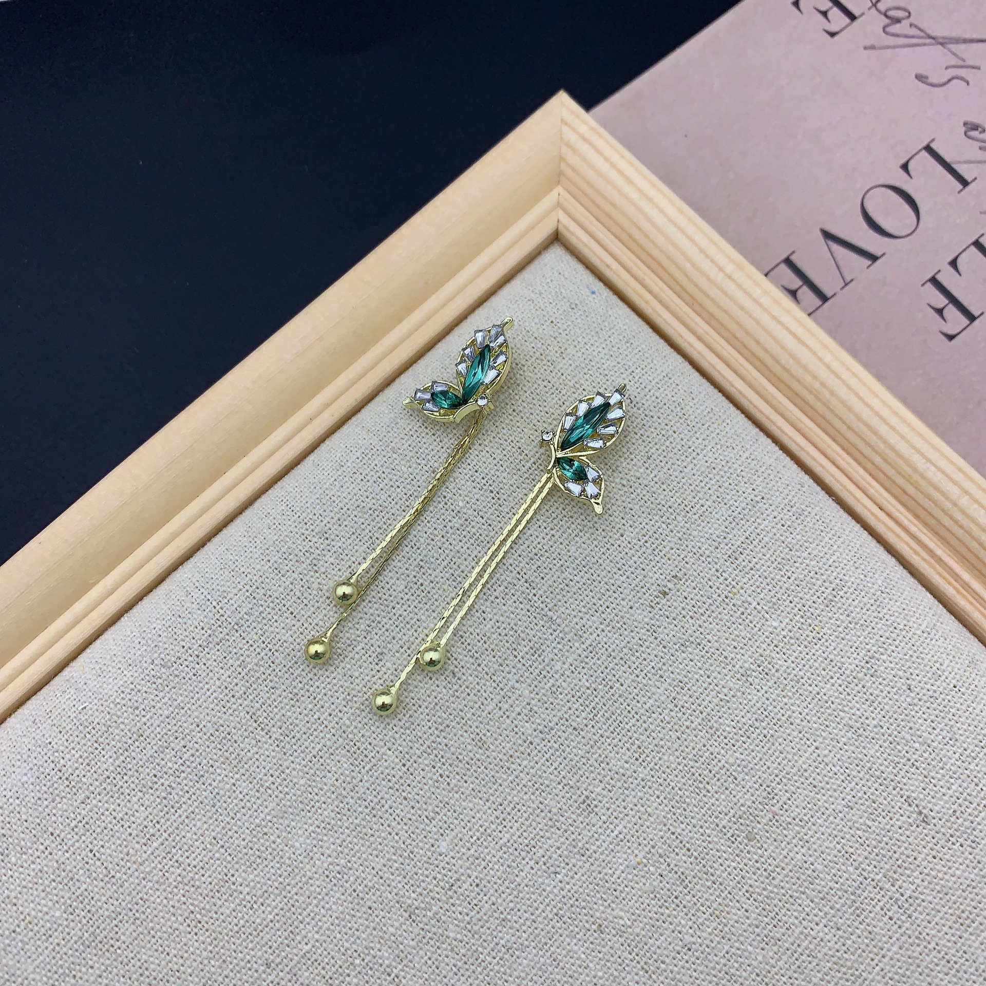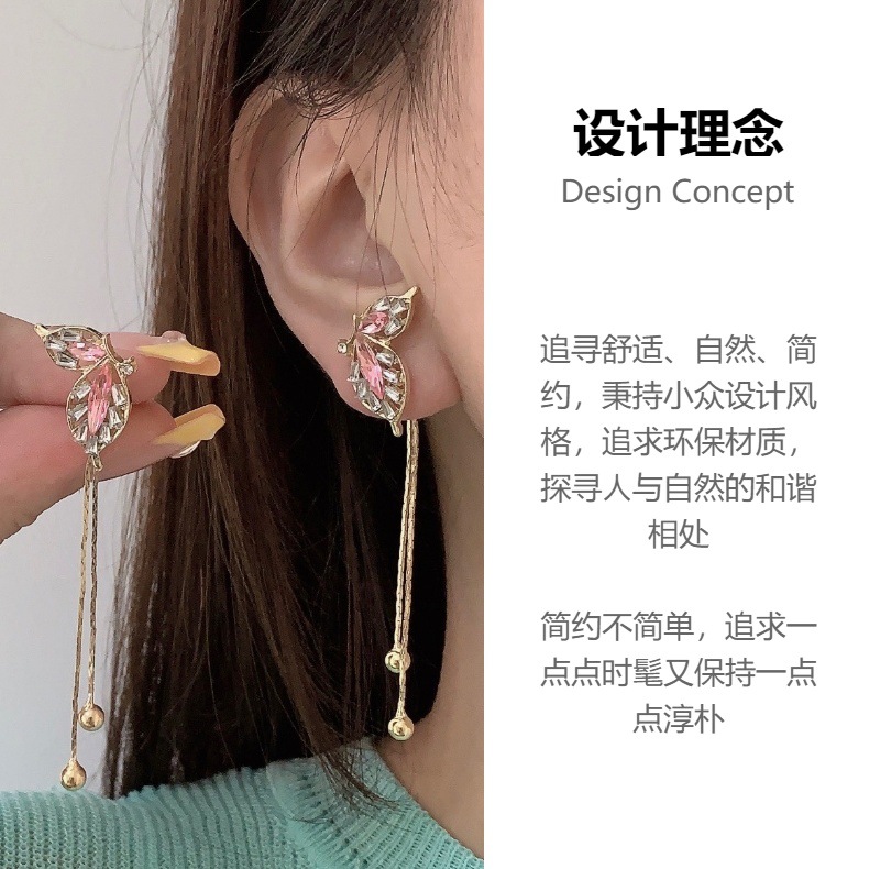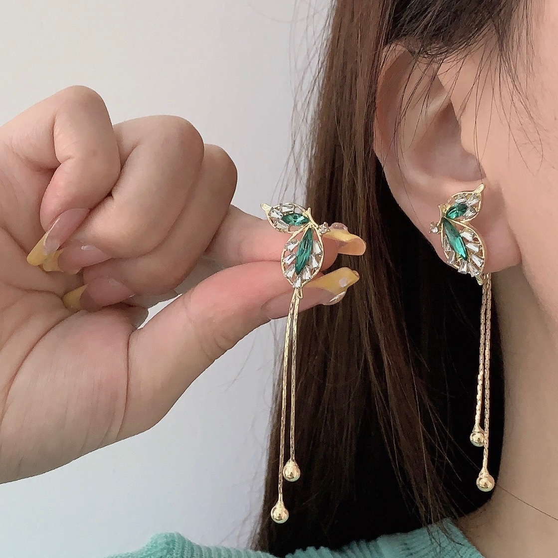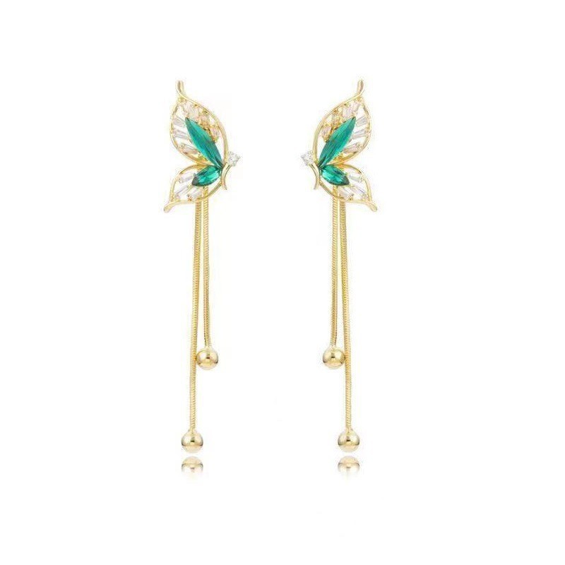 设计感韩式新款气质时尚耳饰s925银针绿色蝴蝶翅膀流苏耳钉女耳环