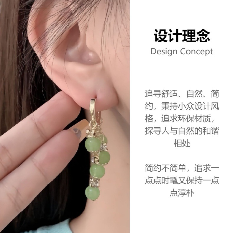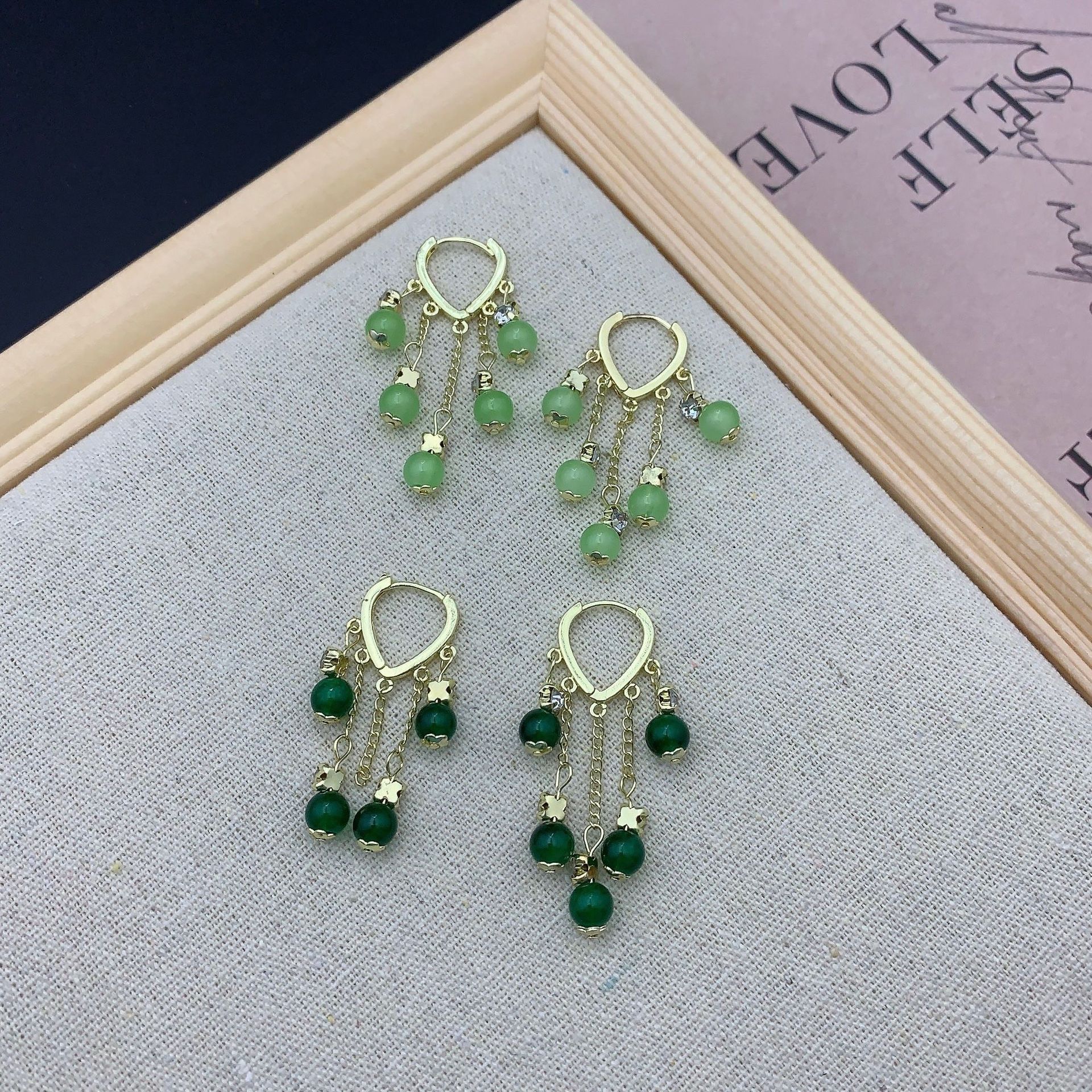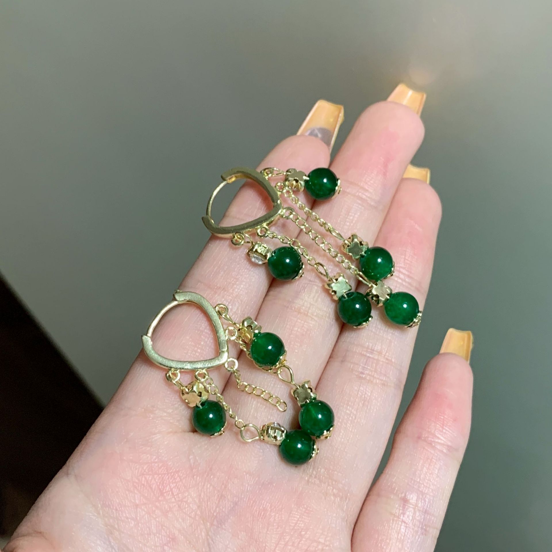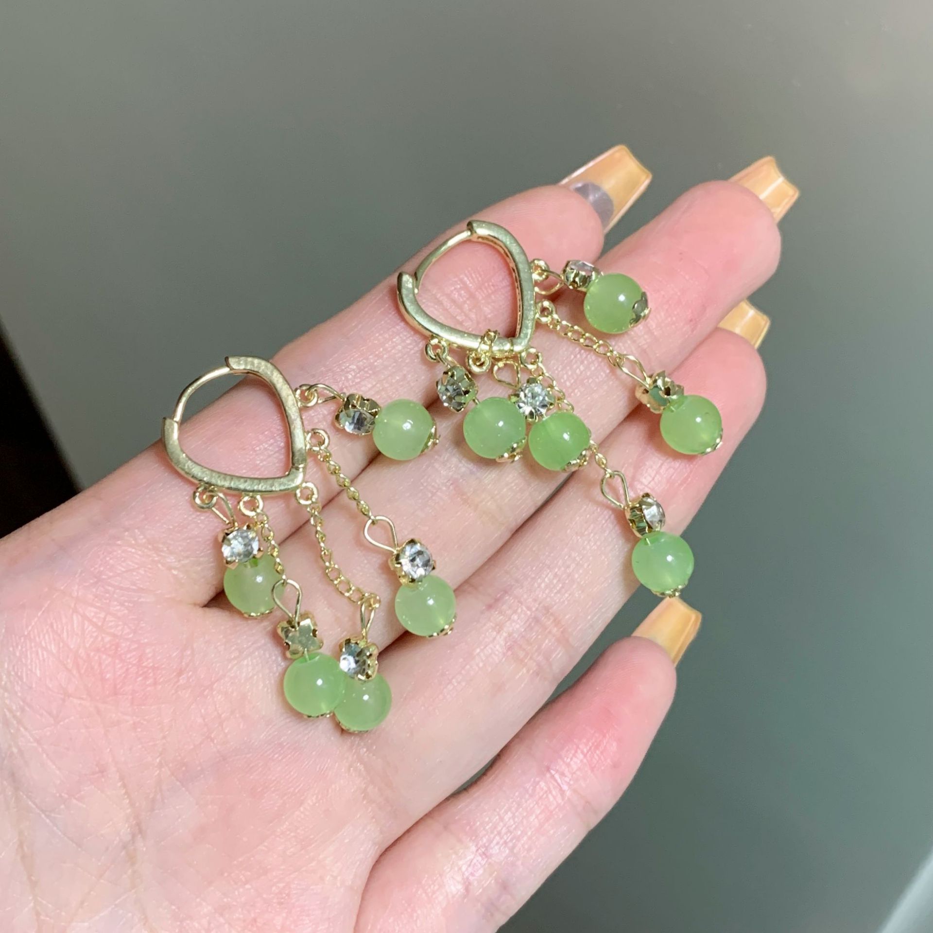八面玲珑祖母绿猫眼石爱心耳扣2024新款镶钻流苏耳坠气质古风耳环