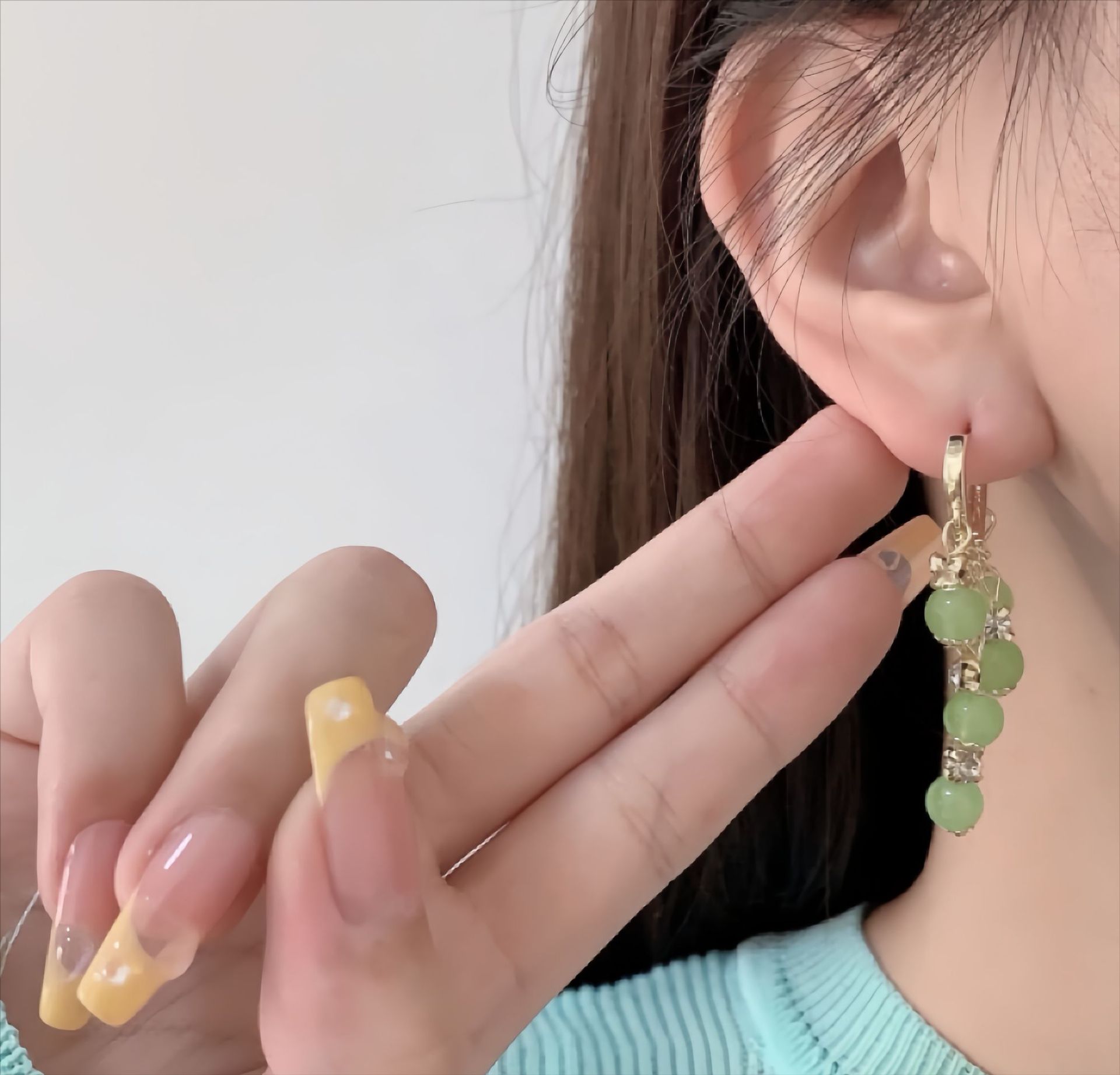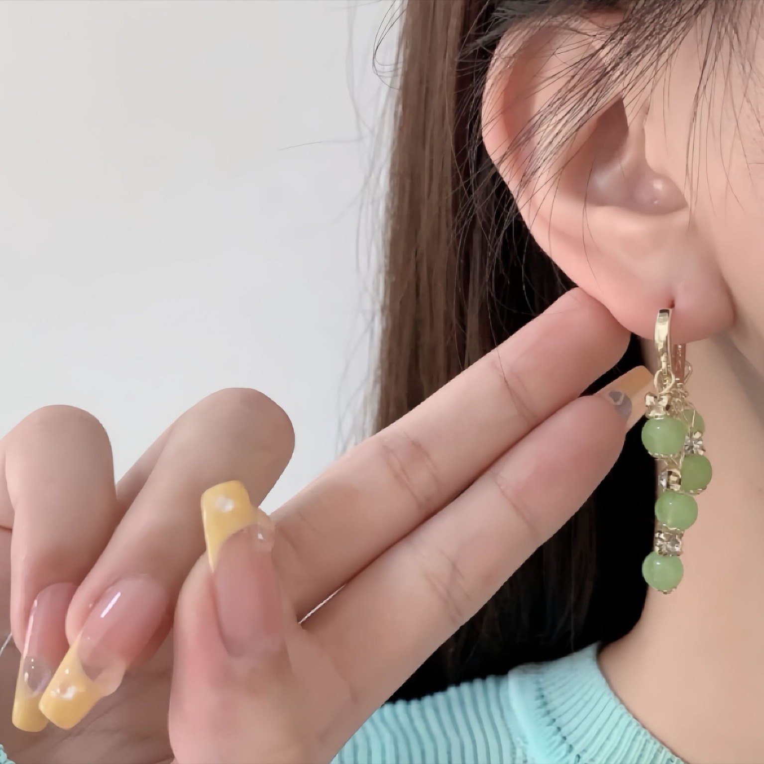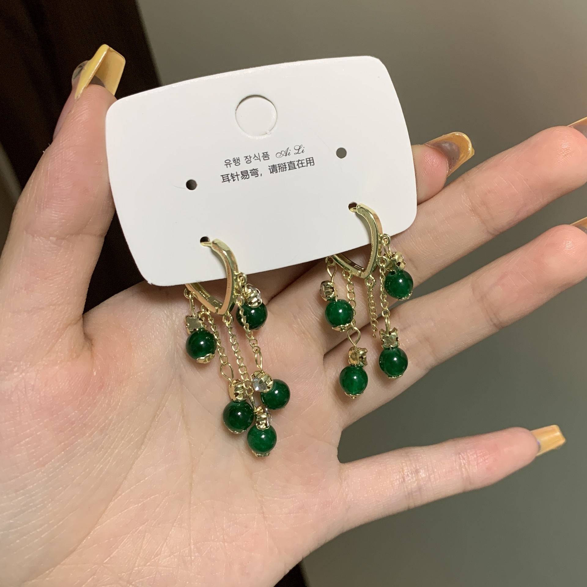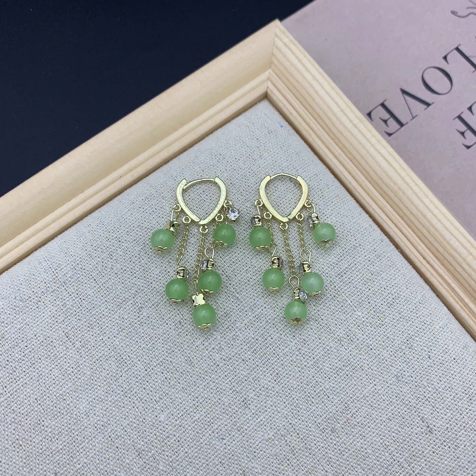 八面玲珑祖母绿猫眼石爱心耳扣2024新款镶钻流苏耳坠气质古风耳环