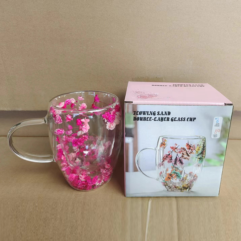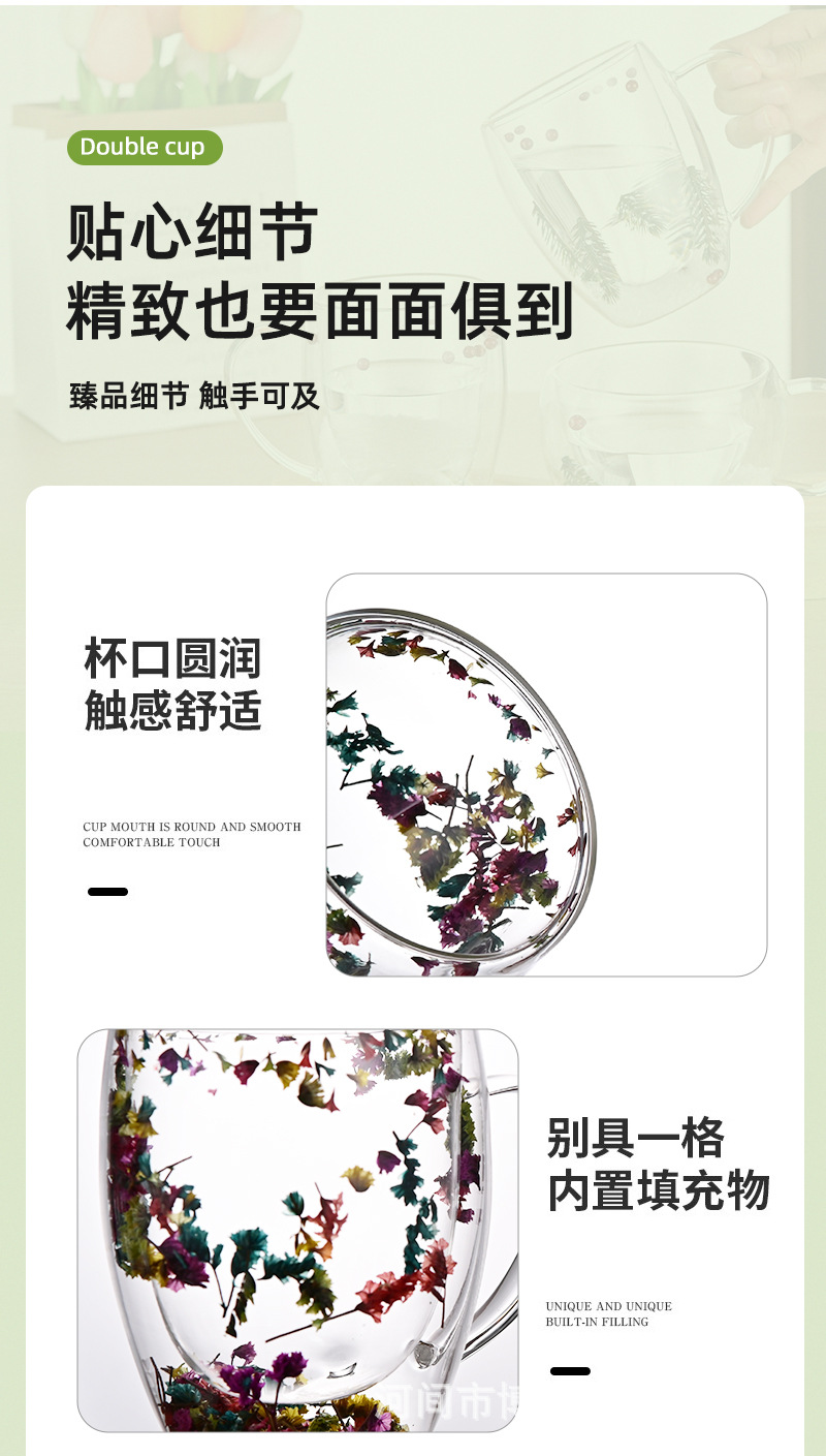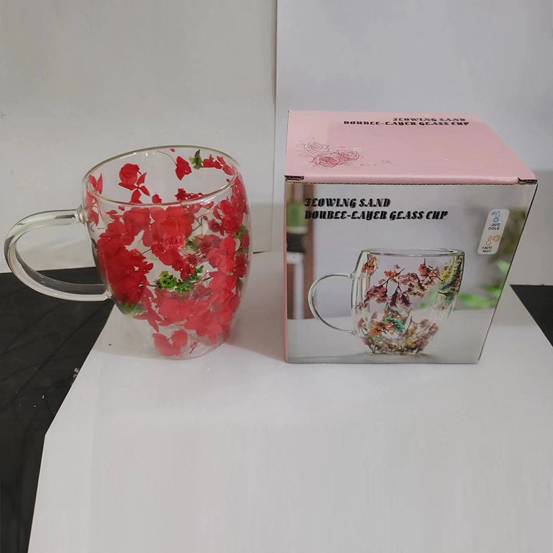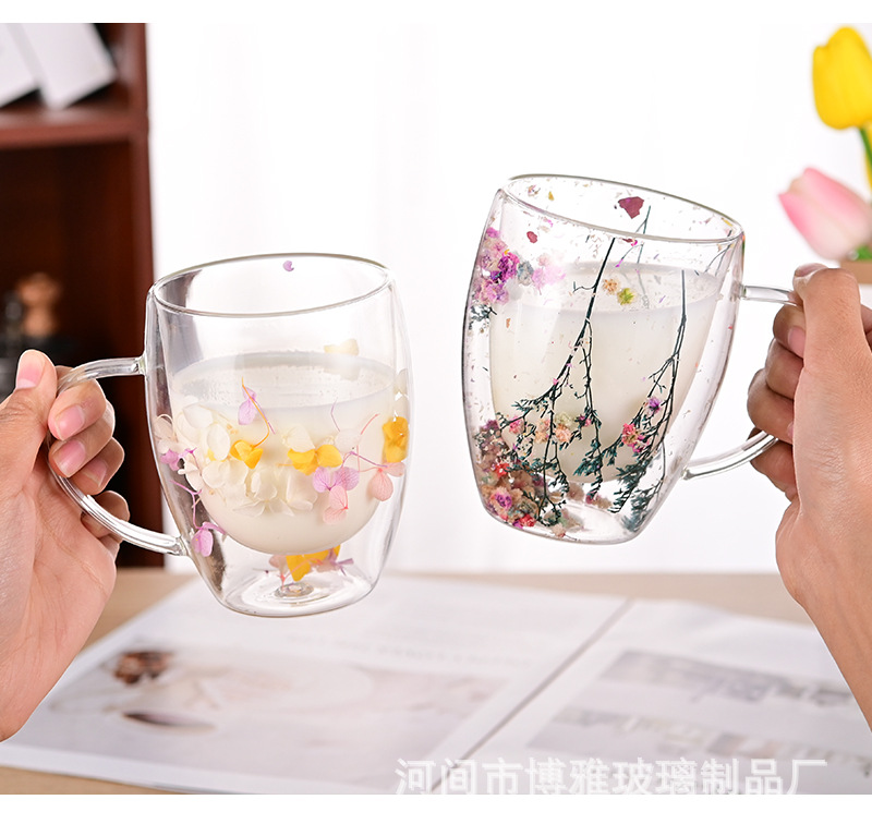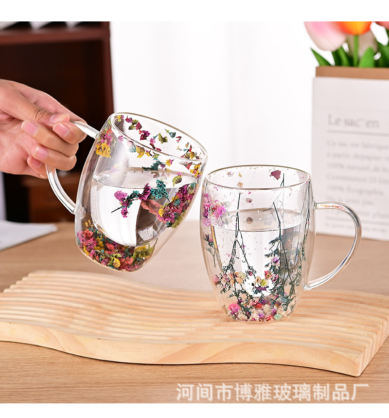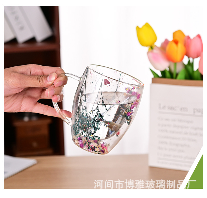双层玻璃杯真花杯高颜值水杯家用带把手茶杯玻璃杯子批发耐高温